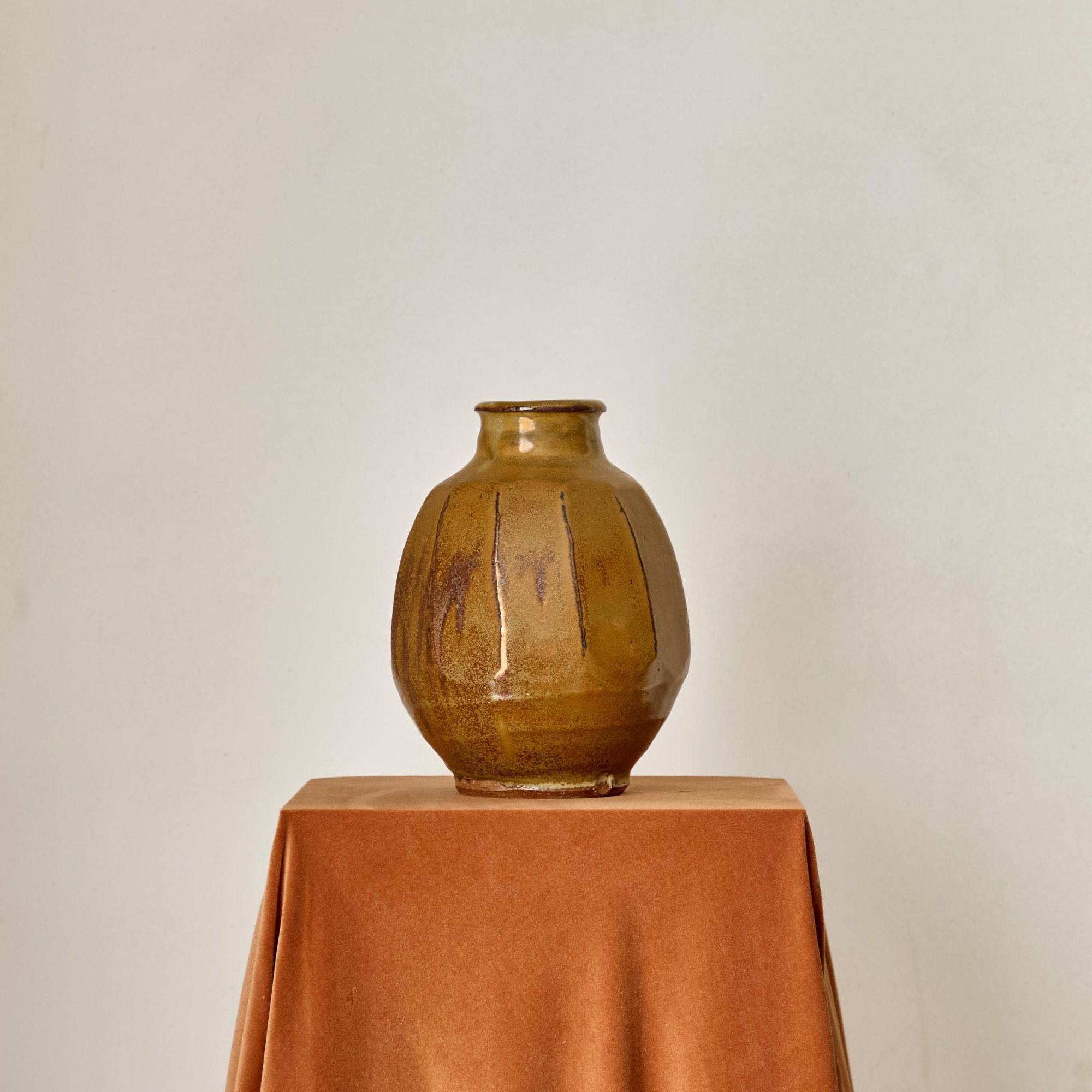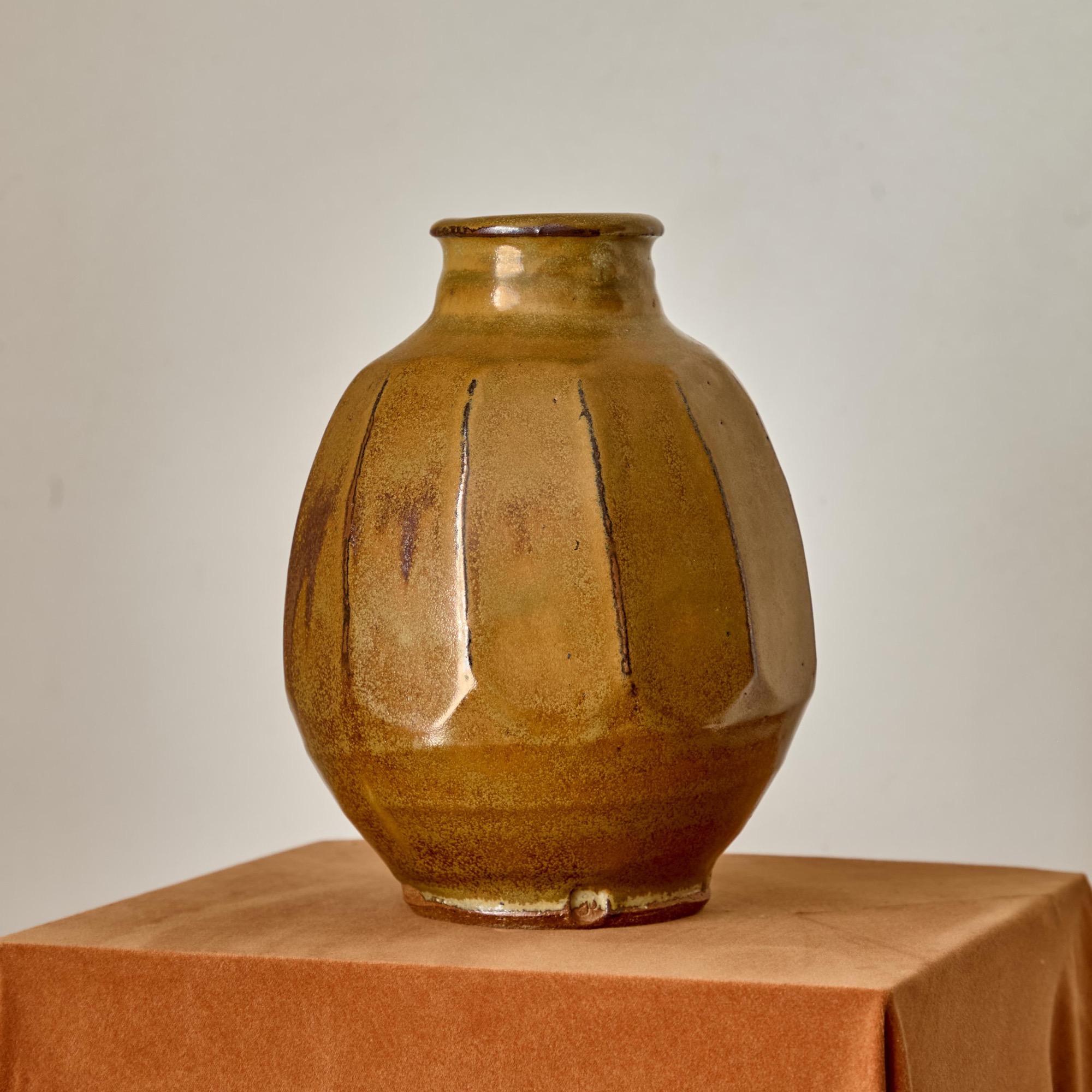With an ochre glaze over tenmoku traces. Impressed potter's seal.