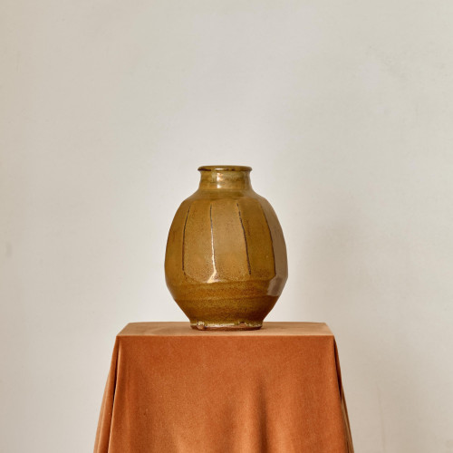 The conical form with a narrow neck and a handle, all with an iridescent glaze decorated with a Clematis motif and signed.