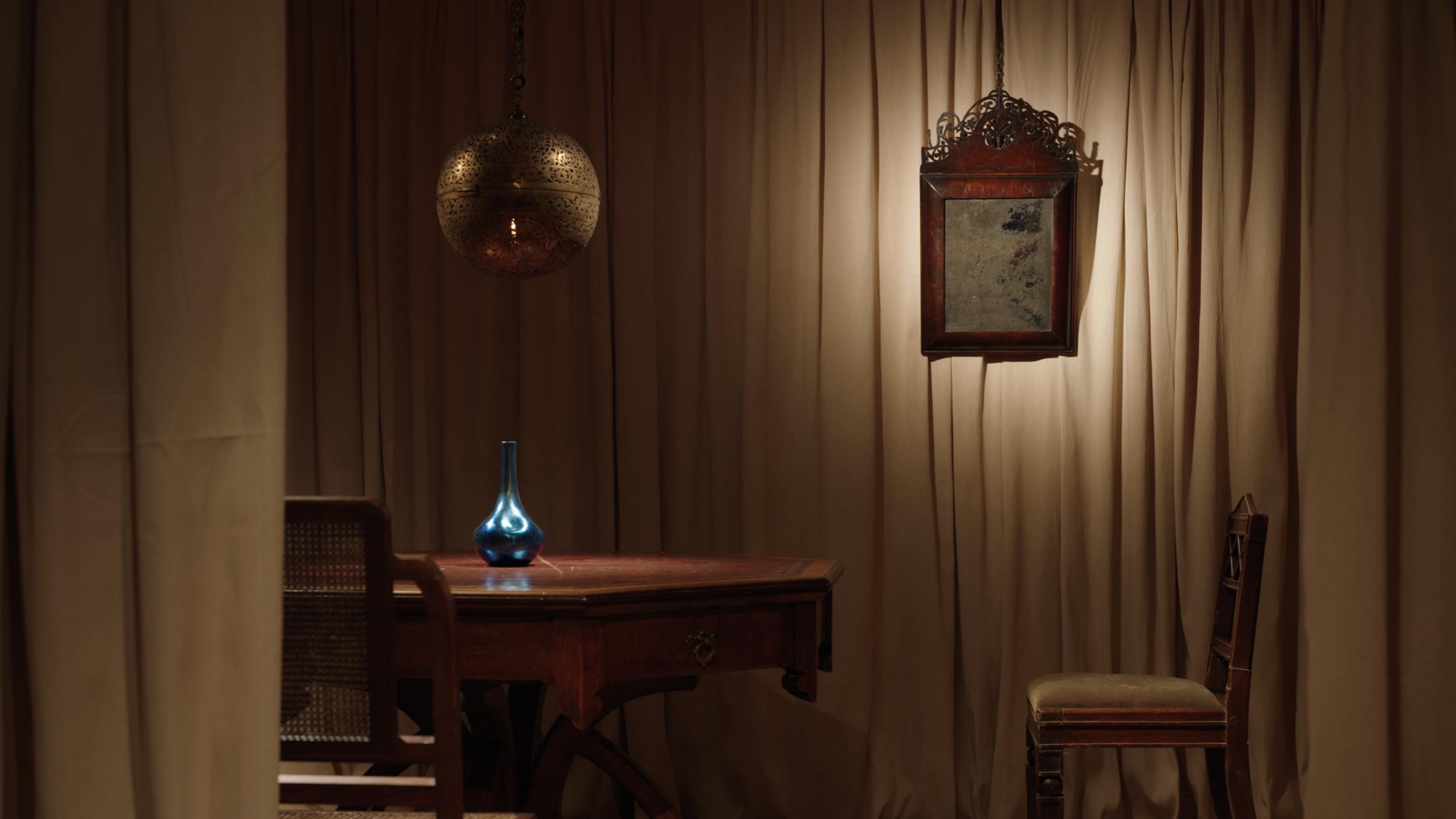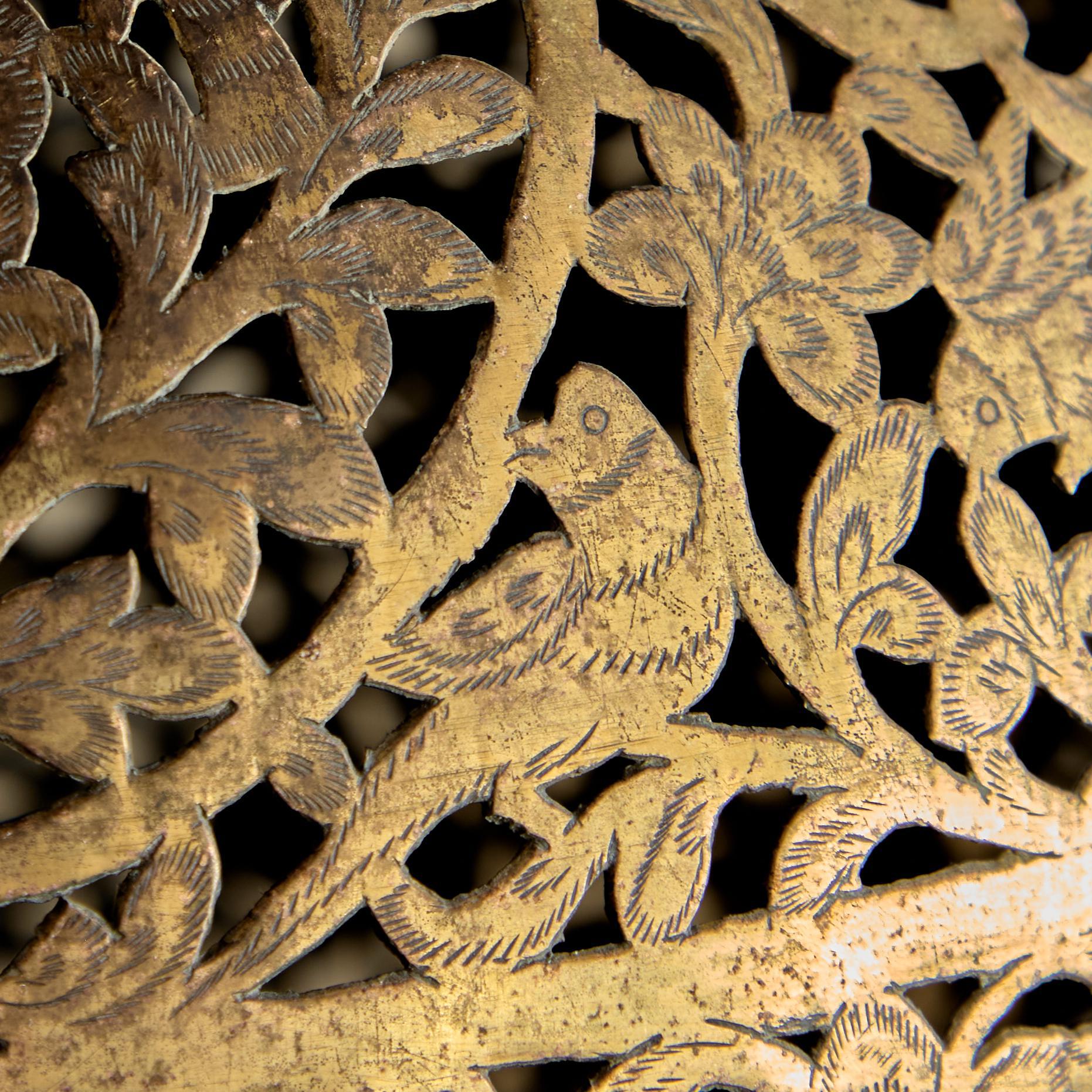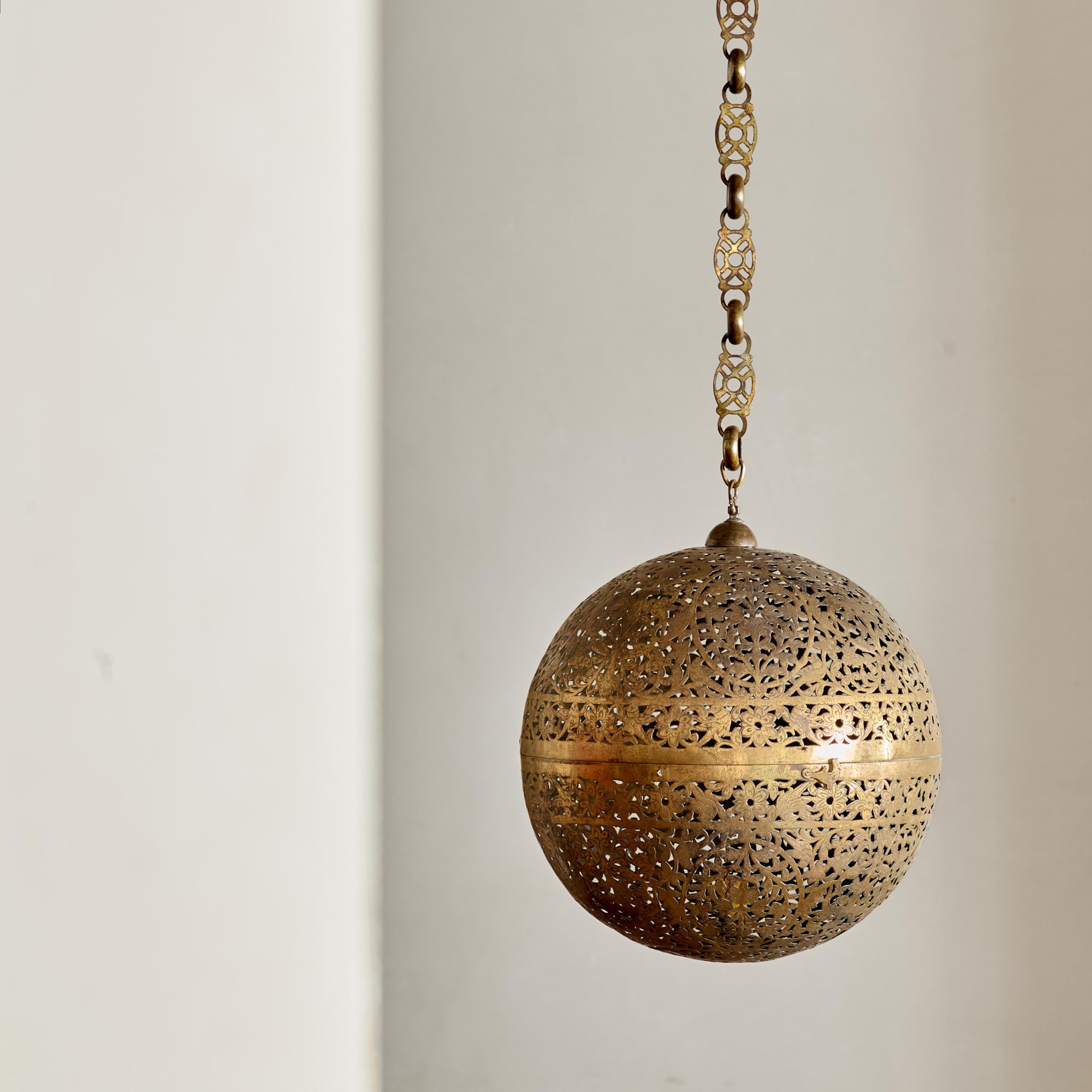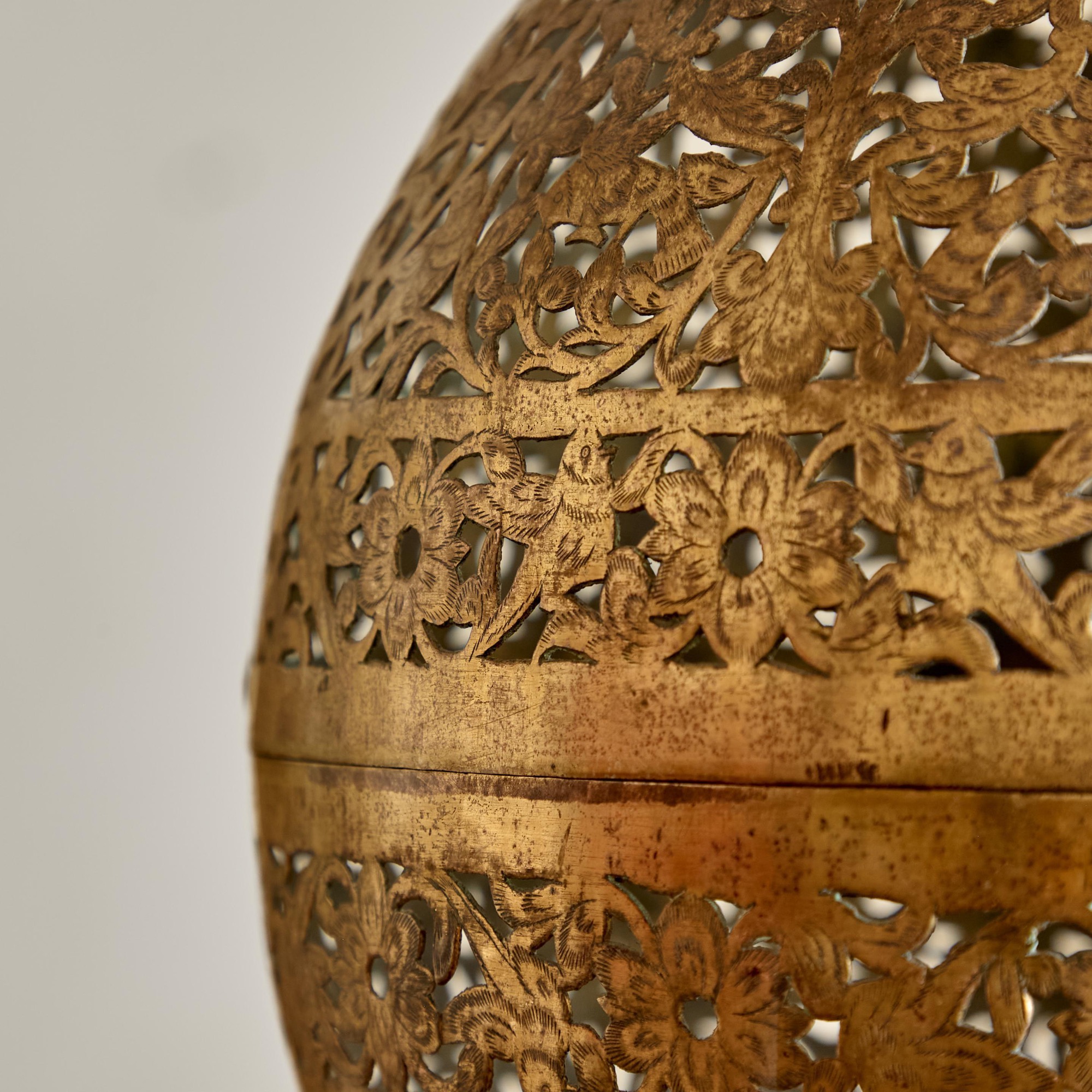 The hinged brass sphere with all over pierced and incised floral and bird decoration with the original pierced chain.
