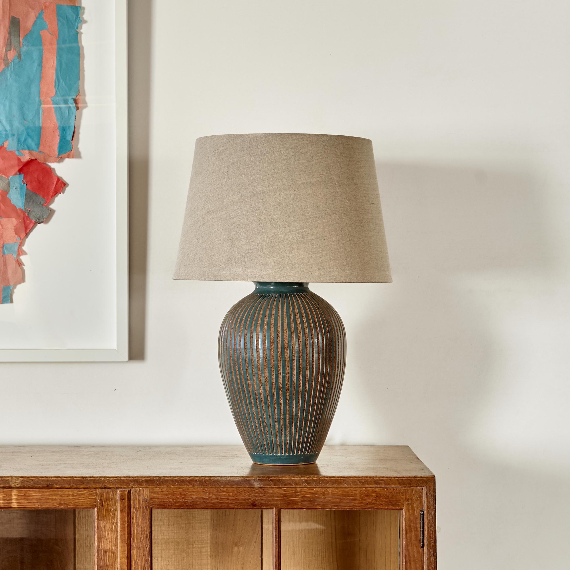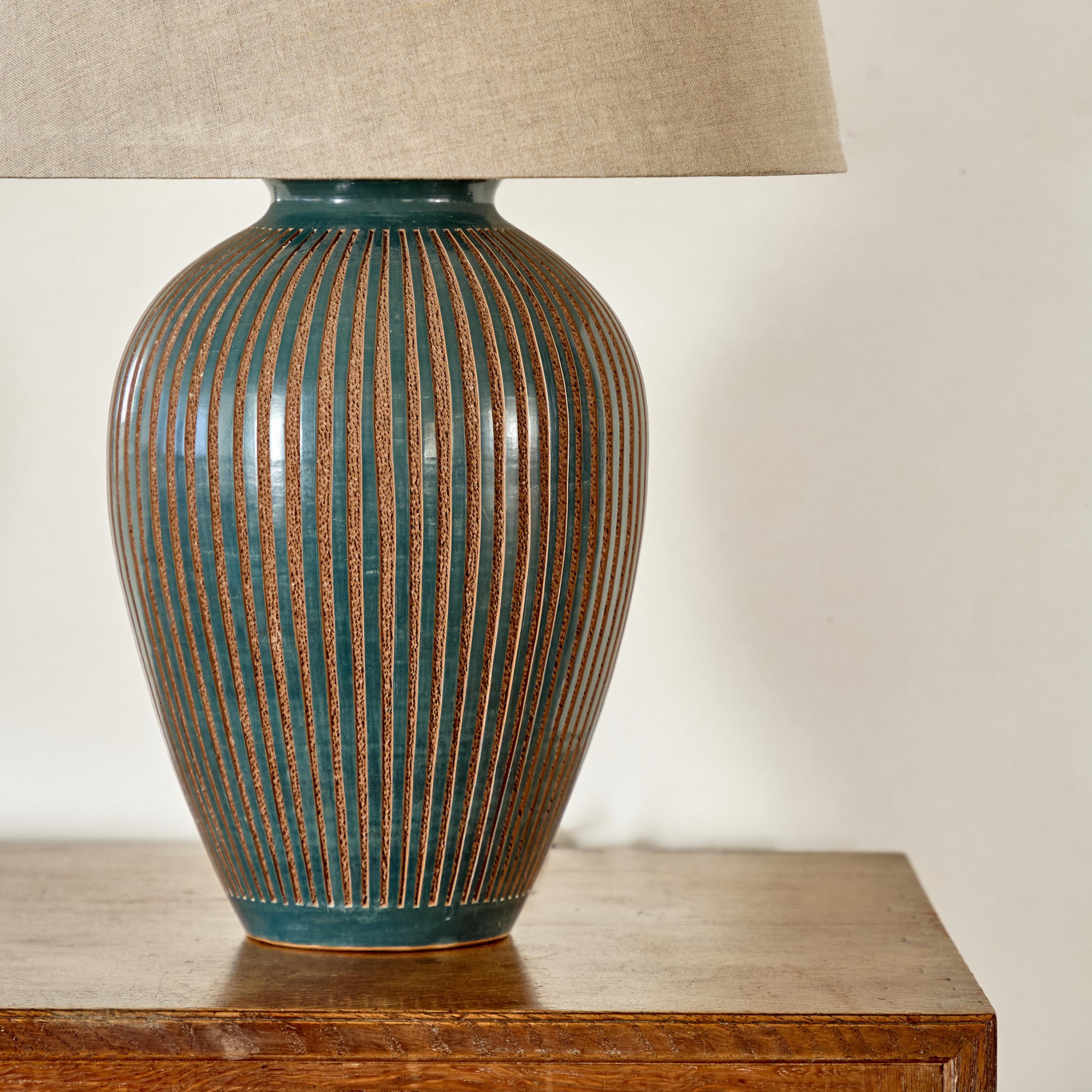 The green vase with incised textured decoration, impressed potter's seal to base. Converted to a lamp.