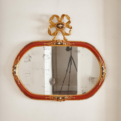 The later convex glass set in a giltwood frame with an inset border of scrolled paper decoration.