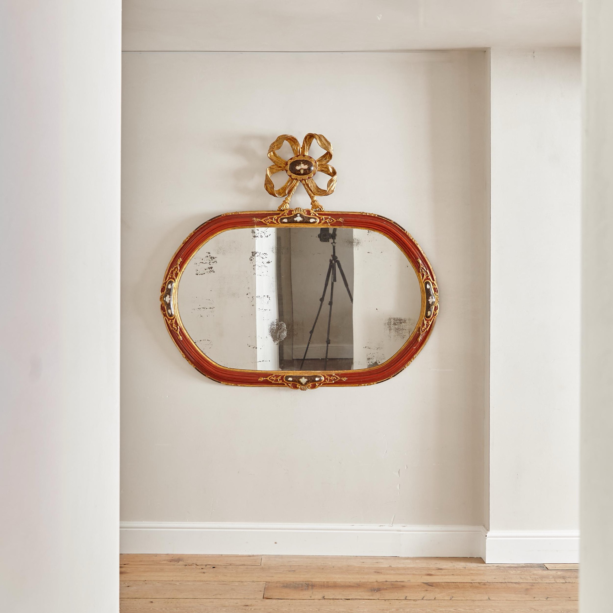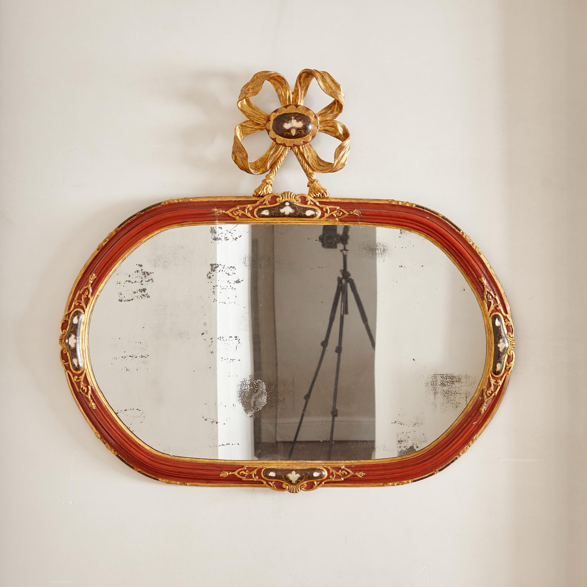 The oval plate set into a red-japanned and parcel gilt moulded frame with reserves inlaid with mother of pearl. Surmounted by a carved and gilded bow with an ebonised central reserve with mother of pearl inlay.