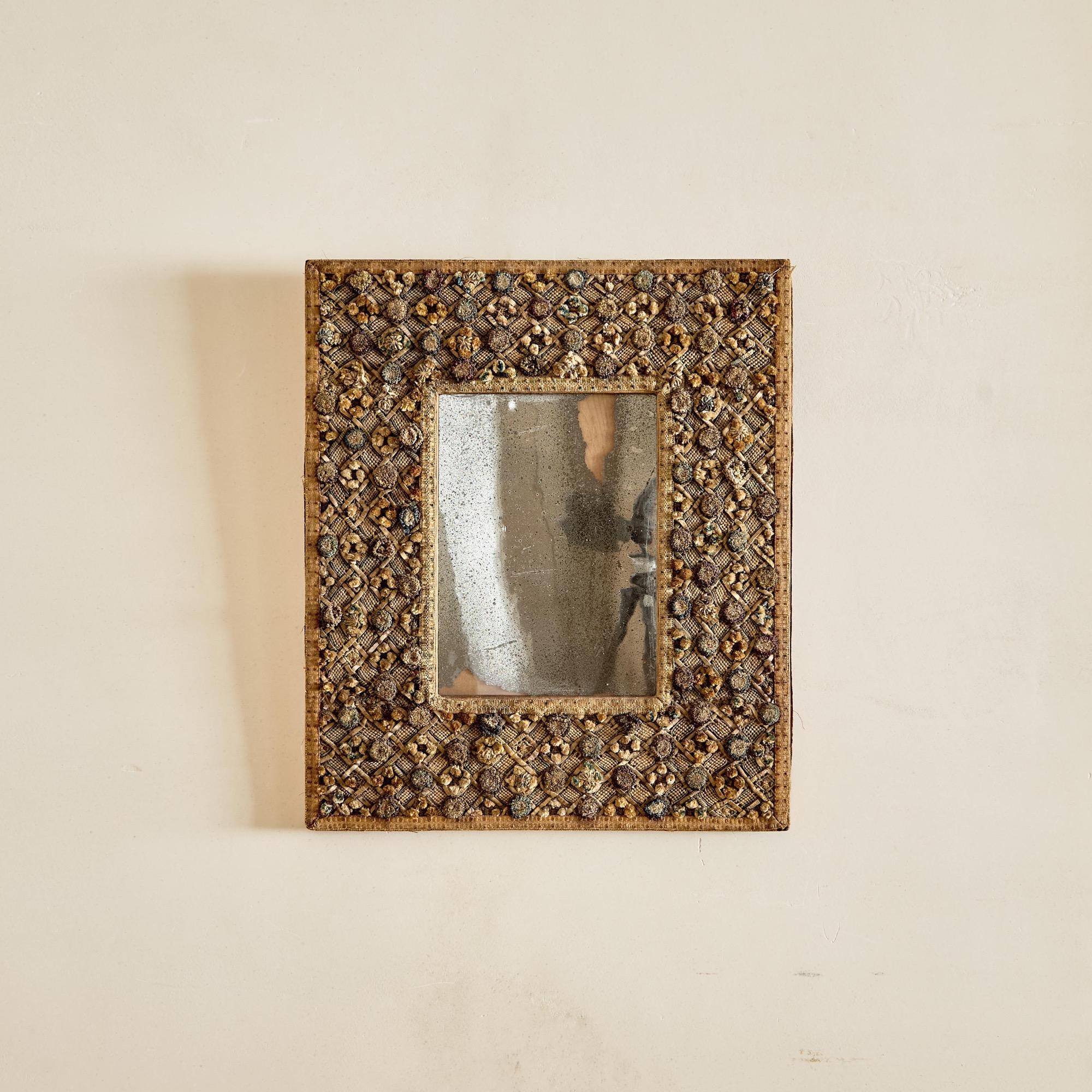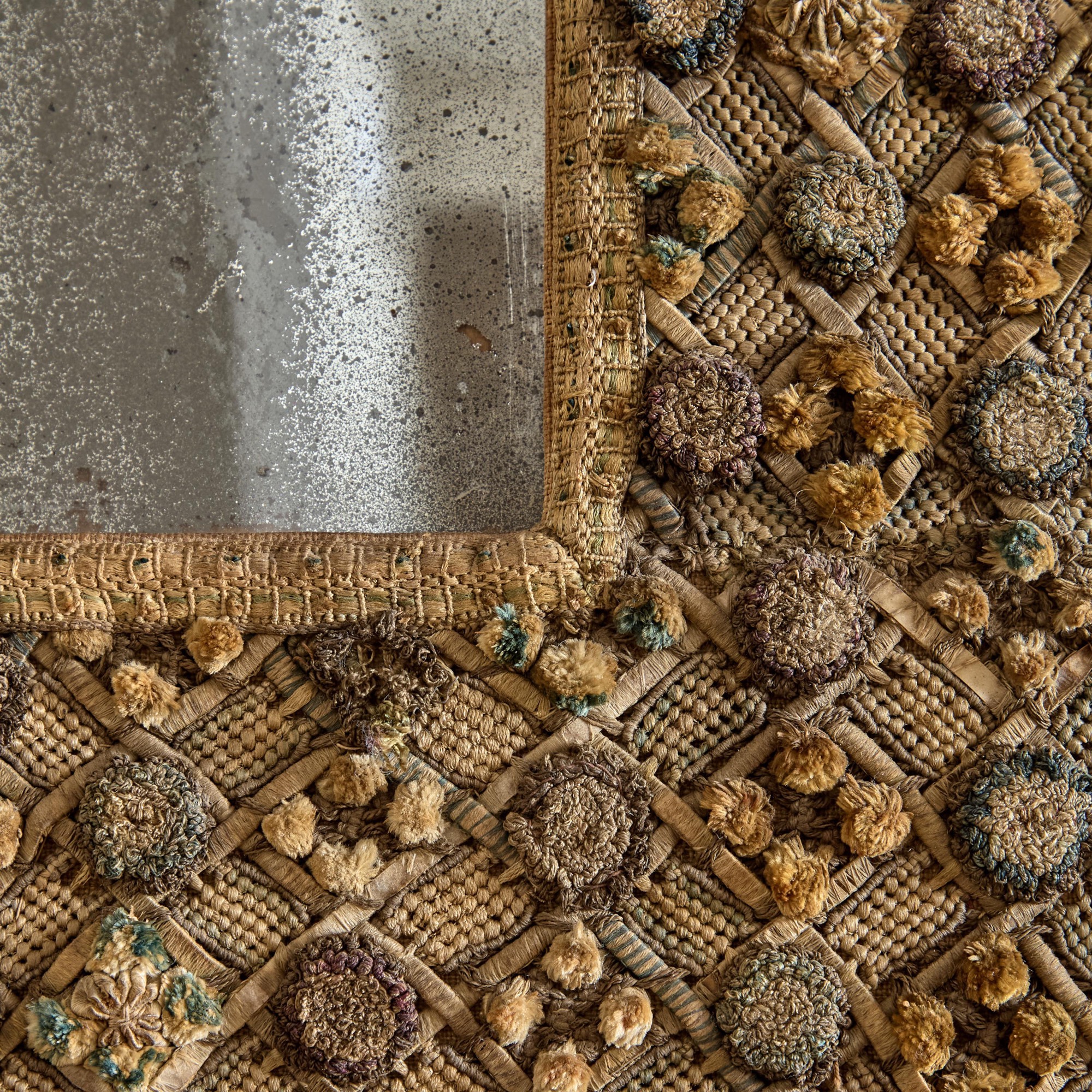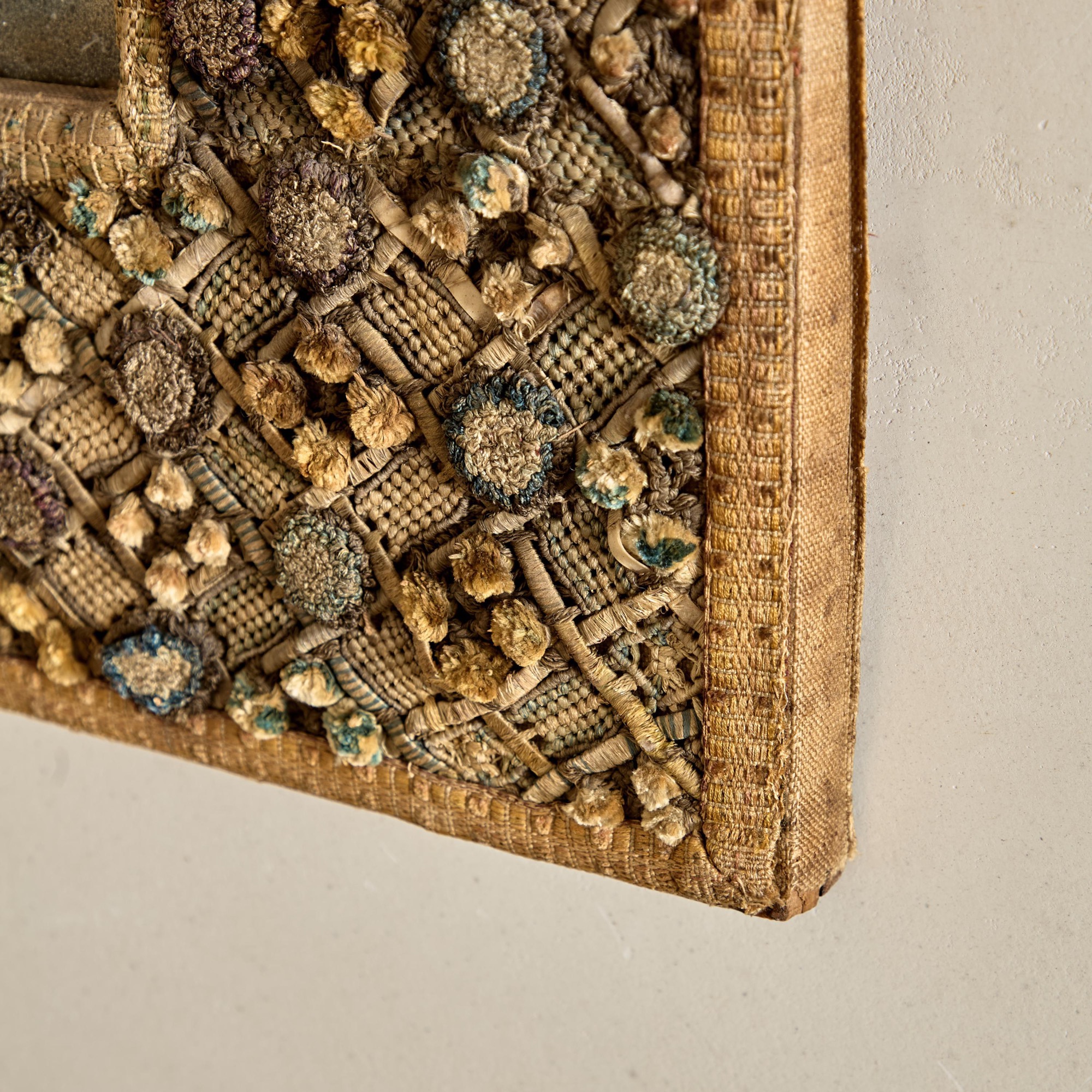 A Charles II embroidered wool and raised work framed mirror