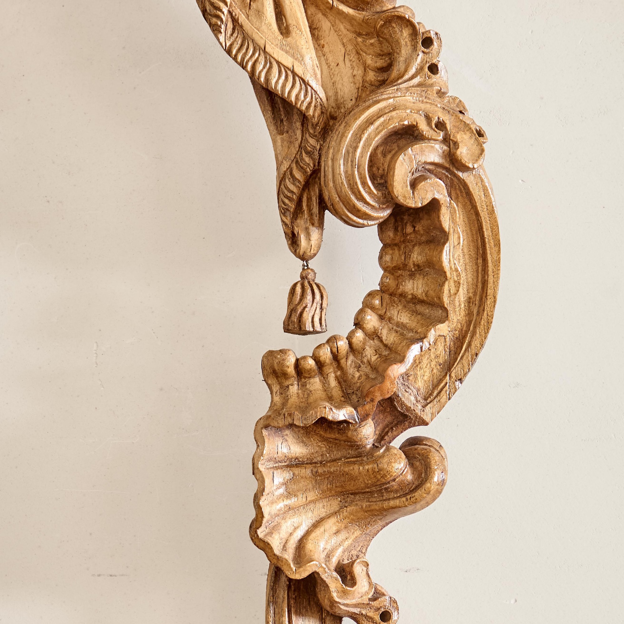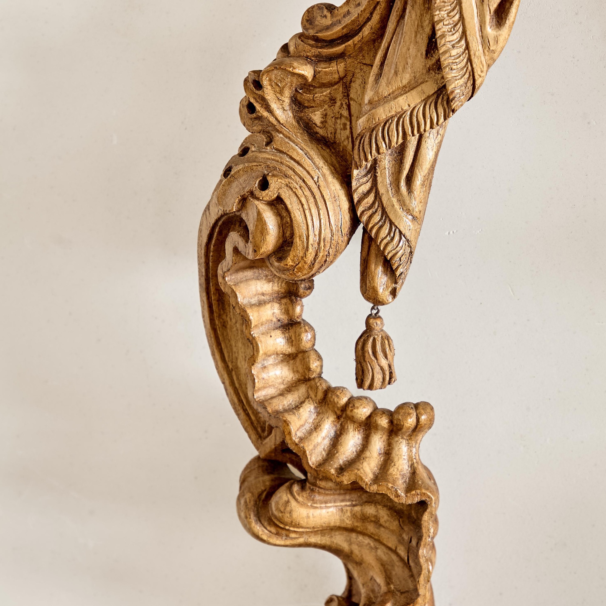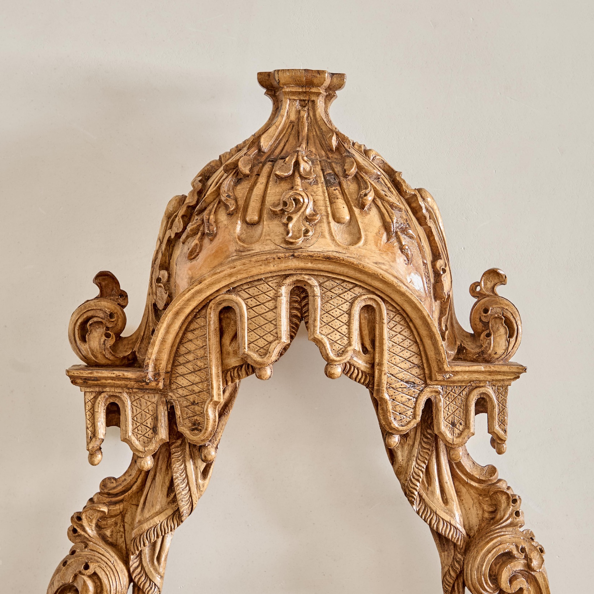 With a carved, arched lambrequin canopy above tasselled curtains flanked by elaborately carved C-scrolls.