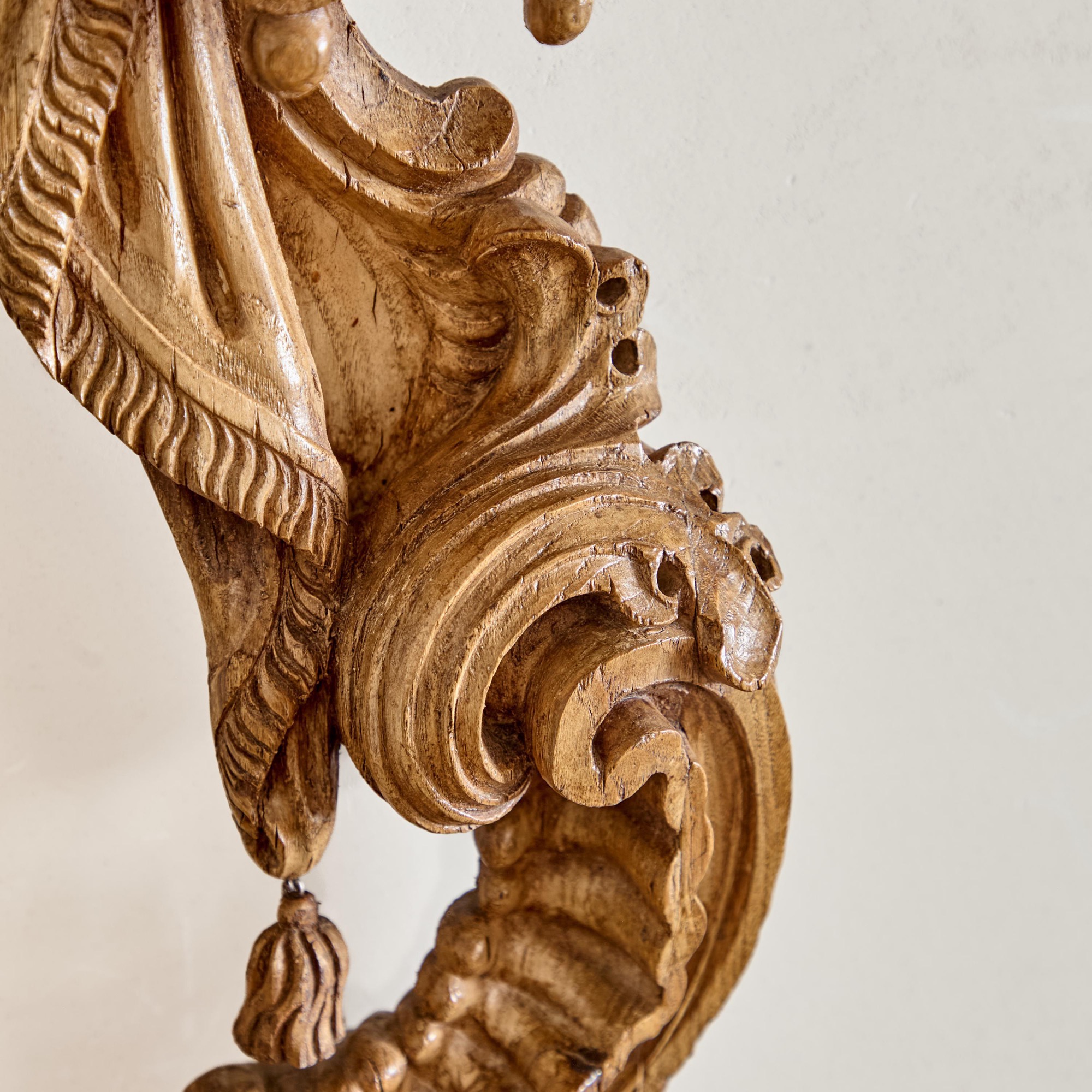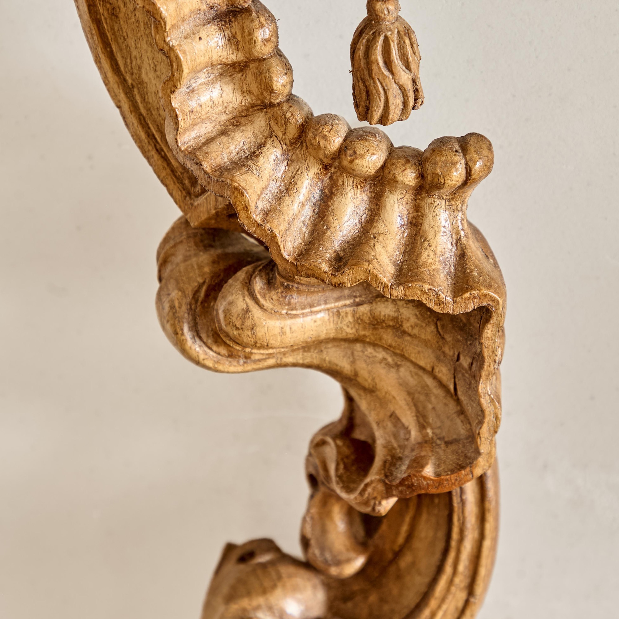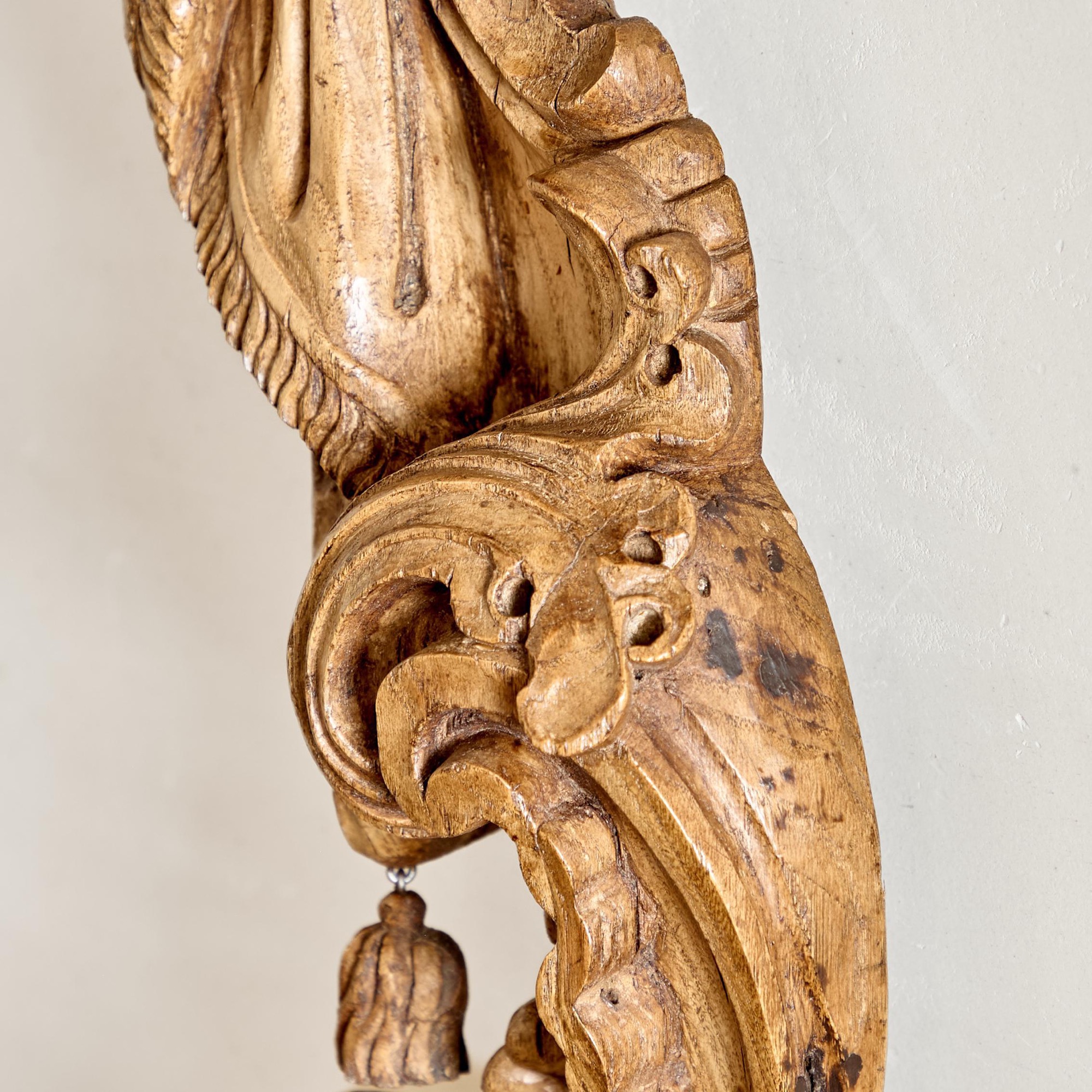 With a carved, arched lambrequin canopy above tasselled curtains flanked by elaborately carved C-scrolls.