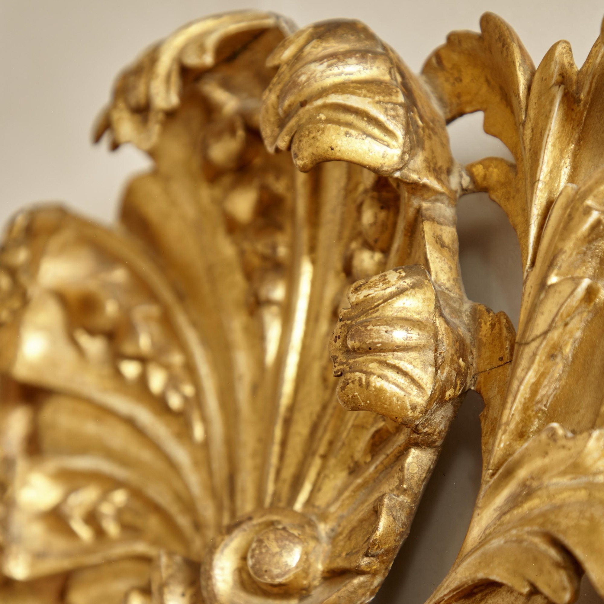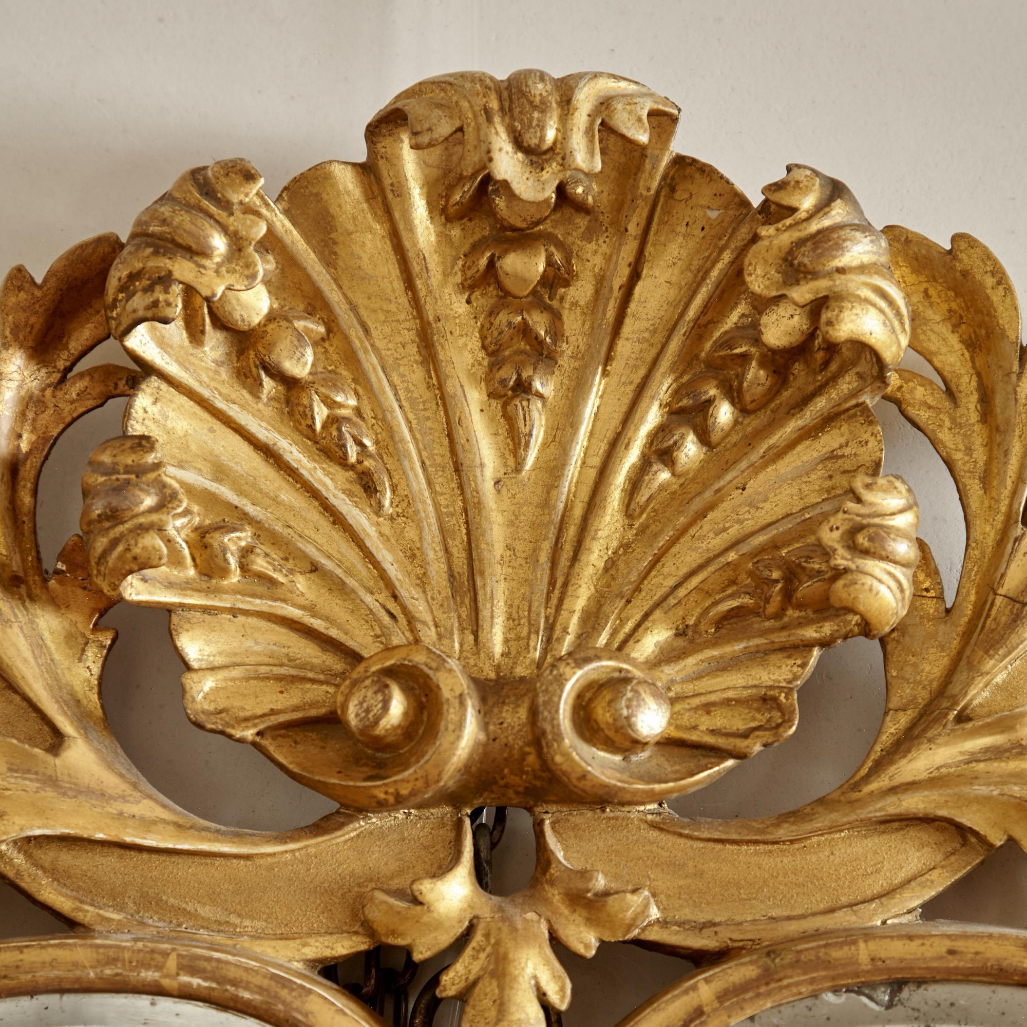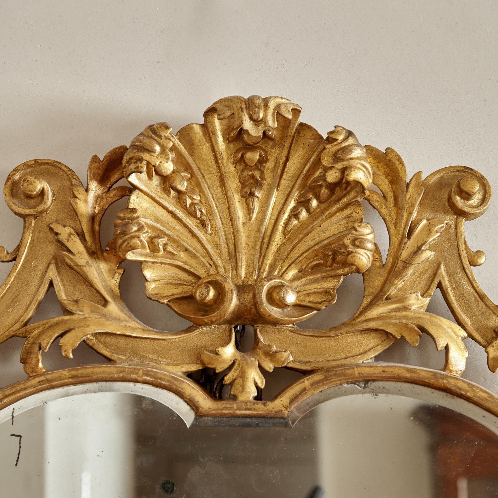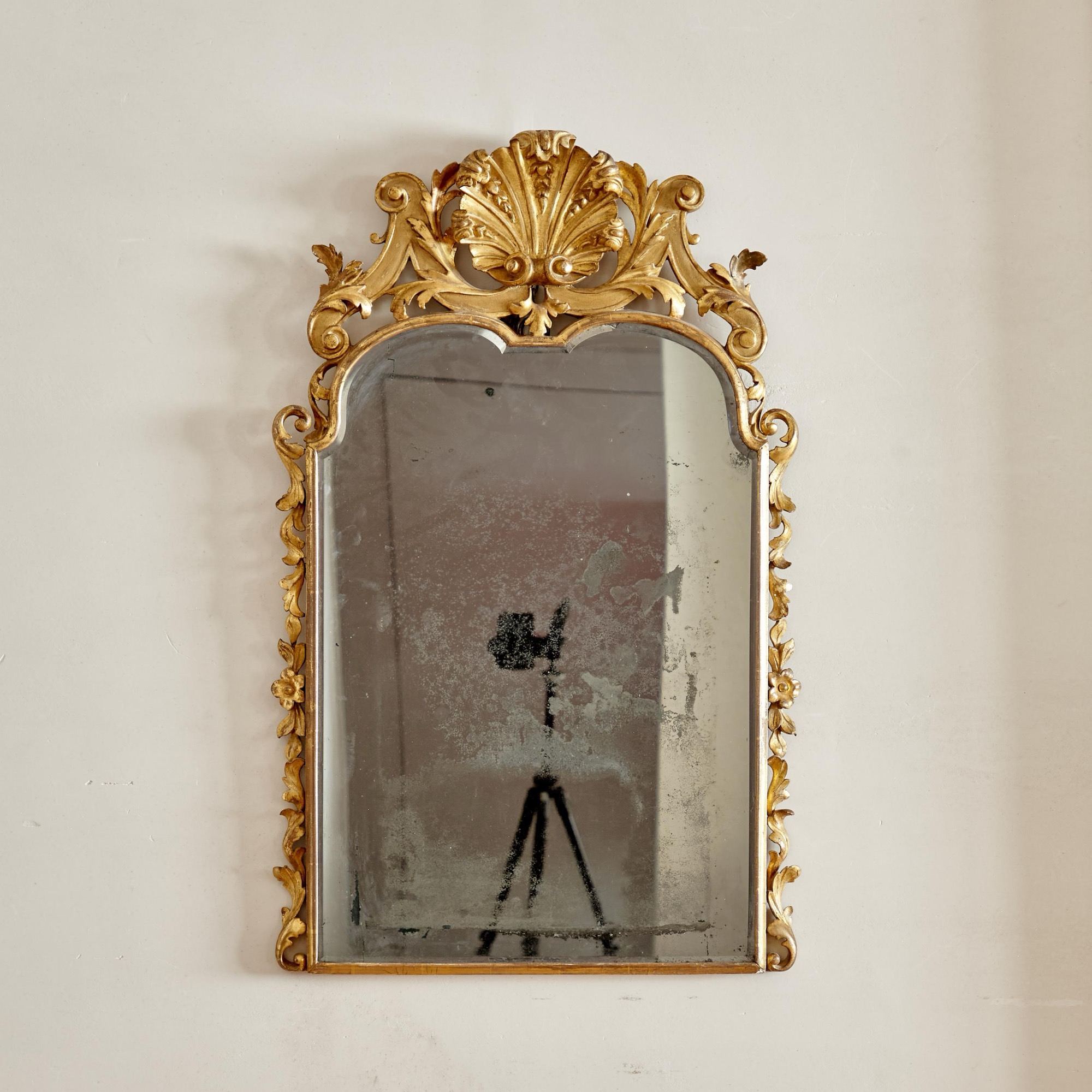 The original arched bevelled plate in a narrow gilded frame flanked by trailing carved leaves and flowers and surmounted by a central gilded scallop shell with scrolling strapwork and acanthus decoration.