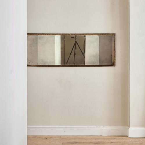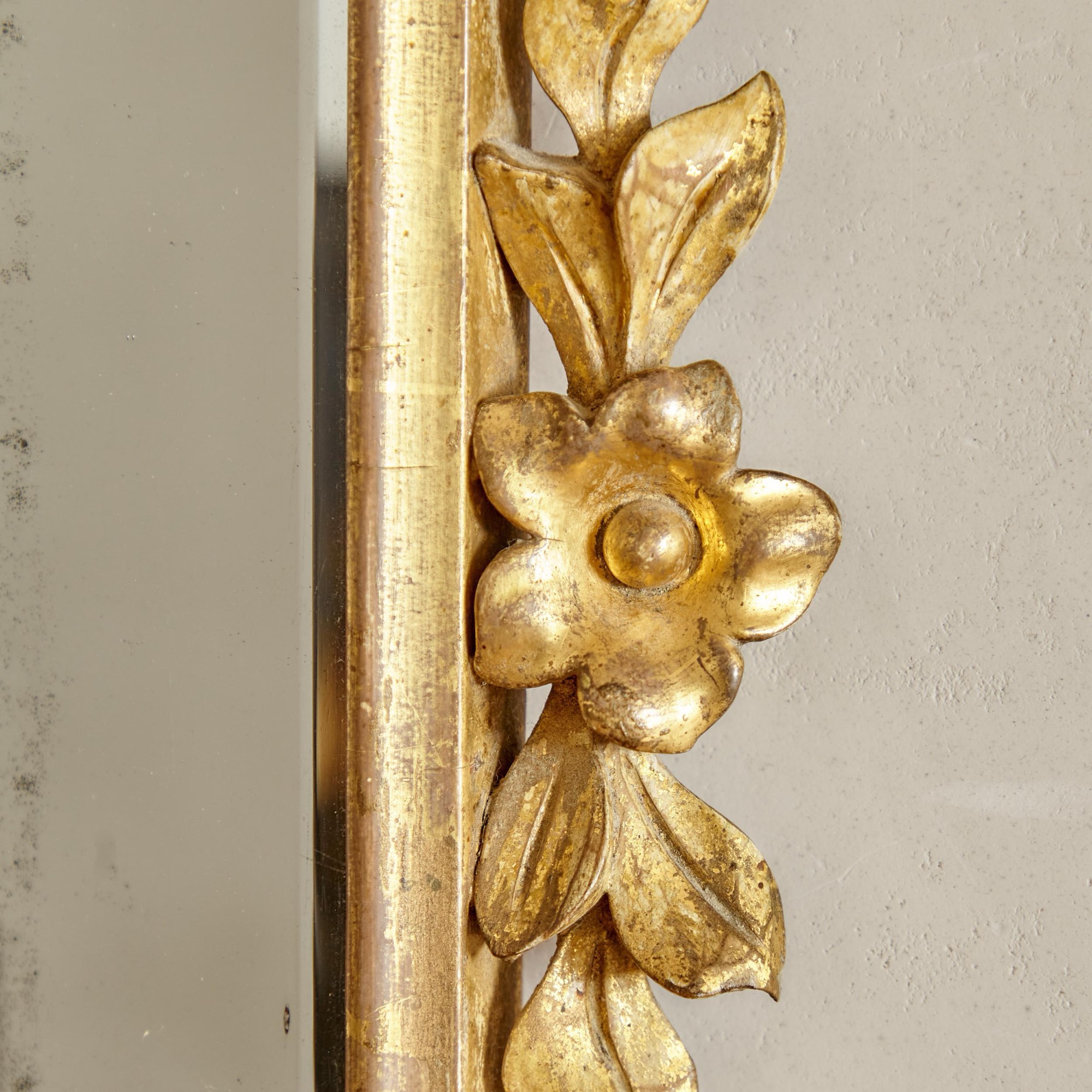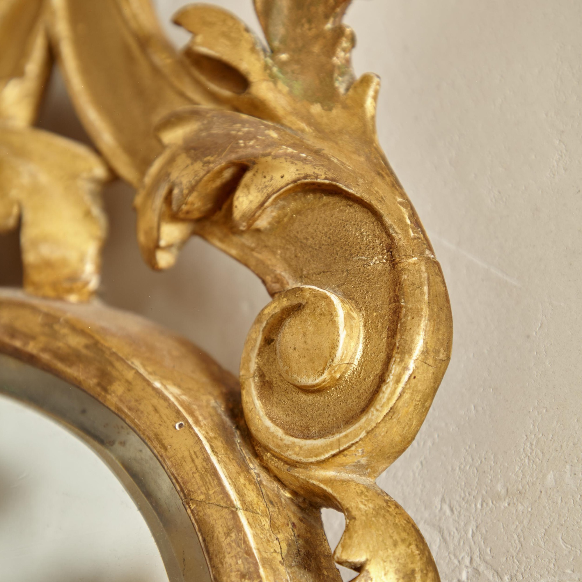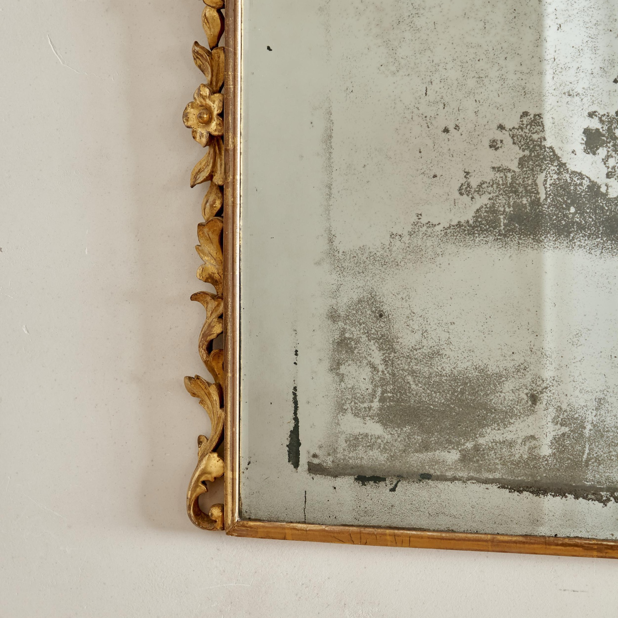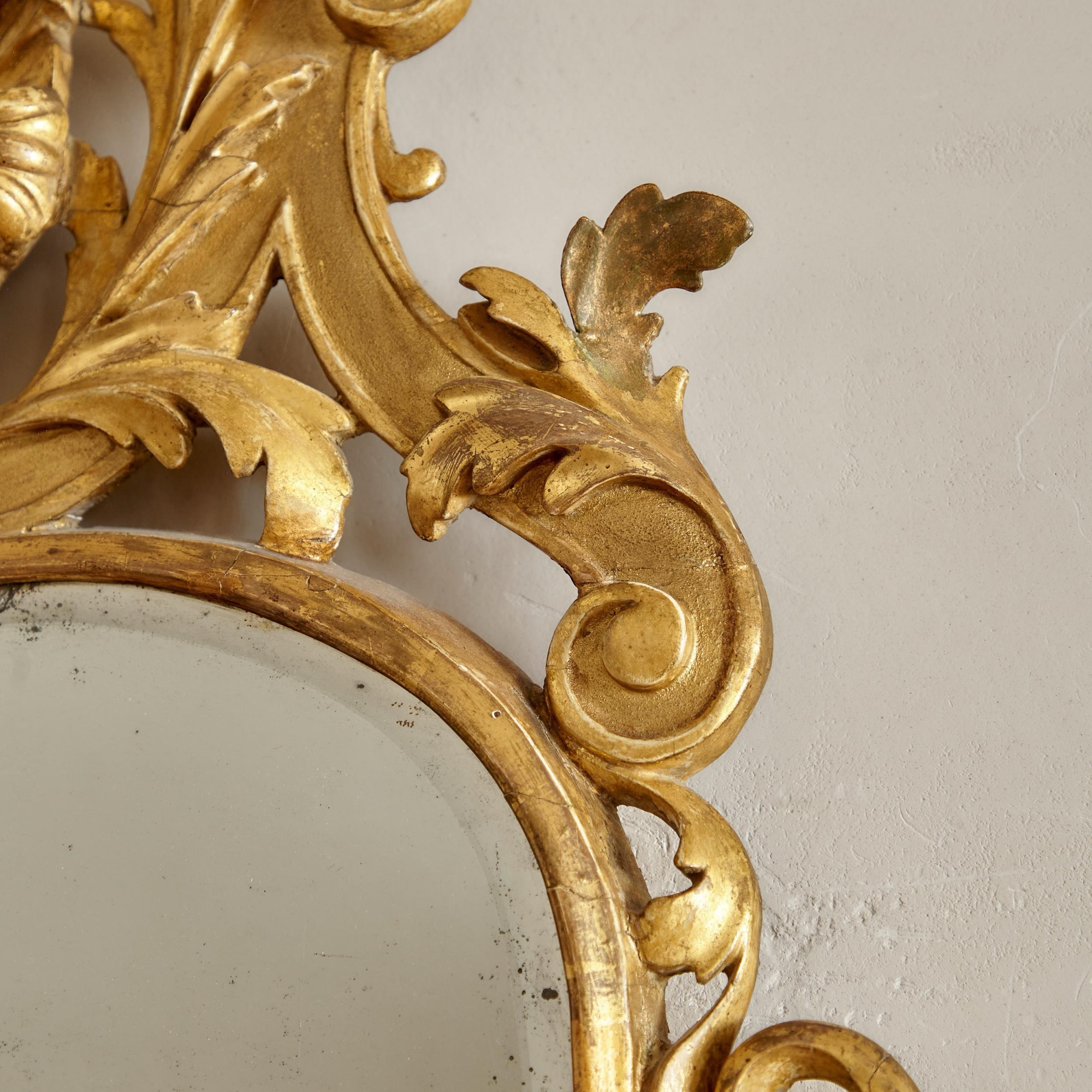 The original arched bevelled plate in a narrow gilded frame flanked by trailing carved leaves and flowers and surmounted by a central gilded scallop shell with scrolling strapwork and acanthus decoration.
