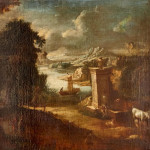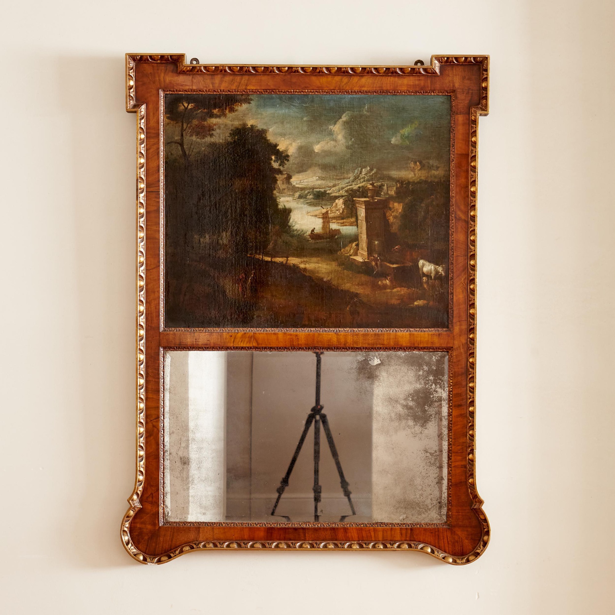 The walnut frame with a gilded egg and dart border enclosing the original rectangular mirror plate to the bottom below an 18th century oil on canvas depicting a romantic landscape.