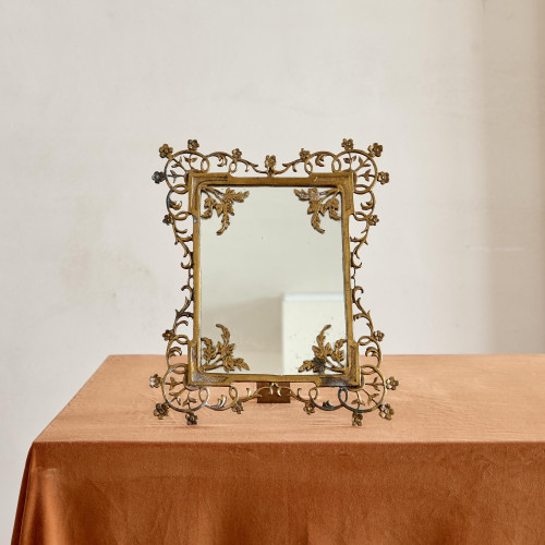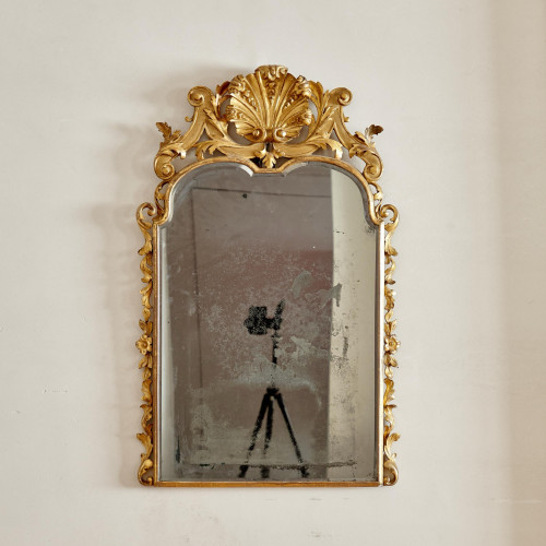 The rectangular mahogany and satinwood-banded frame with a pediment top enclosing the original split plate to the bottom below a painted tablet plate depicting Neptune riding a shell chariot, pulled by mythical sea horses.