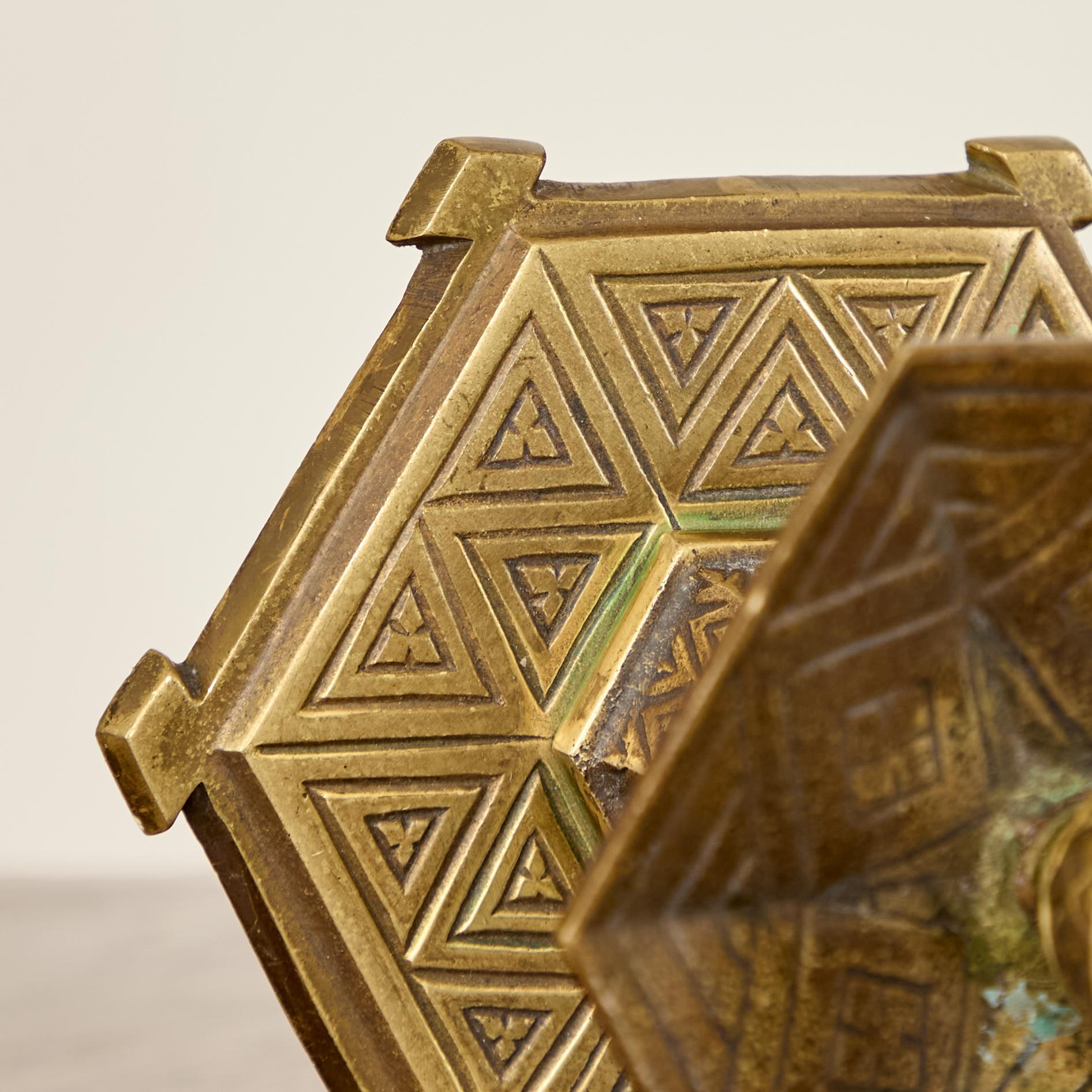 - A pair of hexagonal brass candlesticks with geometric decoration