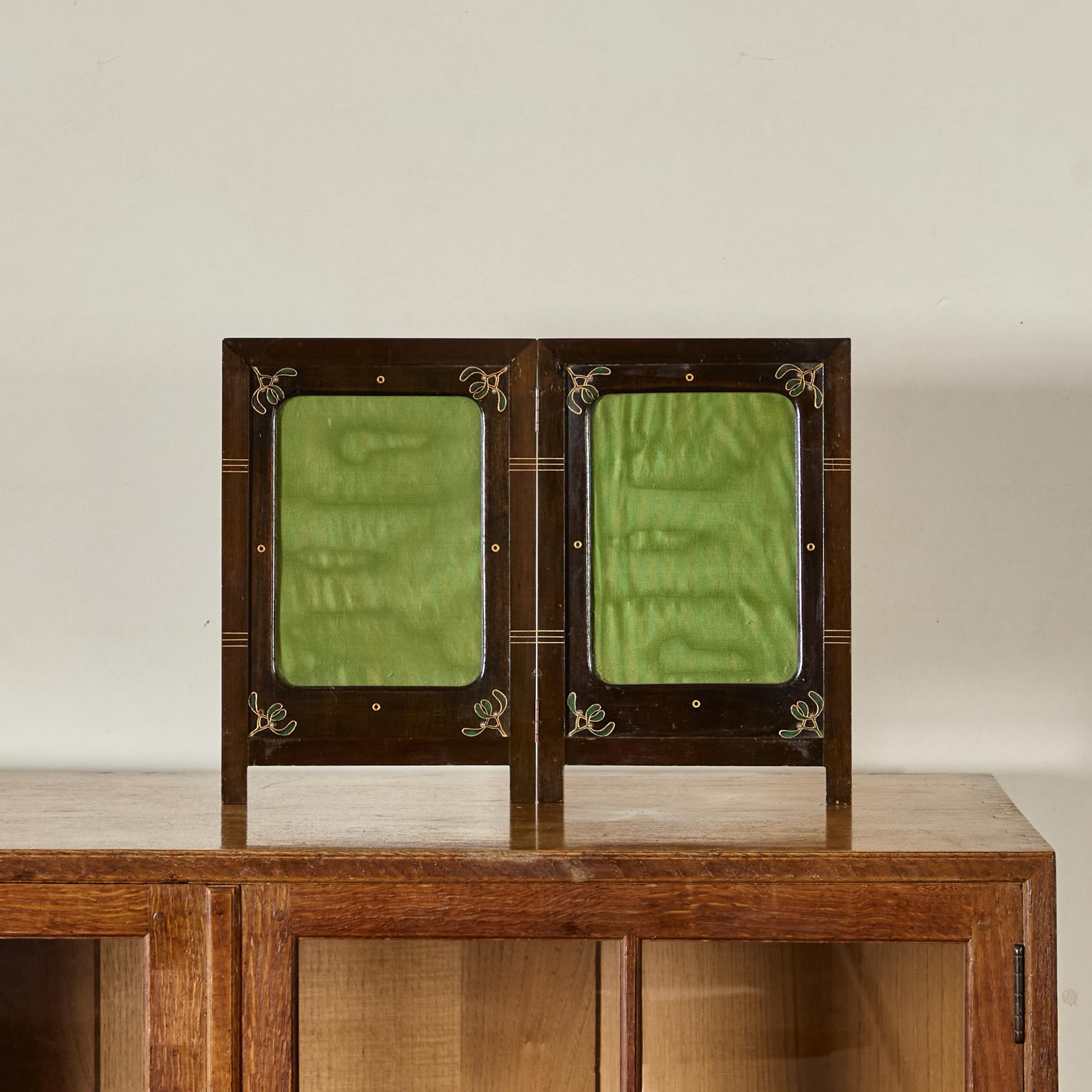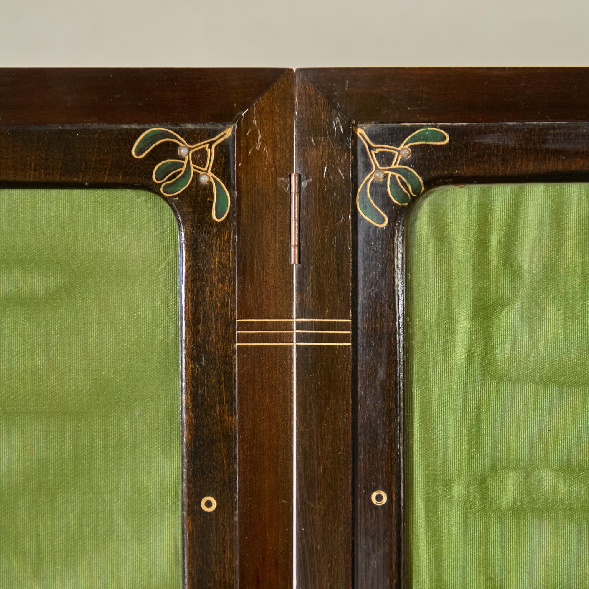 Comprising two hinged stained beech picture frames with incised and gilded mistletoe and line motifs with inset cabochon 'berries', and lined in the original green silk.