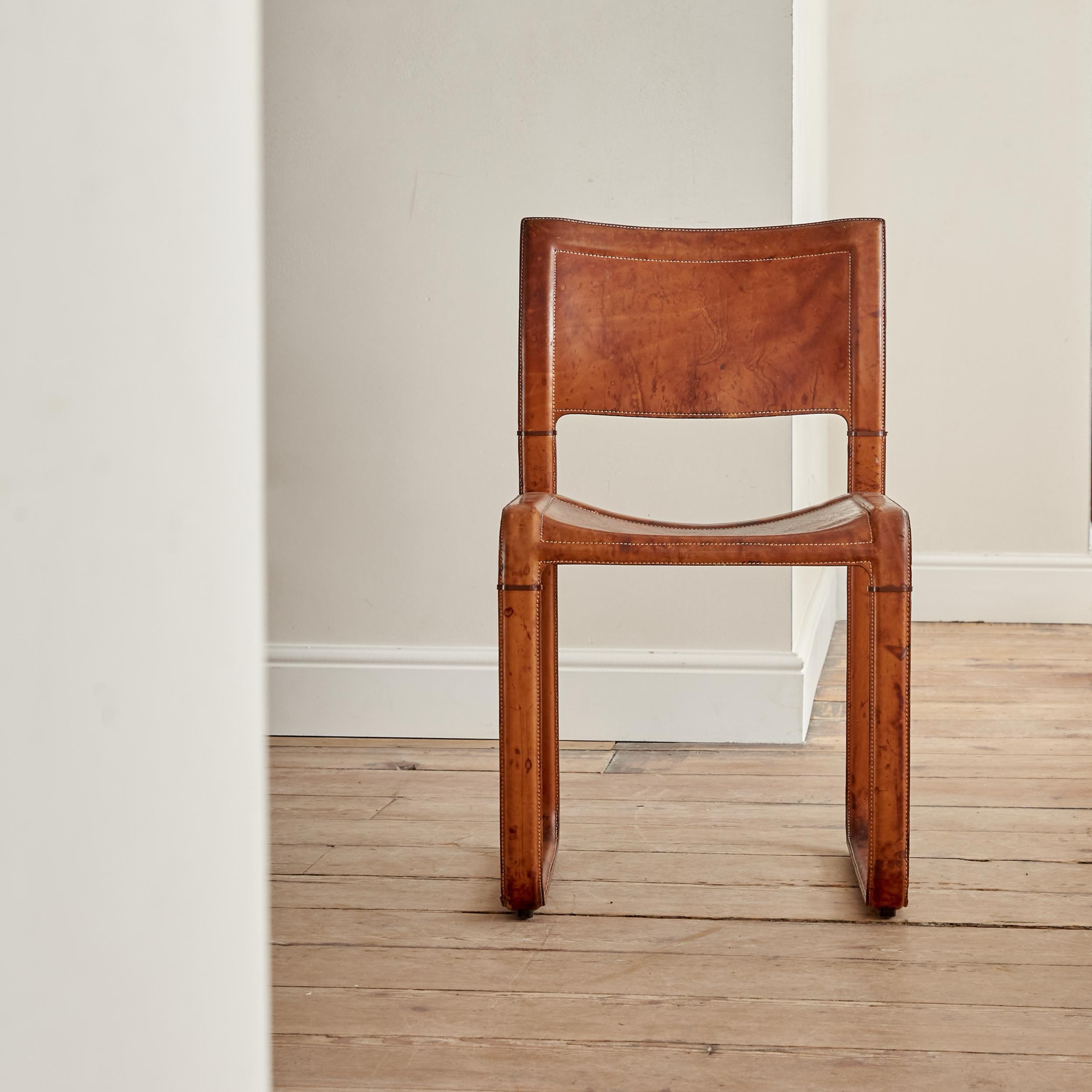 Each with the original patinated tan saddle-stitched leather covering the back, seat, and the continuous legs.