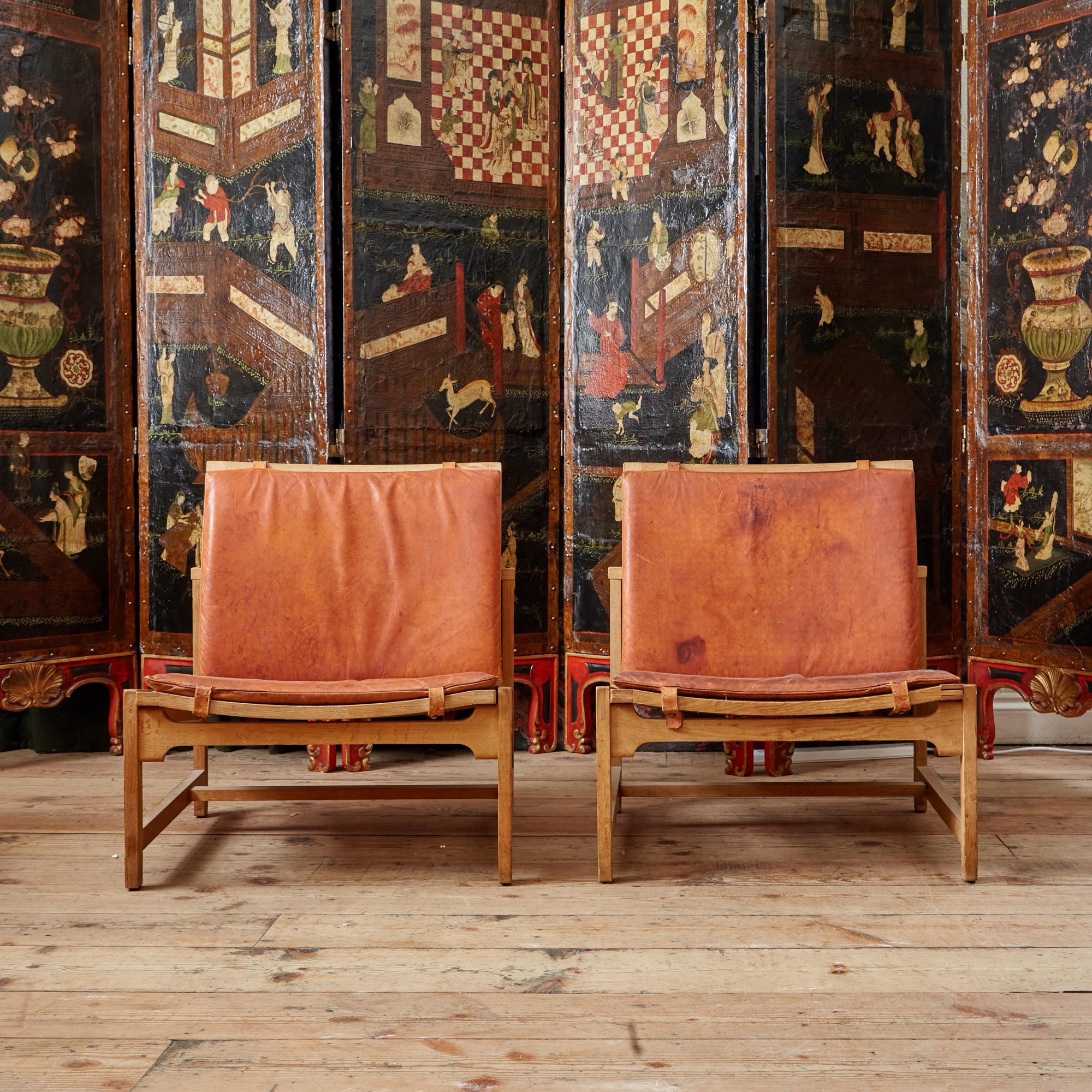 - A pair of "HK 13a" oak, caned and leather chairs and footstools by Peter Hjorth and Arne Karlsen