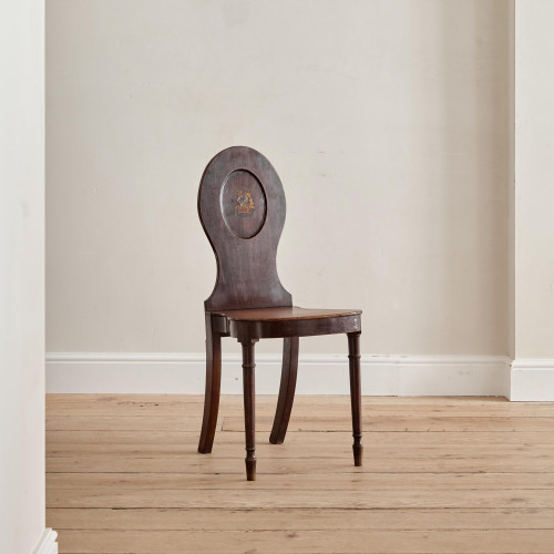 The cartouche shape back above a wide serpentine seat flanked by shaped arms and supported by four turned and fluted mahogany legs. Covered in a wonderful period Saint Cyr needlework, depicting lovers beneath a tree to the back and a deer and calf to the seat.