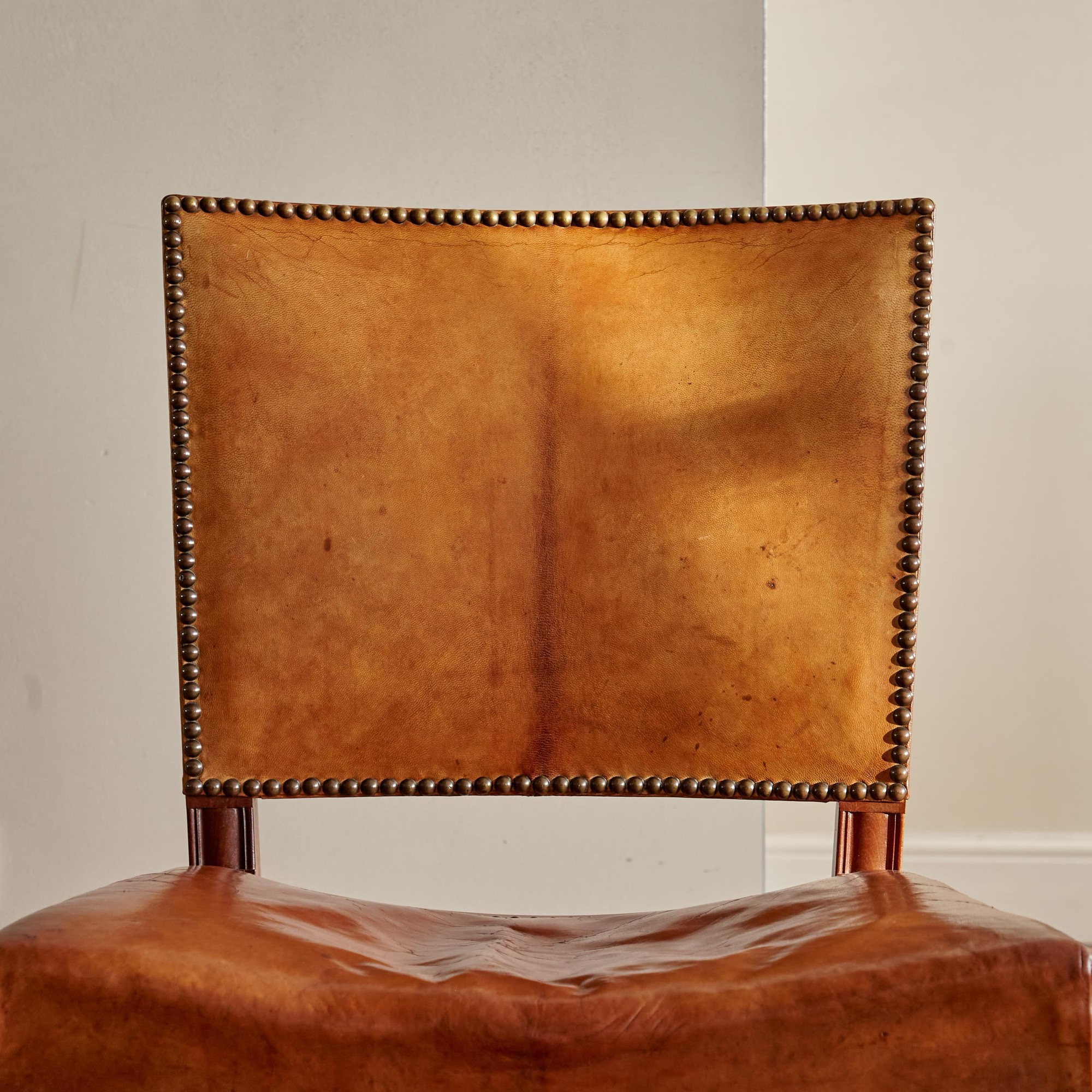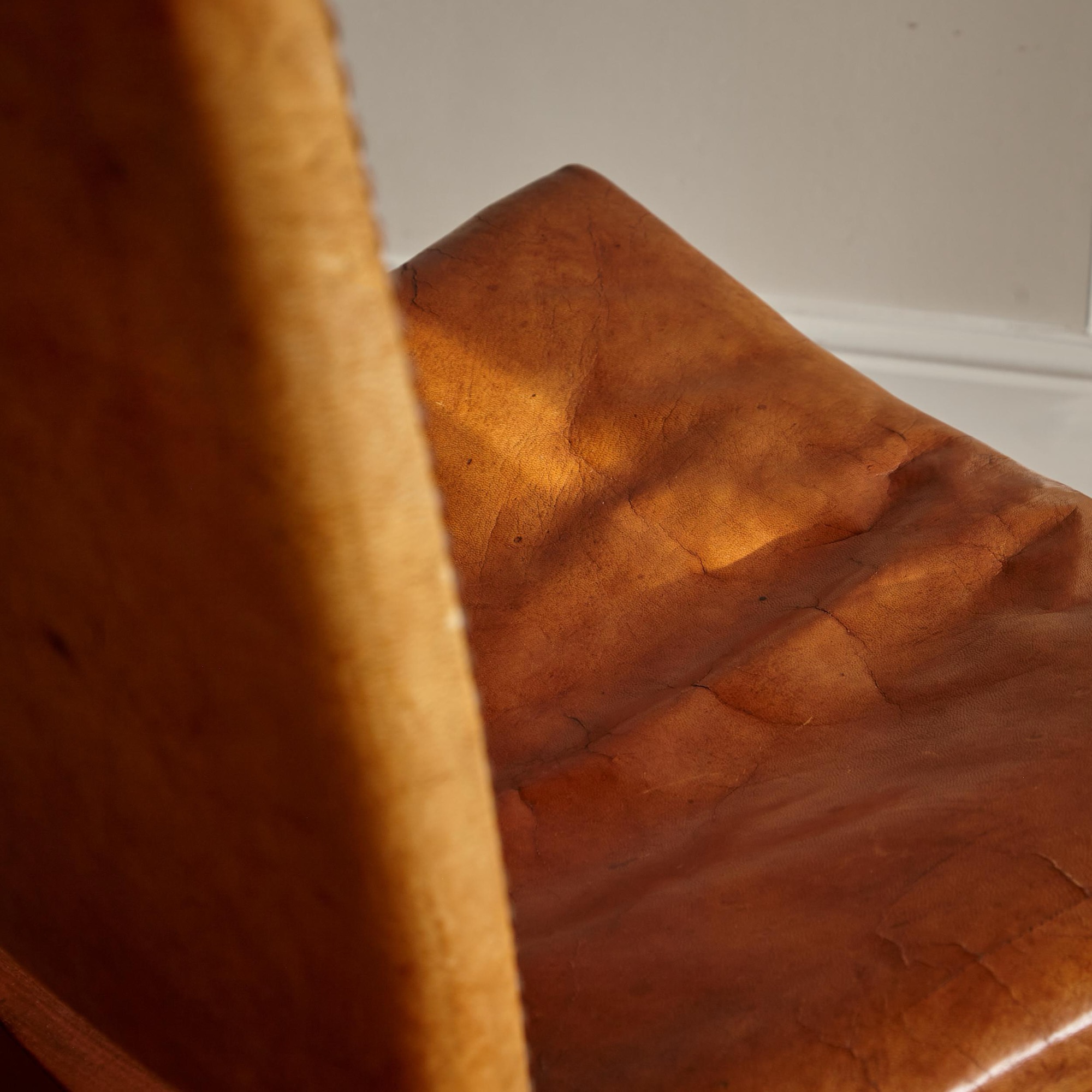 The splayed upholstered backrest above a saddle seat all covered in the original studded Niger leather on profiled mahogany legs joined by stretchers.