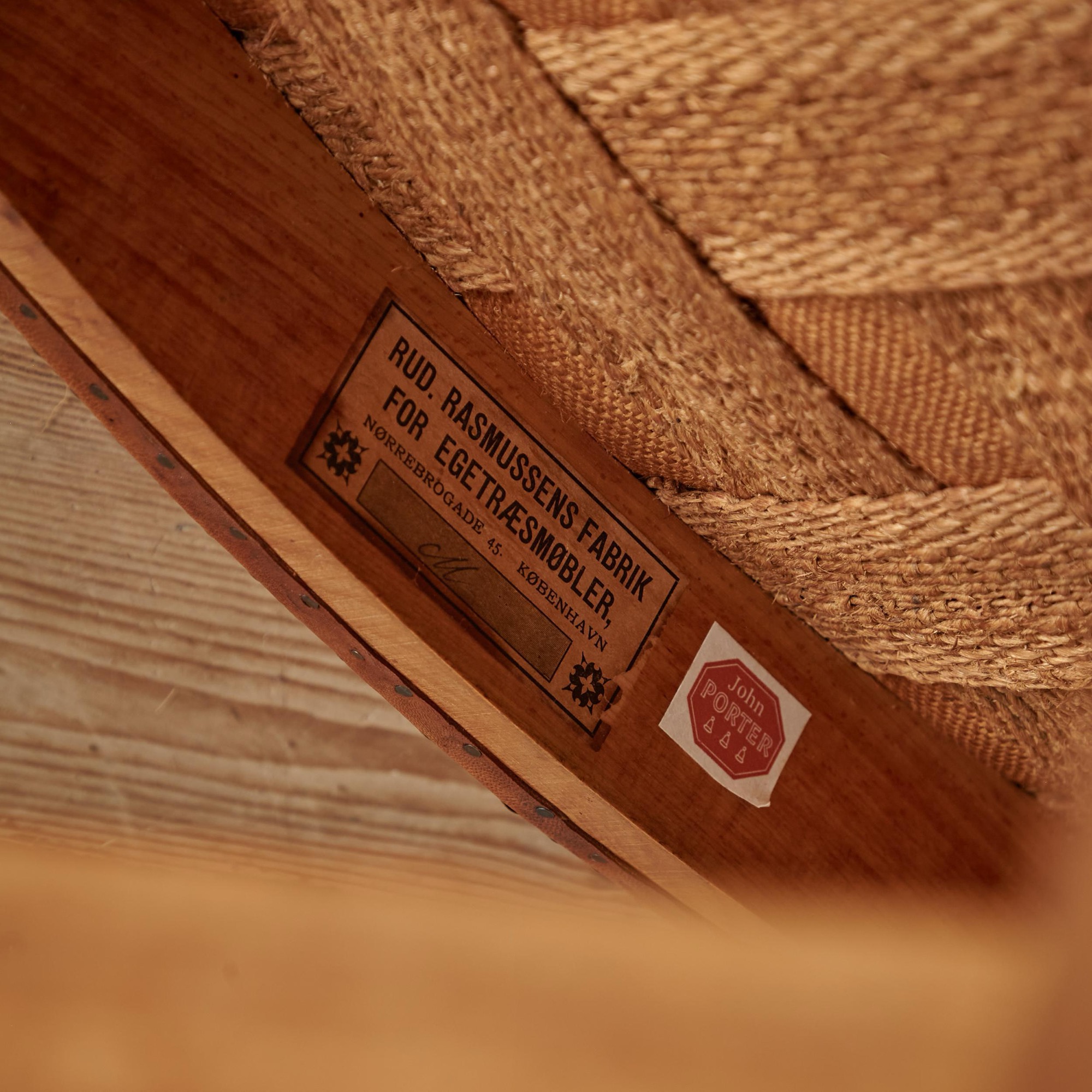Manufactured by Rud. Rasmussen. Bearing the original maker's label to the underside alongside John Porter's label, the UK based dealer who sold the chair to Gordon Russell in the 1960s. Porter specialised in modern and contemporary Scandinavian design.