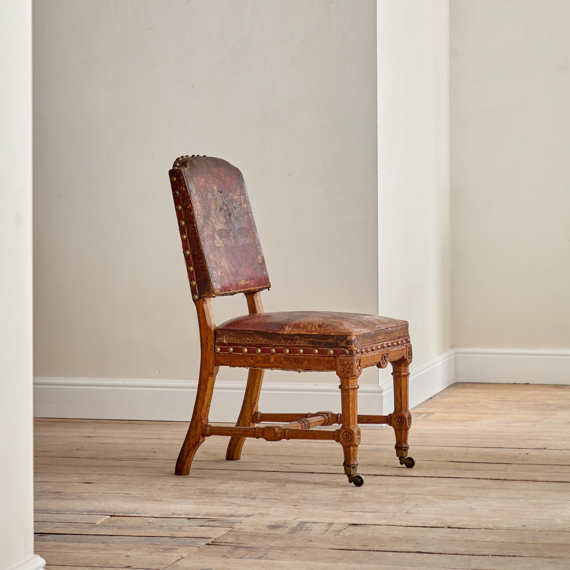 A Reformed Gothic oak upholstered side chair covered in the original red leather