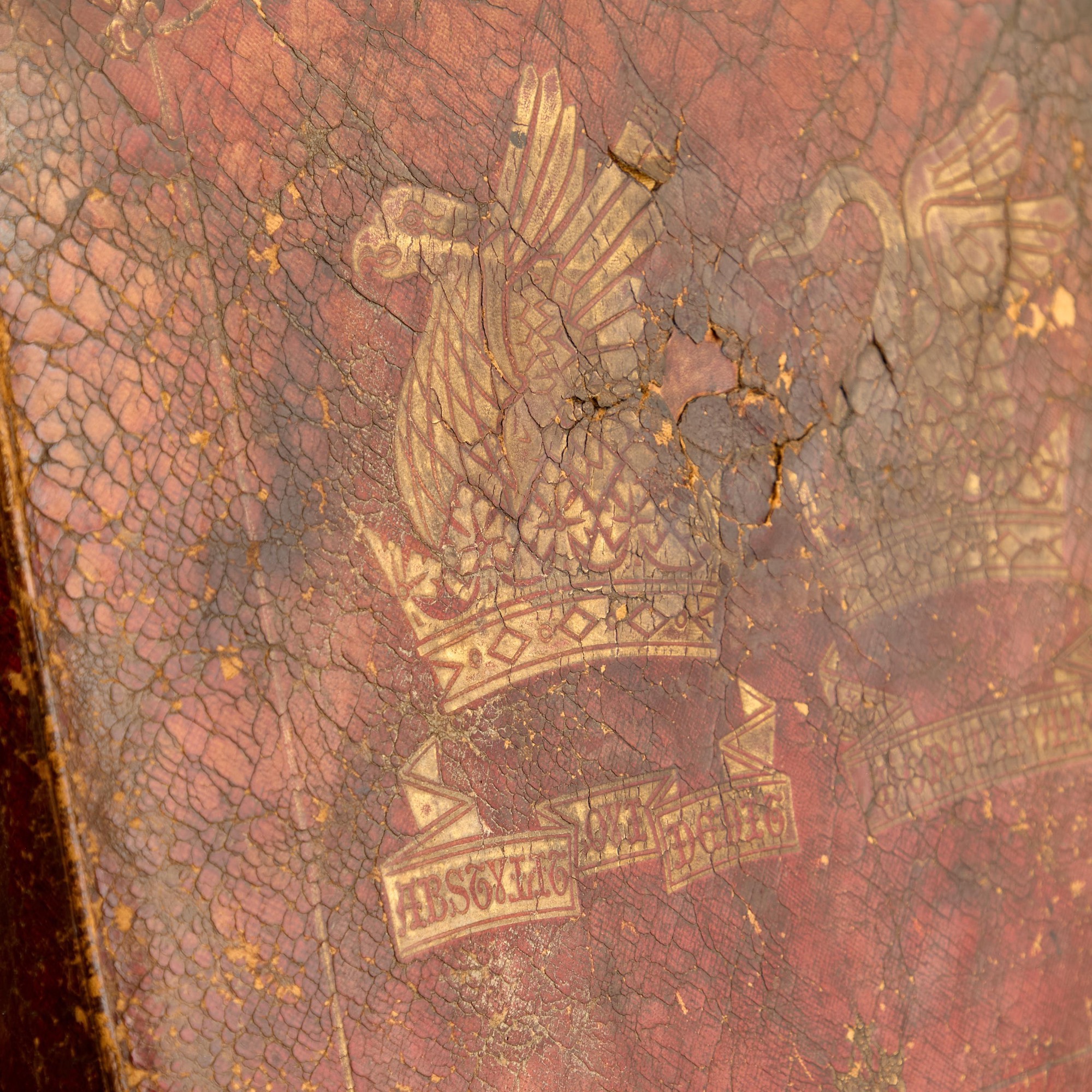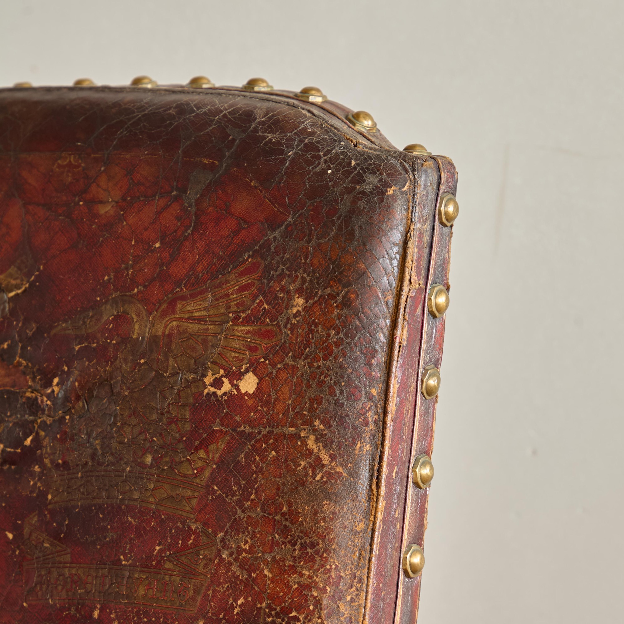 The red leather upholstery with gilt family crests of the Stafford family, on a chamfered and carved oak frame. On champhered Cope castors.