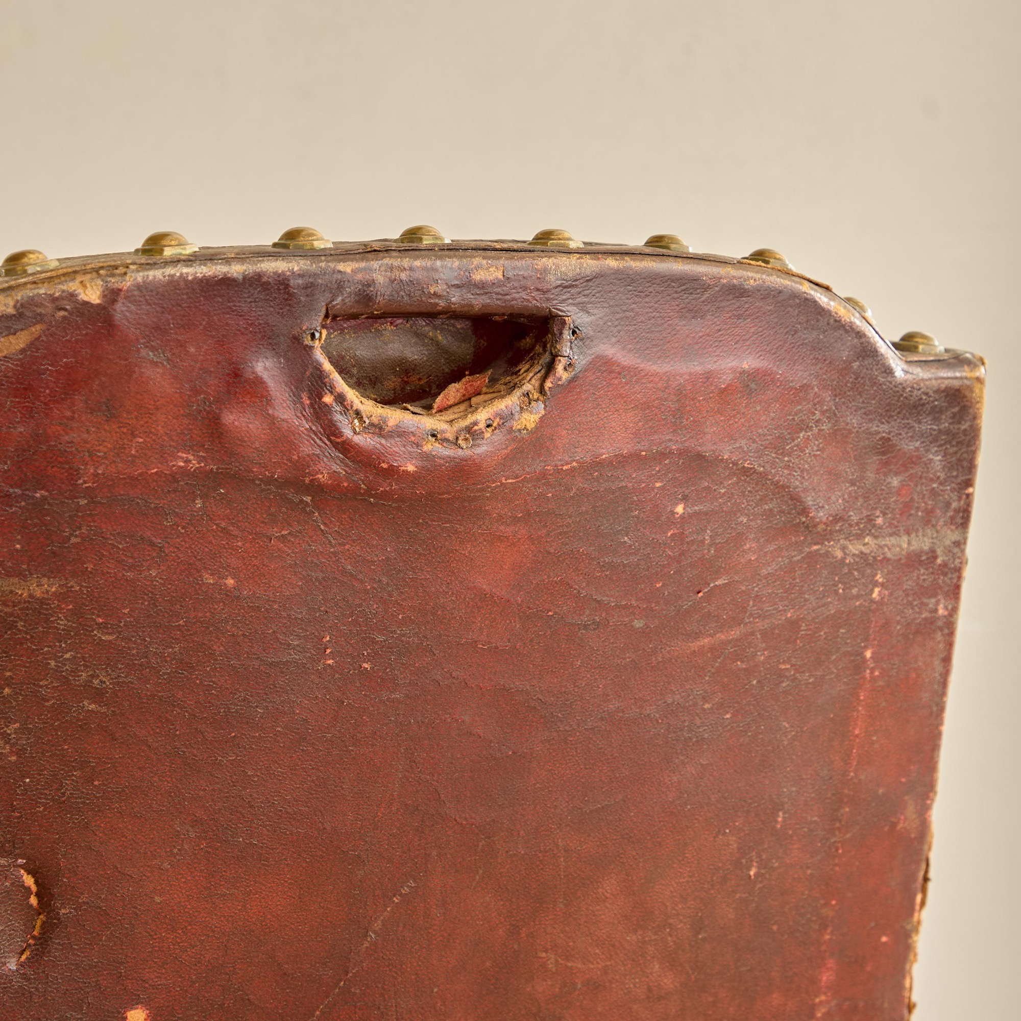 - A Reformed Gothic oak upholstered side chair covered in the original red leather