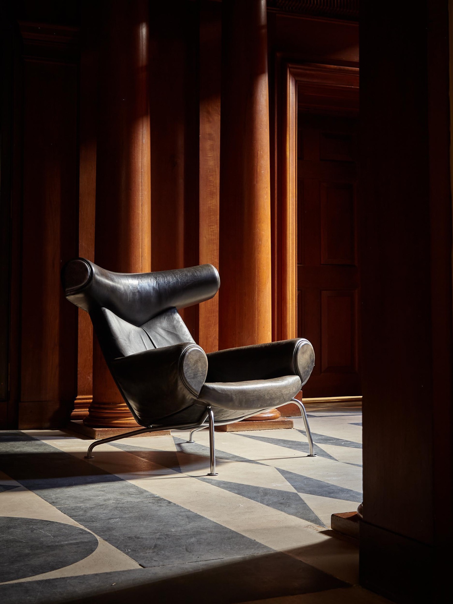 Wegner's Ox chair was way ahead of its time. Designed for AP Stolen in 1960, it represents a bold departure from the restraint of traditional Scandinavian design principles. Purportedly inspired by Picasso's abstract paintings of bullfighting, the chair's playful yet balanced design challenges the prevailing simplicity of its era. Crafted with a thin steel frame supporting a substantial body and a striking headrest reminiscent of ox horns, Wegner's inverted massing creates an illusion of weightlessness while providing versatile seating options. Upholstered in moulded foam, a revolutionary technique that allowed for organic, sculptural shapes, the condition of this example is remarkable given its perishable material. Production challenges led to a hiatus after only two years, resuming nearly three decades later with updated construction methods under Erik Jørgensen. Early examples like this are therefore incredibly rare and sought after. Despite modern advancements, crafting each chair remains a time-intensive process, highlighting the chair's enduring appeal and Wegner's personal attachment to it as his favourite easy chair.