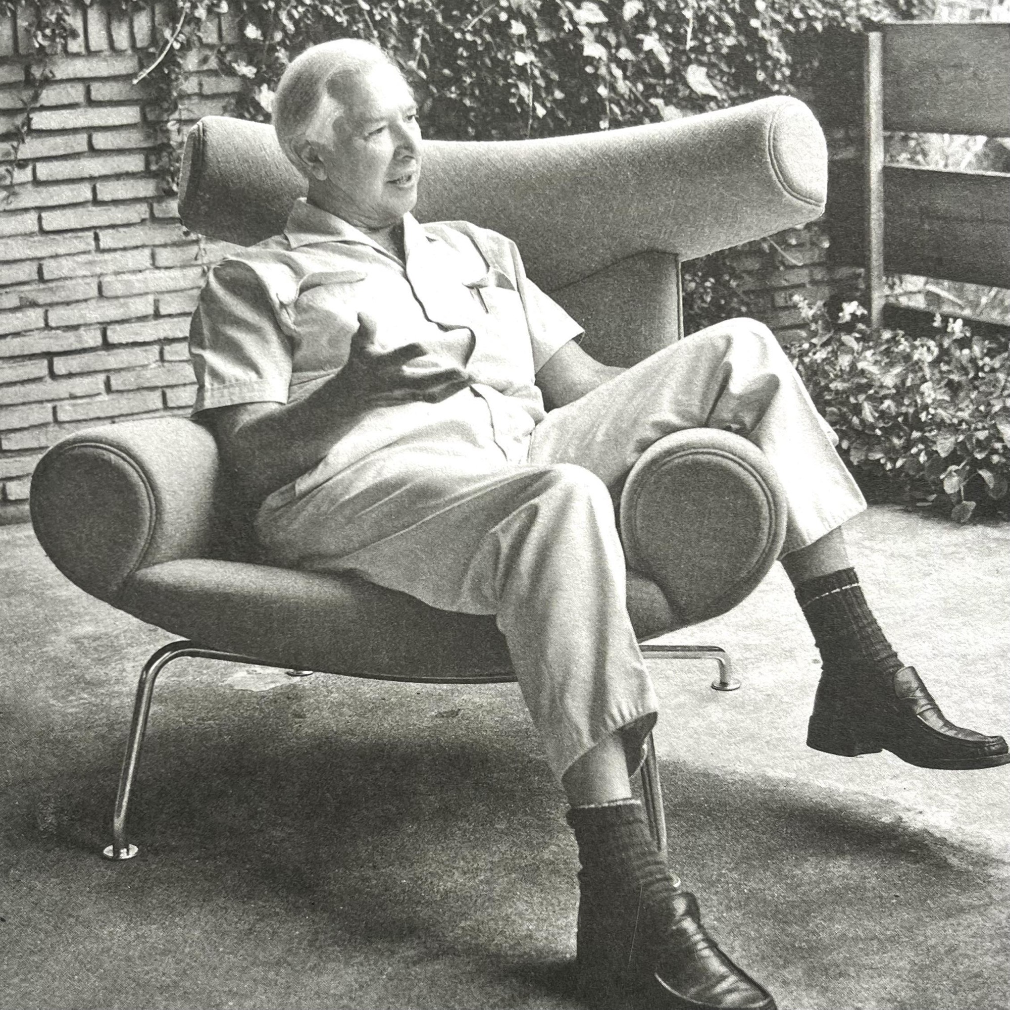 Crafted with a thin steel frame supporting a substantial body and headrest reminiscent of ox horns, Wegner's inverted massing creates an illusion of weightlessness while providing versatile seating options. Upholstered in moulded foam, a revolutionary technique that allowed for organic, sculptural shapes, the condition of this example is remarkable given its perishable material.
