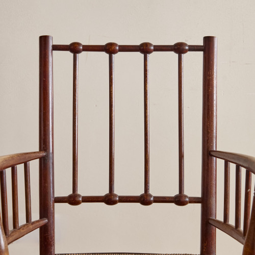 The raked steam-bent arched back with a splaying pierced wicker splat above a triangular wicker seat on willow legs joined by cross-stretchers.