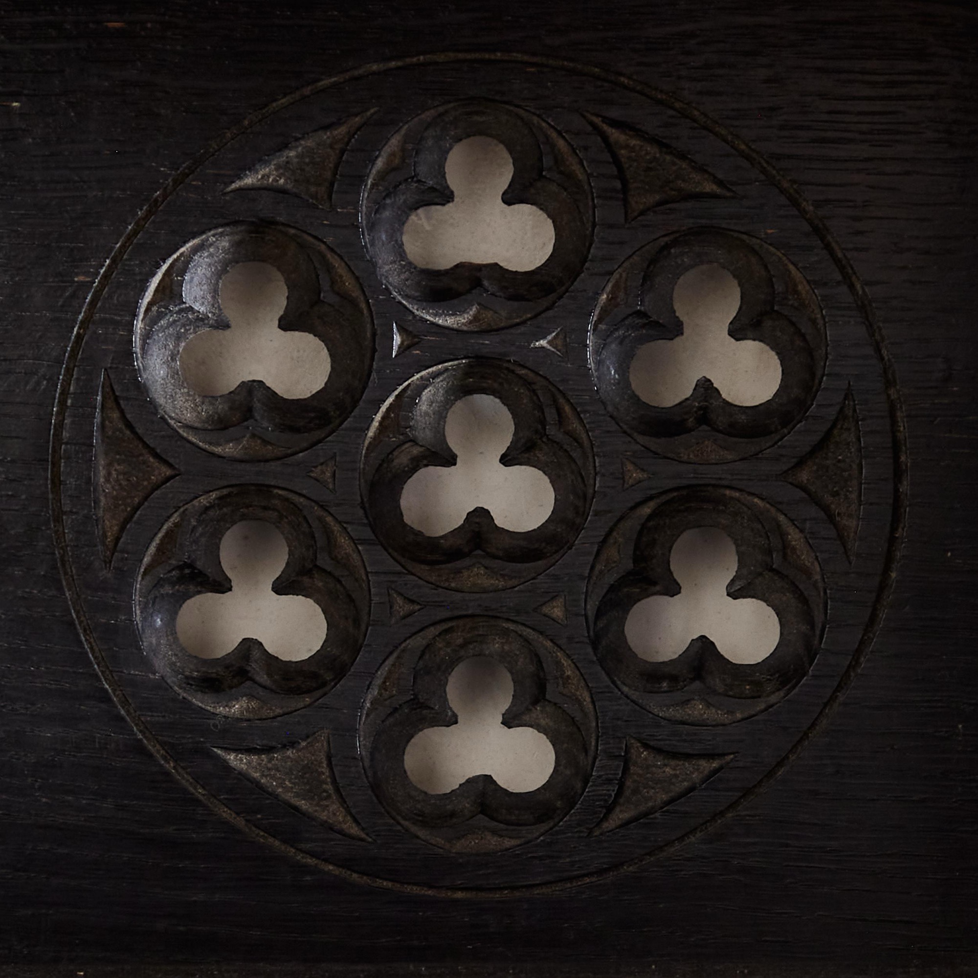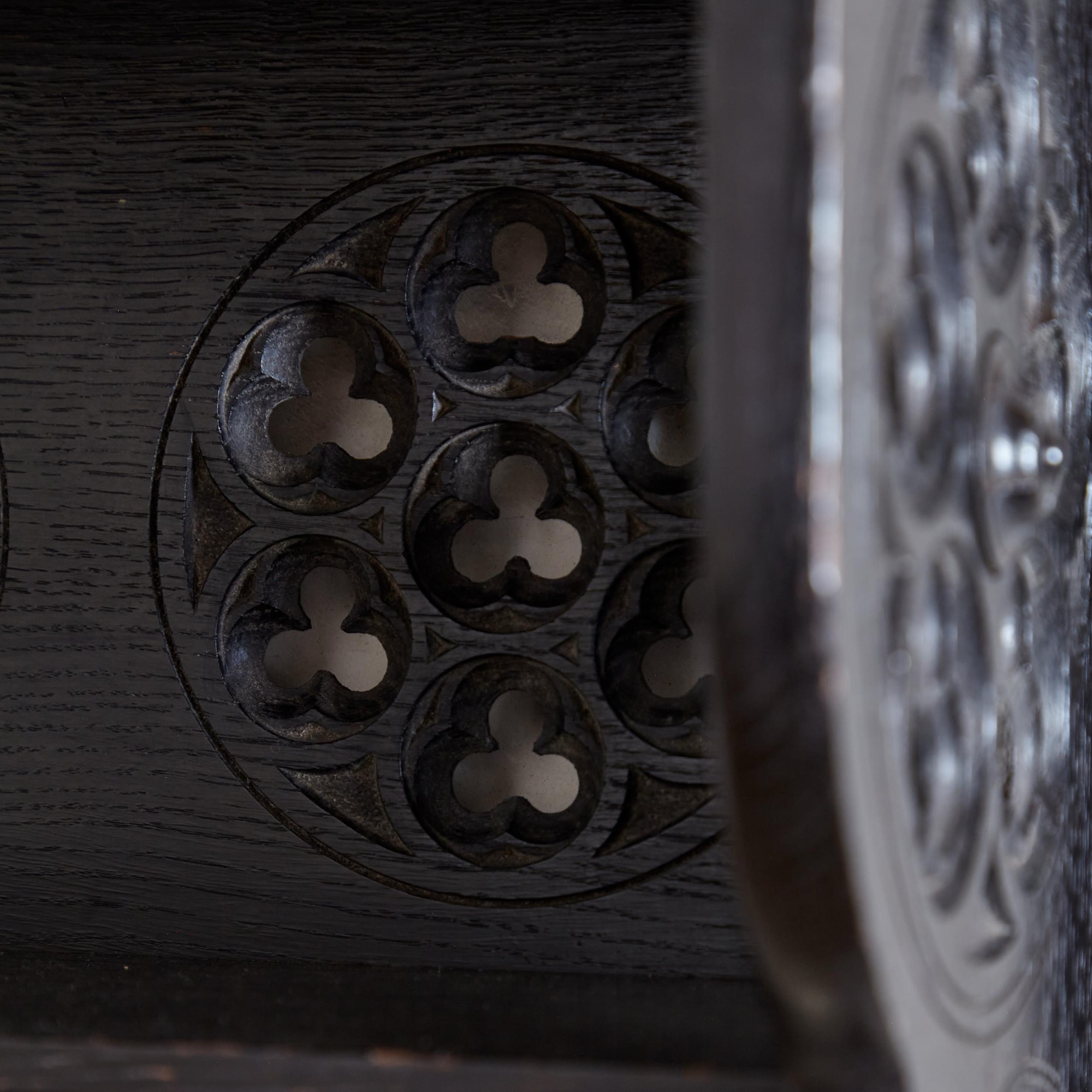 Comprising two open shelves, the sides and back with roundels with carved and pierced concentric trefoils.