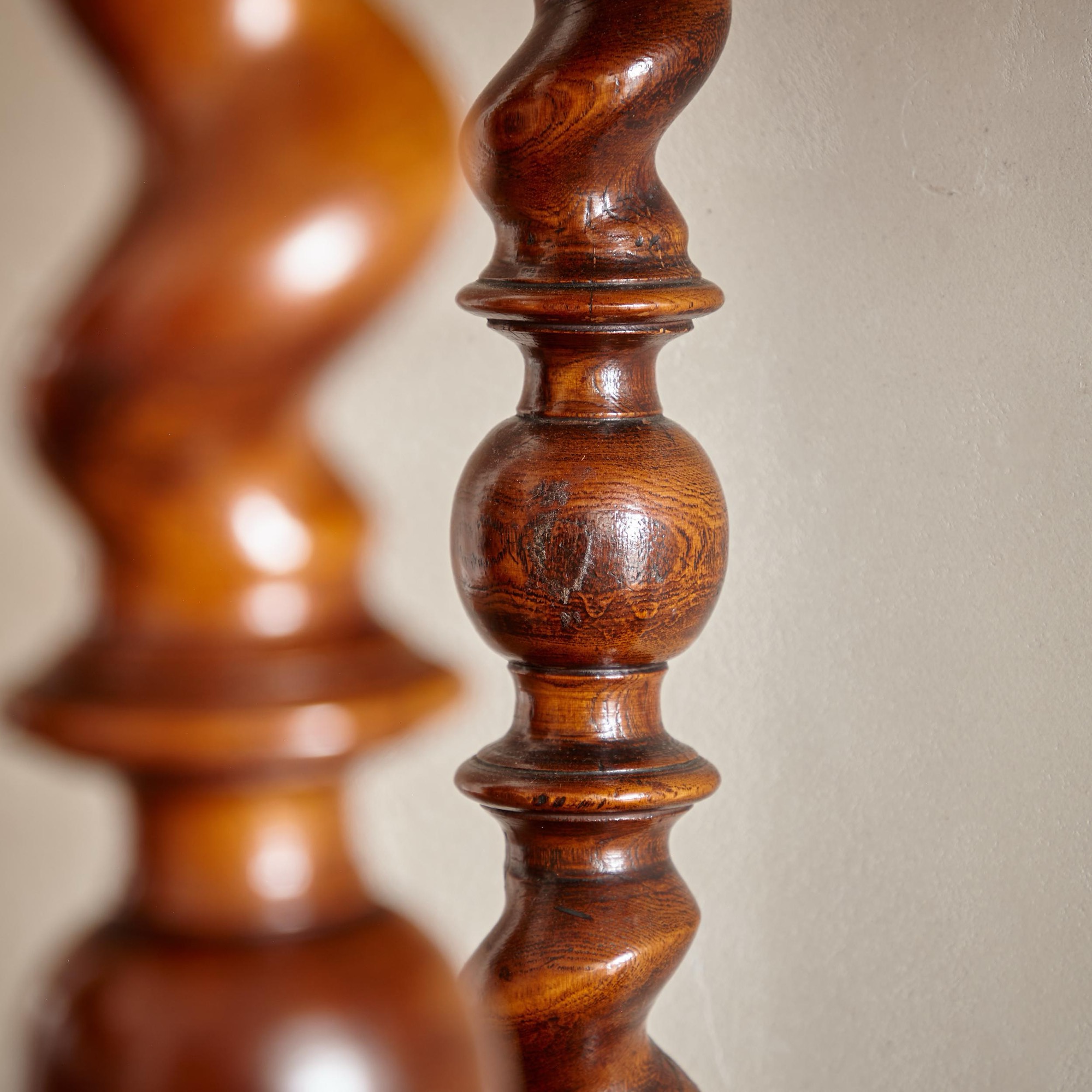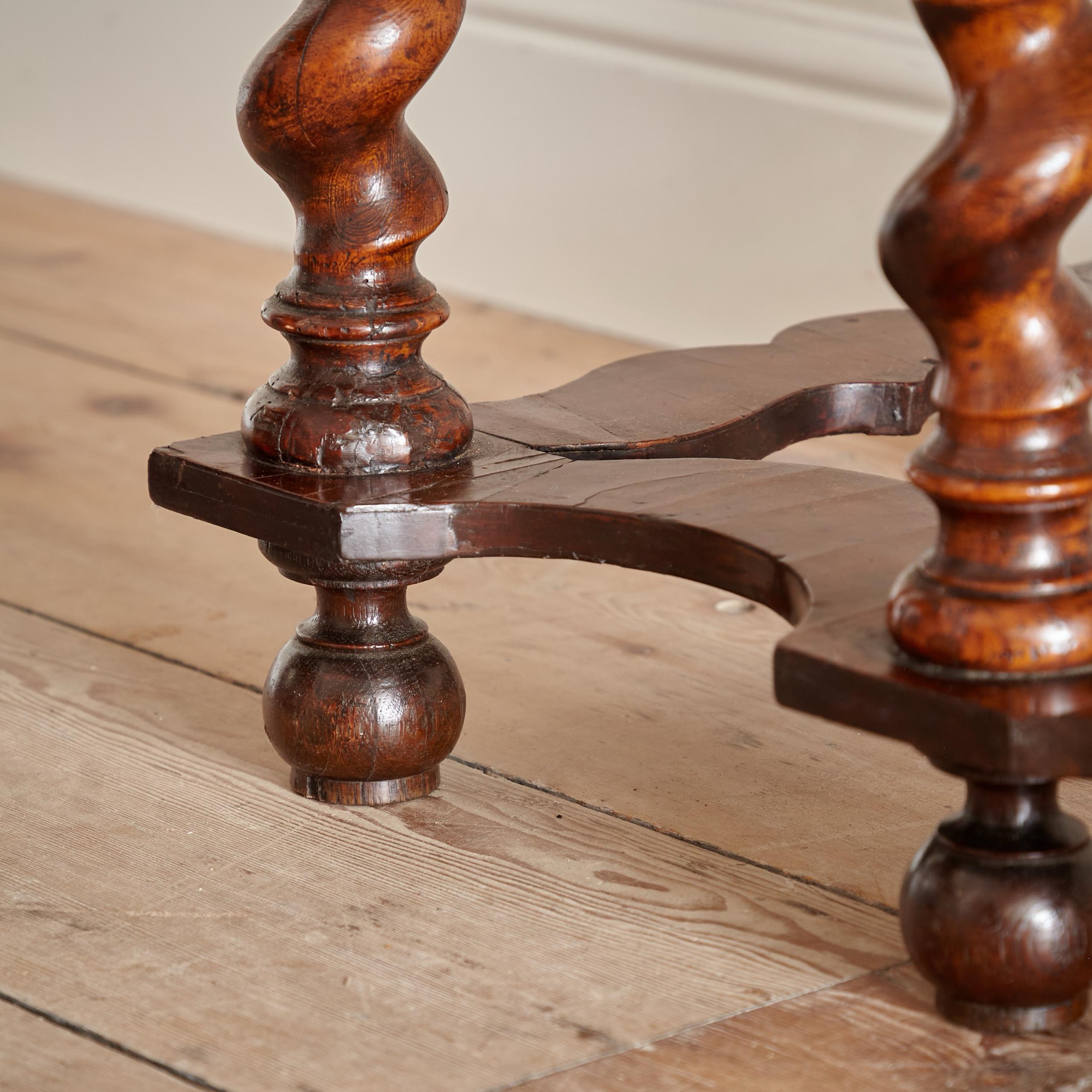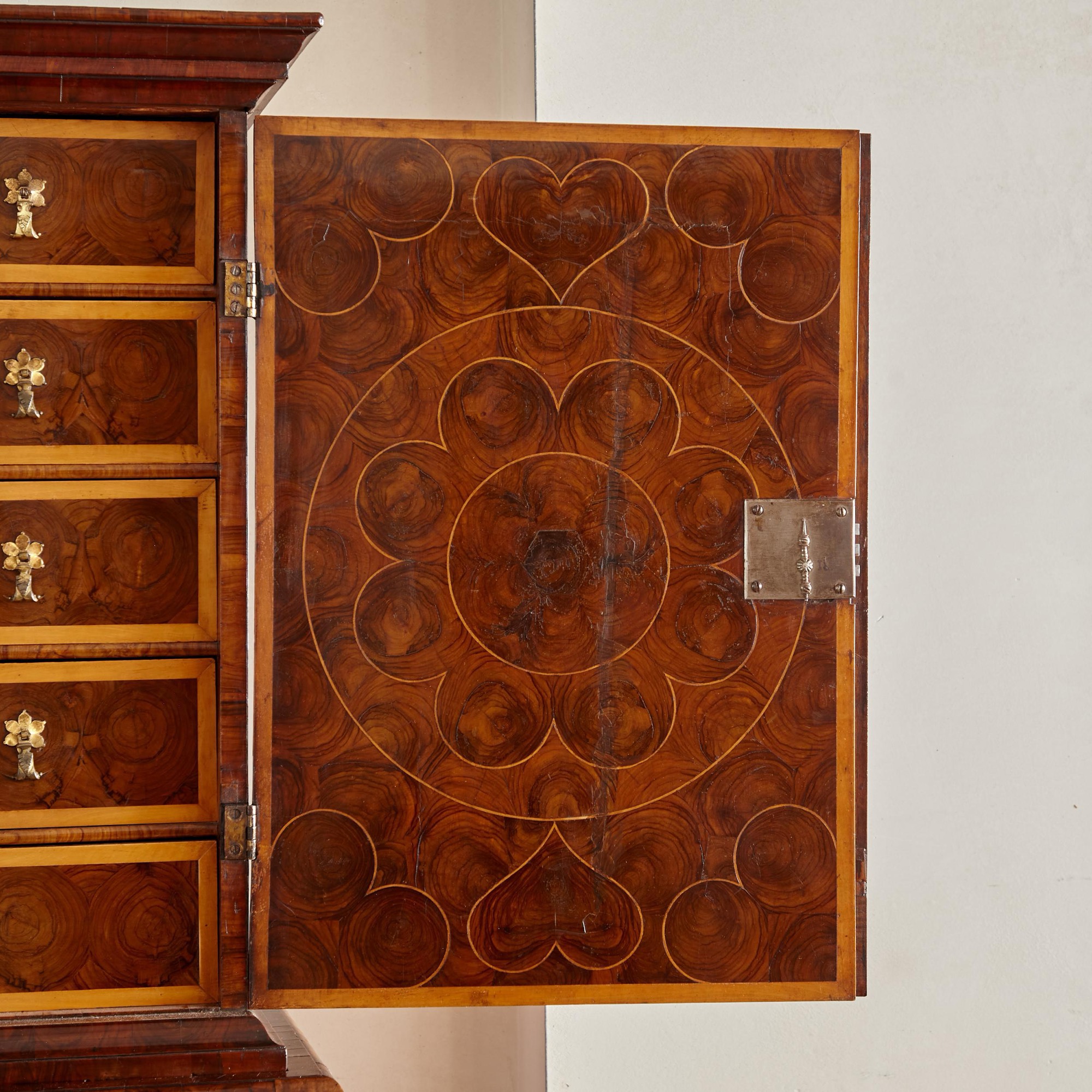 The upper section with two doors decorated with scrolling motifs surrounding a central floral design, all in oyster veneered olivewood, strung and banded in holly. The doors opening to reveal eleven drawers surrounding a central door enclosing further drawers, all in conforming oyster veneering. All on the original stand with a frieze drawer and barley sugar twist legs joined by shaped stretchers on later replaced bun feet.