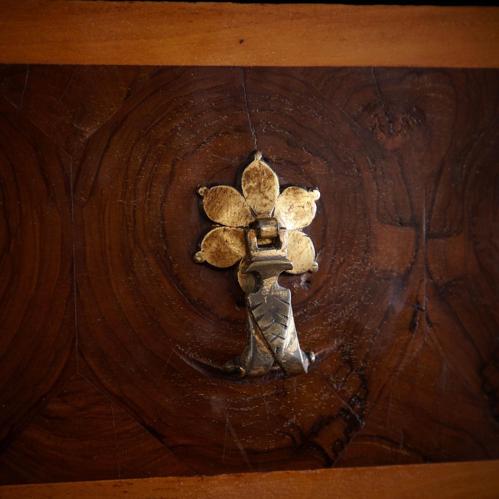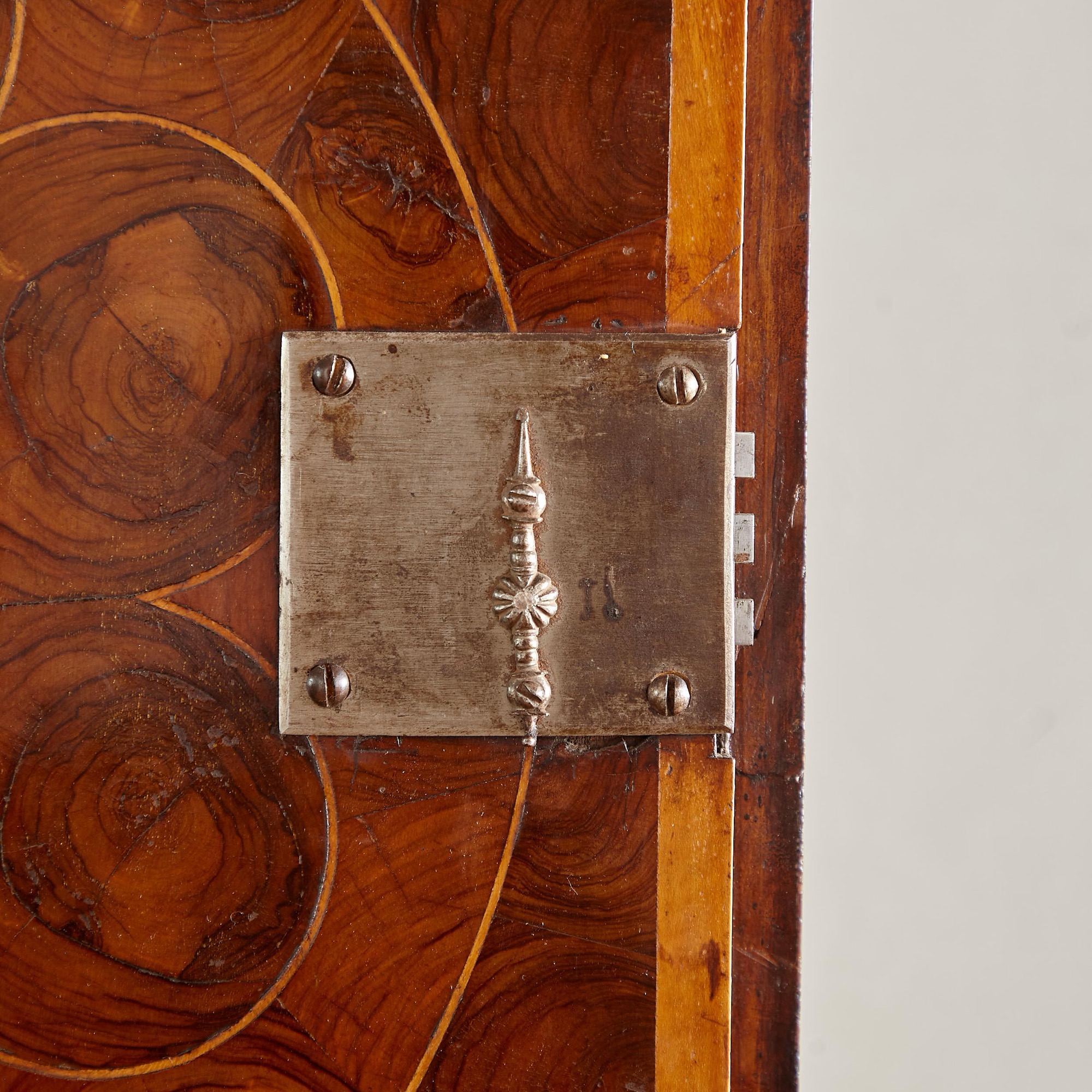 The particular veneers, line inlays, and banding on this cabinet are closely comparable to those seen on two chests of drawers labelled with the printed mark of London cabinetmaker Hugh Granger. Granger operated from the Carved Angel in Aldermanbury, offering "All Sorts of Fashionable Household Goods at Reasonable Rates," and served as a churchwarden there in 1692. His business seems to have closed around 1706, when he announced the sale of his remaining "Cabinet Work & Glasses."