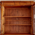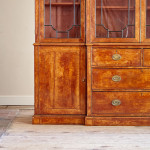 The four astragal glazed doors with ebony glazing bars opening to a shelved interior and supporting a simple cornice with oval strung decoration. Resting on a central chest of two short over two long drawers with the original brass oval handles, and flanked by cupboards, all raised on a plinth base decorated with strung ovals. All veneered in a wonderful crown cut satinwood.