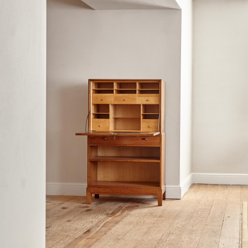 In two parts, the upper section with a fall front, below a frieze of blind fretwork and a dentil cornice. Secured by a sprung Chubbs lock enclosing a fitted interior of drawers with axe-head handles and pigeonholes behind the leather-lined writing surface, with an integral ratcheted slope. The lower section with two doors enclosing a fitted interior of drawers. All on cabriole spade feet.