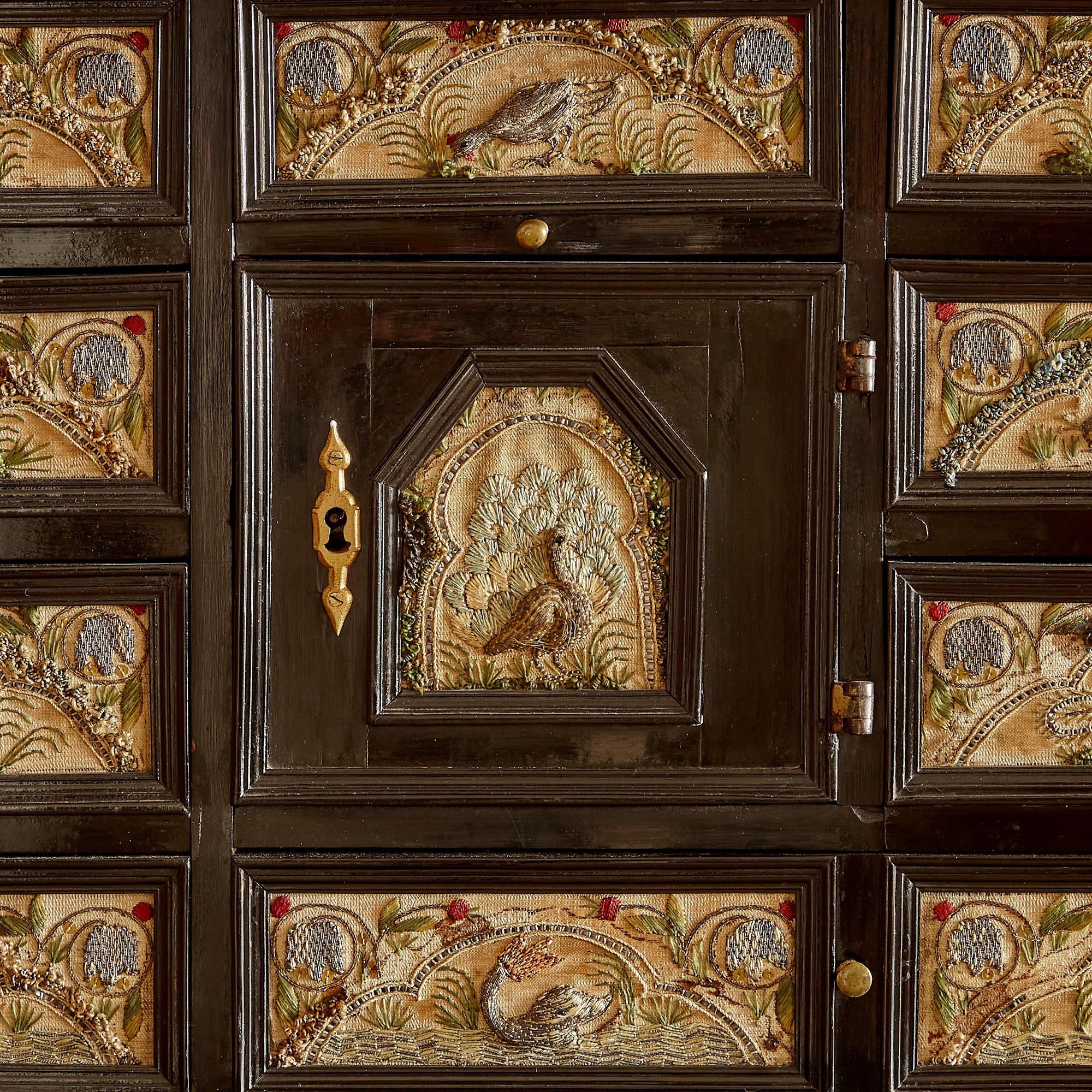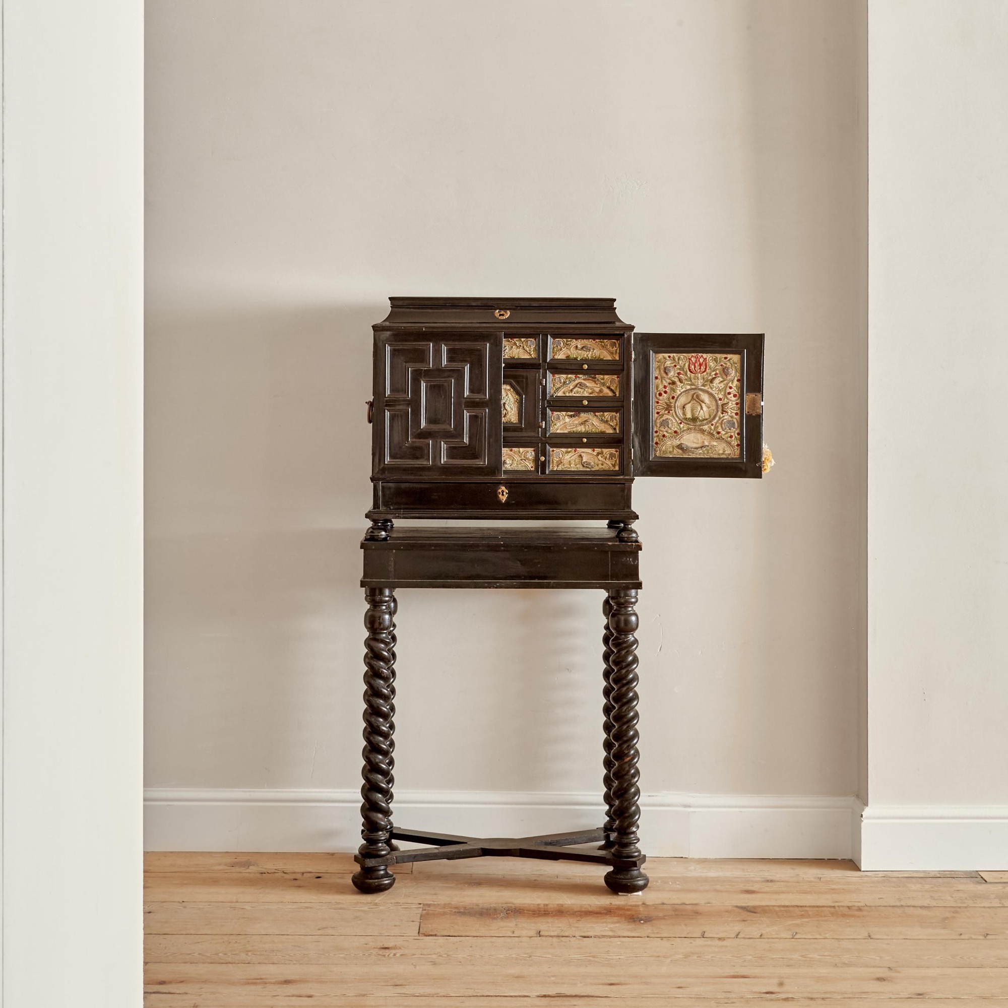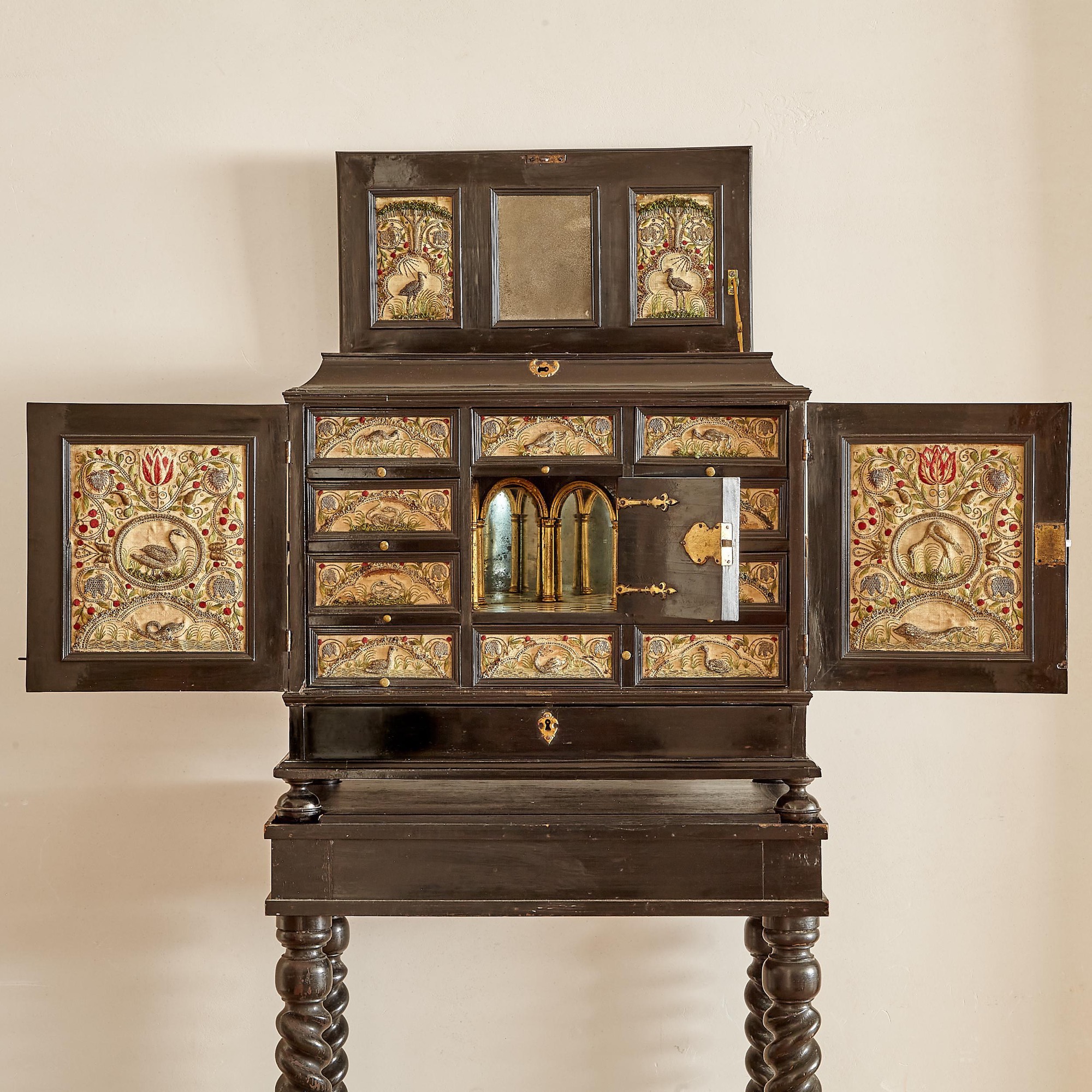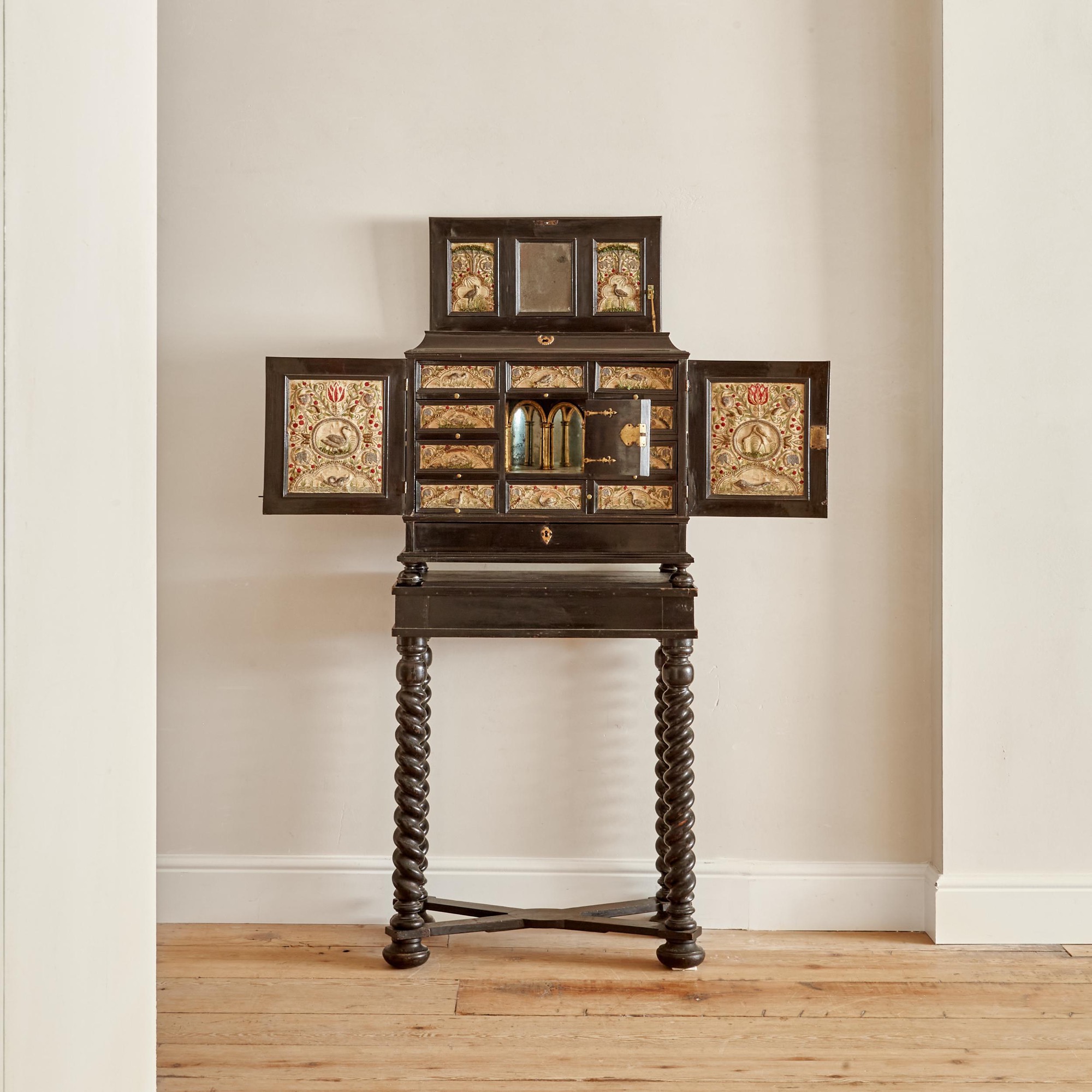An exceptional ebony veneered and silk stumpwork Antwerp cabinet on stand