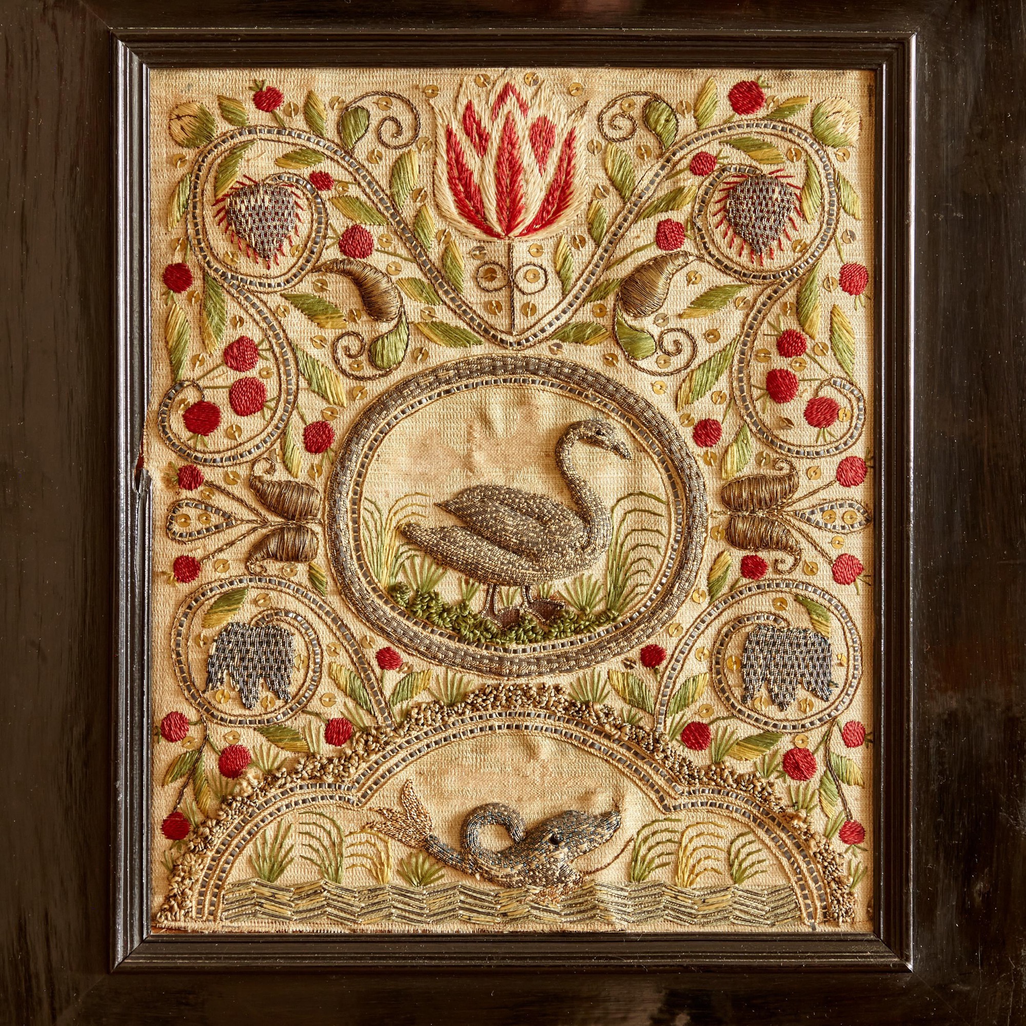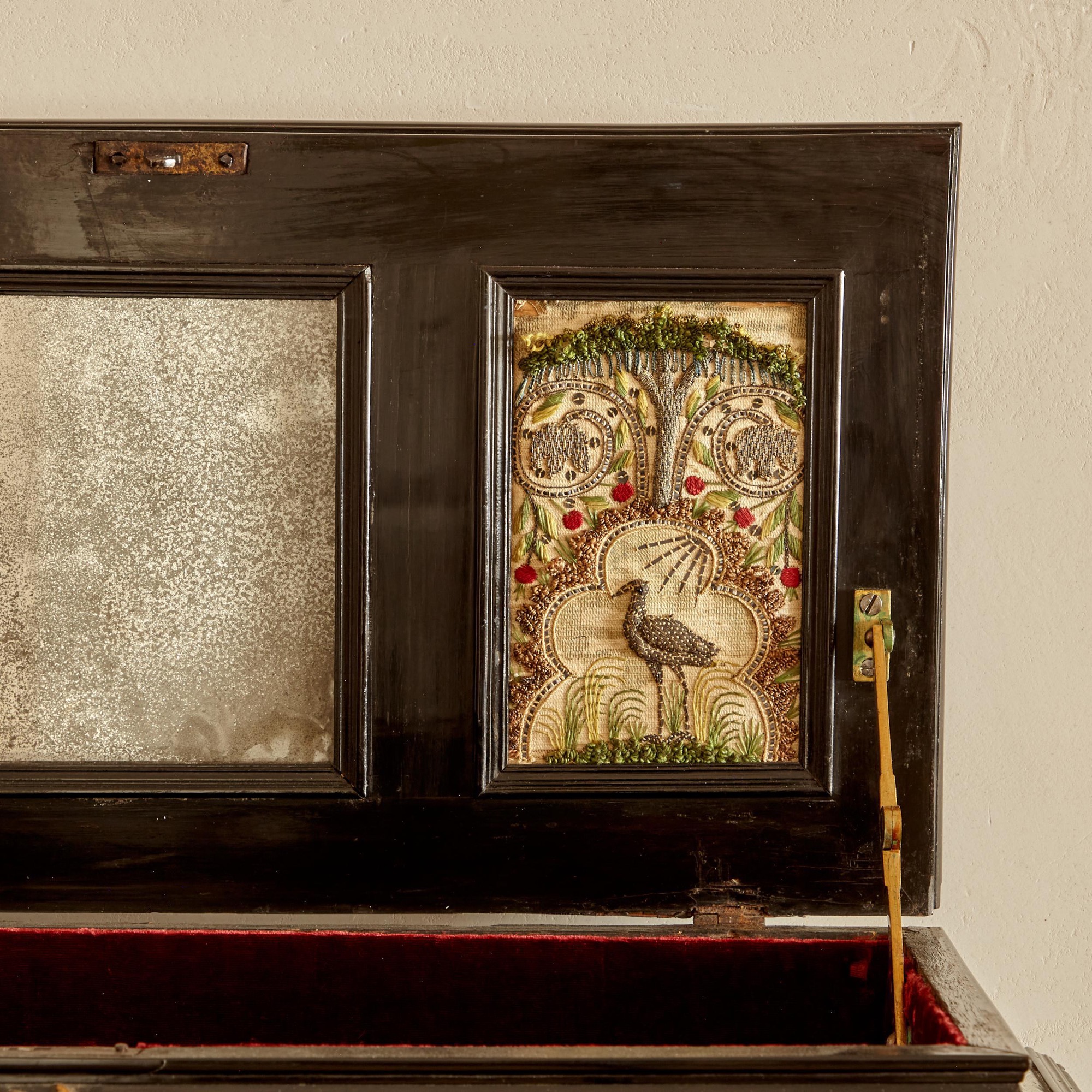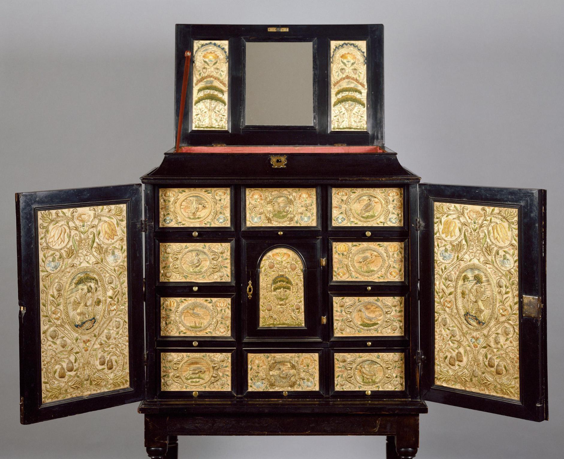 The ebony venered two door cabinet with fielded panels, beneath a rising caddy top enclosing small velvet lined compartment and two stump work panels flanking central mirror. The doors opening to reveal a fitted interior of ten drawers and a central cupboard all faced in incredibly rare embroidered silk stumpwork panels. The central cupboard enclosing a mirrored arcaded interior with a bone and ebony chequer board floor. Above a frieze drawer and all on turned bun feet.