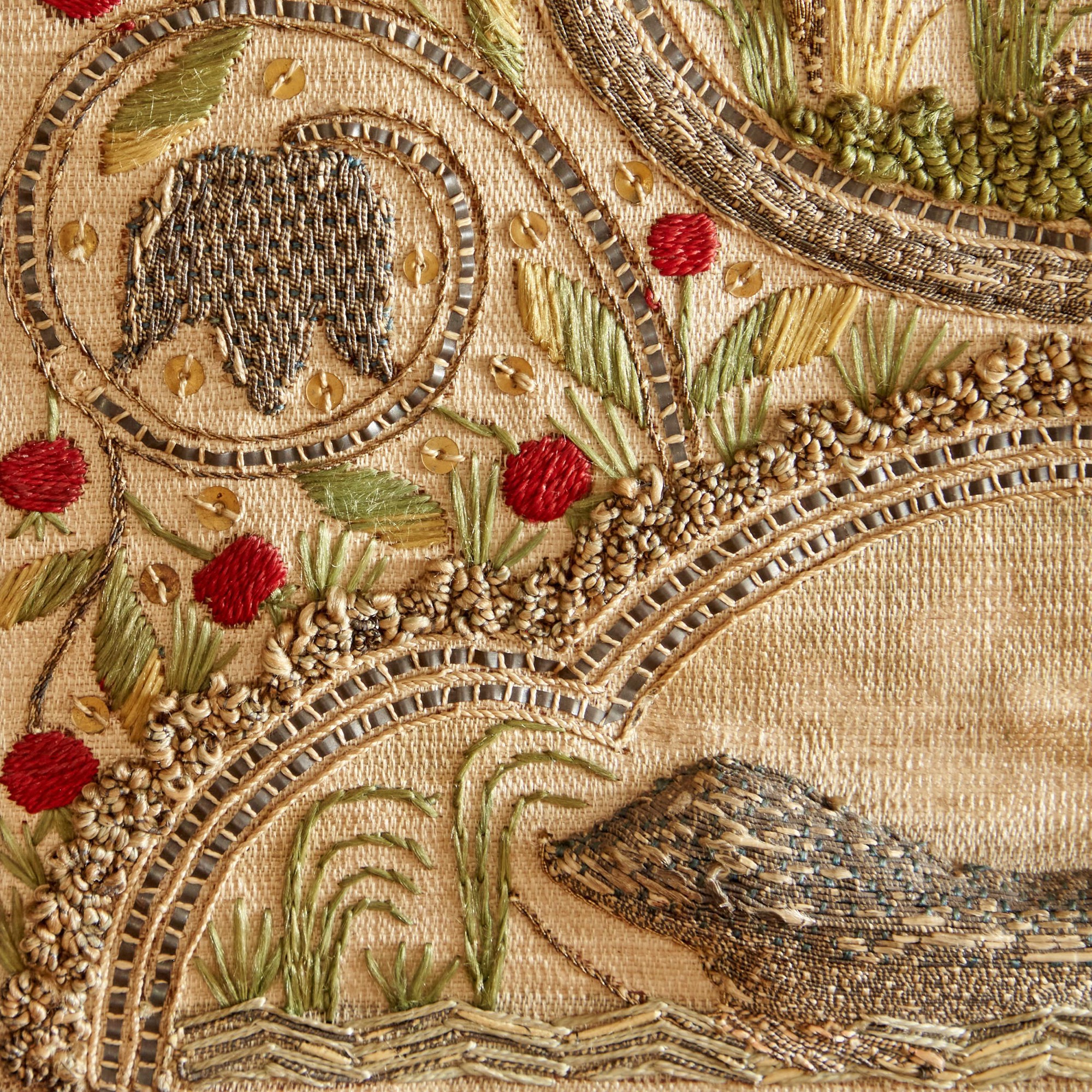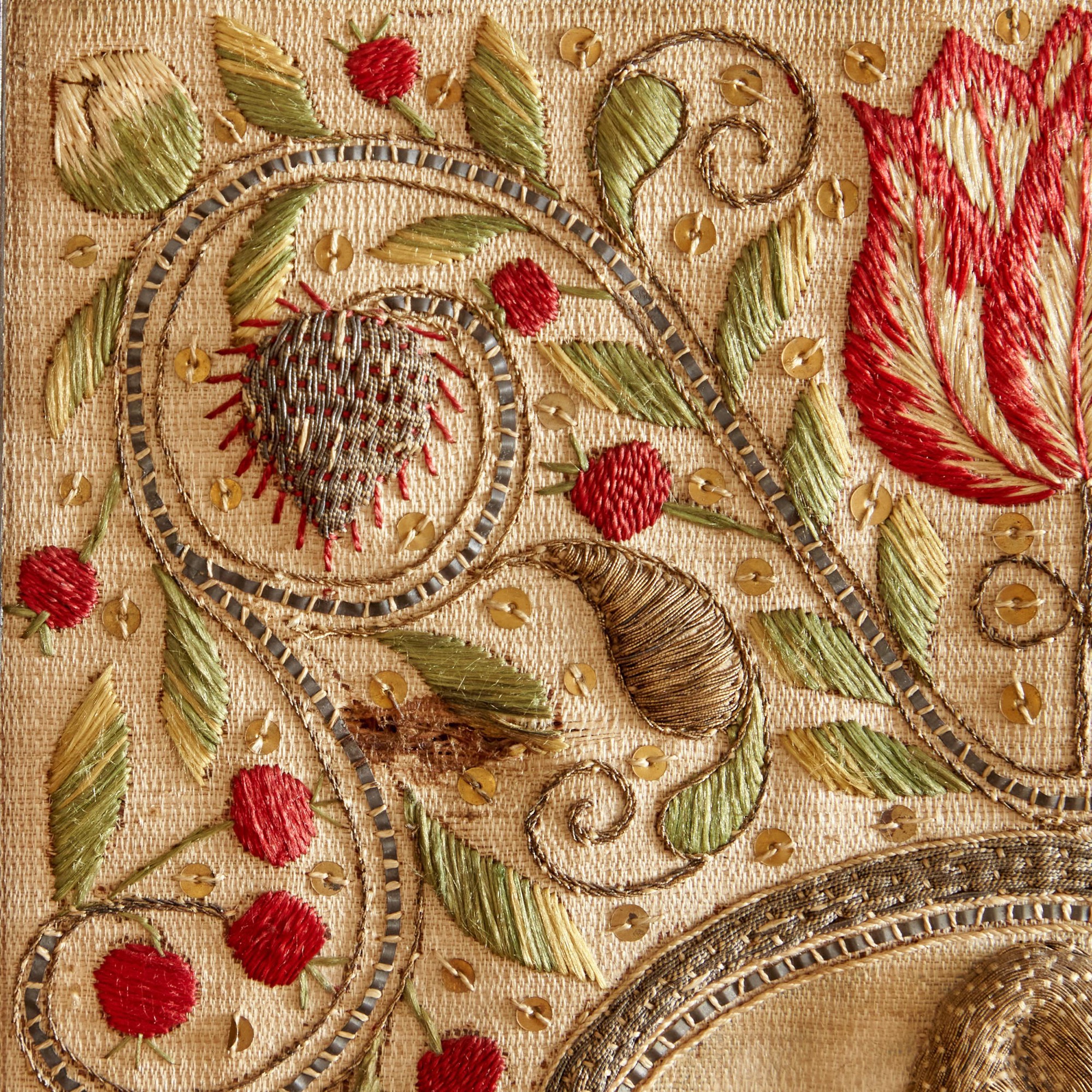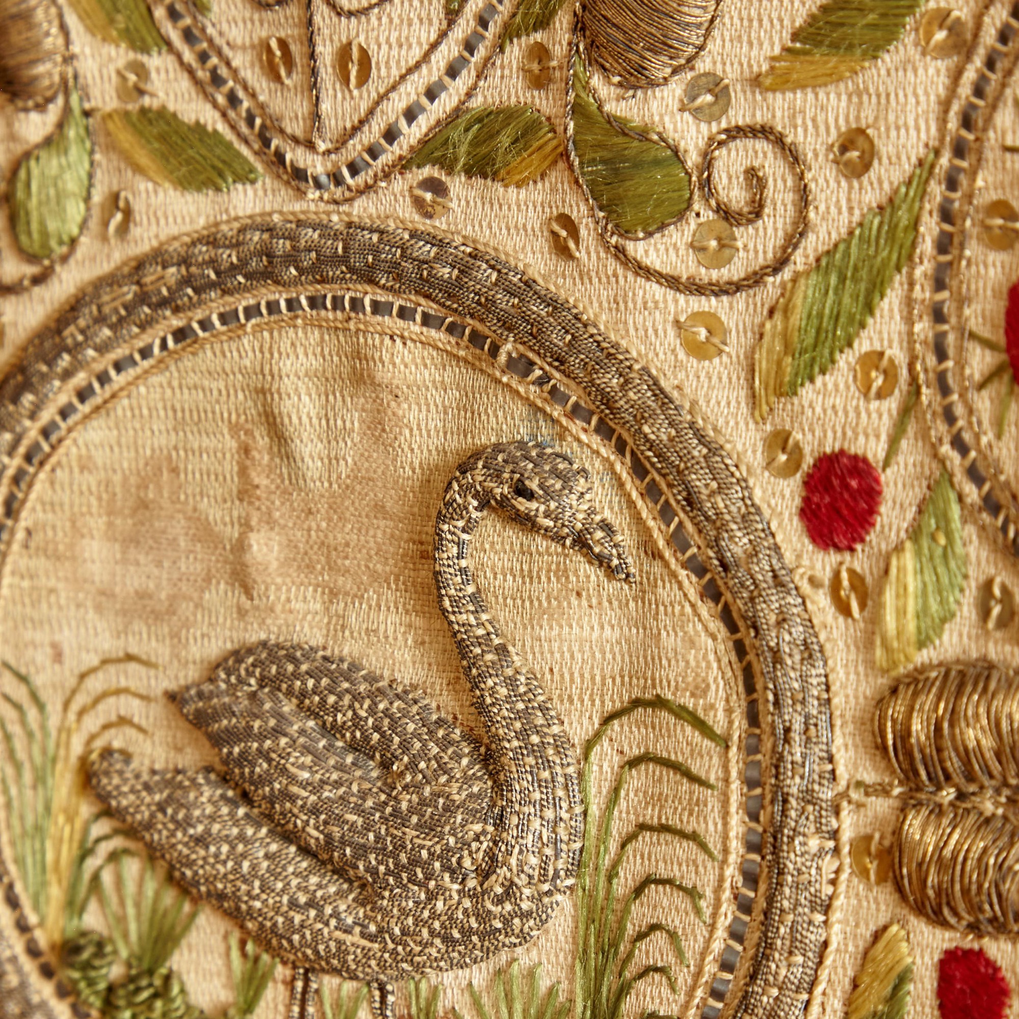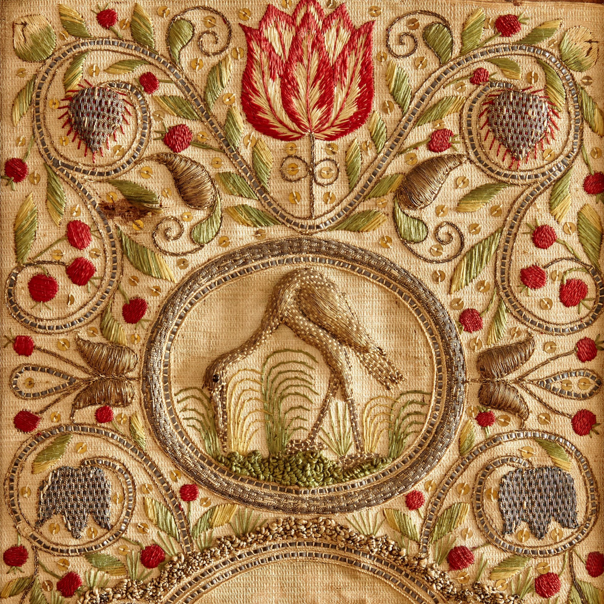 The ebony venered two door cabinet with fielded panels, beneath a rising caddy top enclosing small velvet lined compartment and two stump work panels flanking central mirror. The doors opening to reveal a fitted interior of ten drawers and a central cupboard all faced in incredibly rare embroidered silk stumpwork panels. The central cupboard enclosing a mirrored arcaded interior with a bone and ebony chequer board floor. Above a frieze drawer and all on turned bun feet.