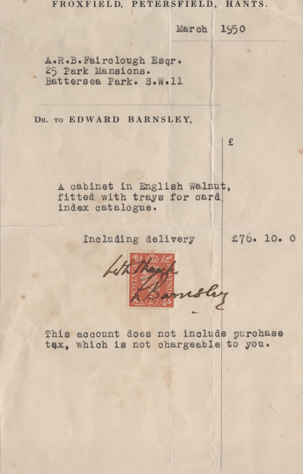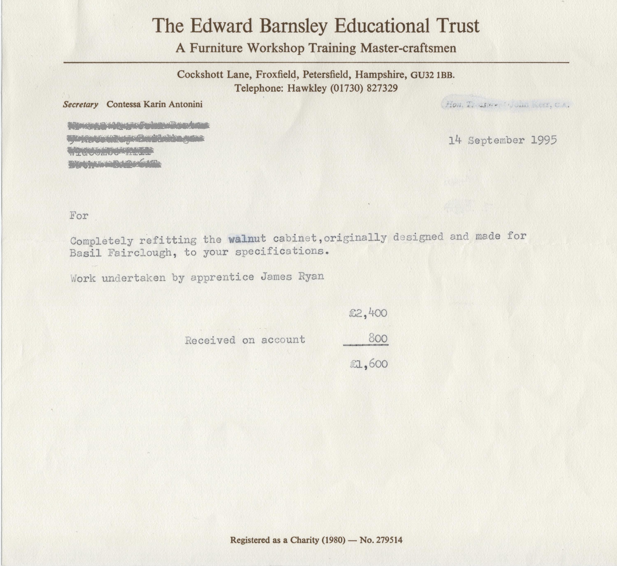 The original 1950 invoice to Basil Fairclough, signed by Edward Barnsley, as well as ongoing correspondence regarding its refitting,included.