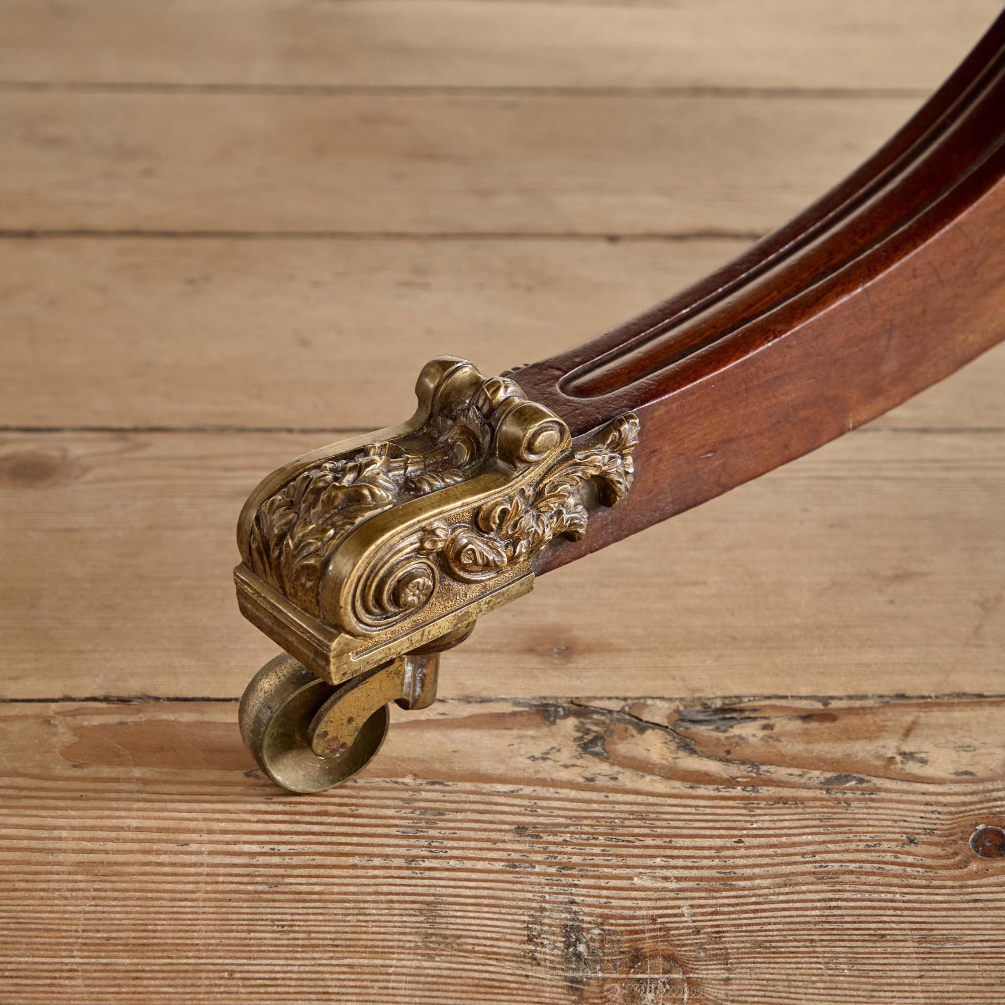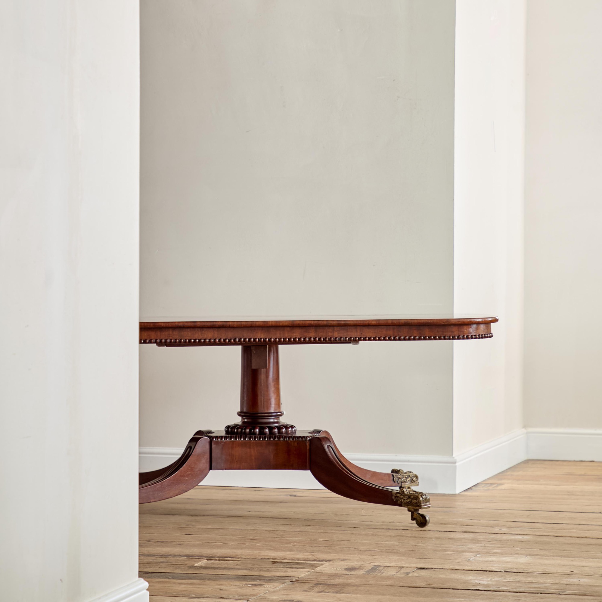 The large oblong mahogany cross-banded tilt-top on a turned column with gadrooned moulding supported by four shallow splaying legs terminating in gilt brass feet and castors.