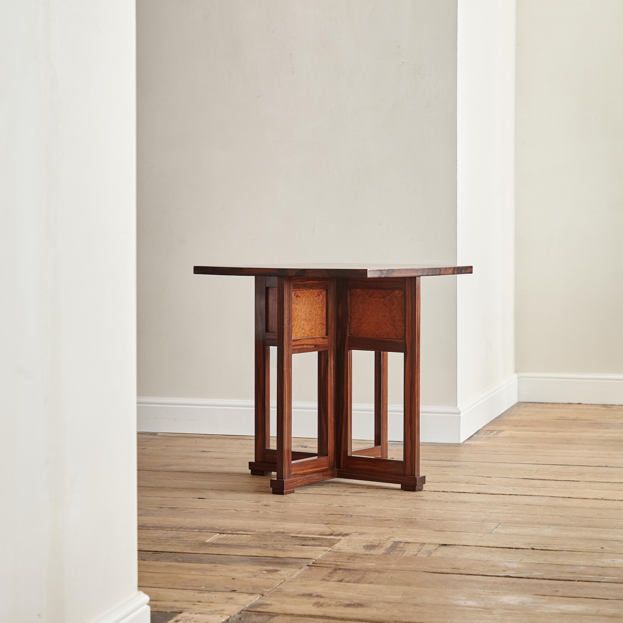 The square top veneered in amboyna with a macassar ebony veneered edge restoing on a solid macassar ebony cruciform base with inset amboyna panels on small block feet.