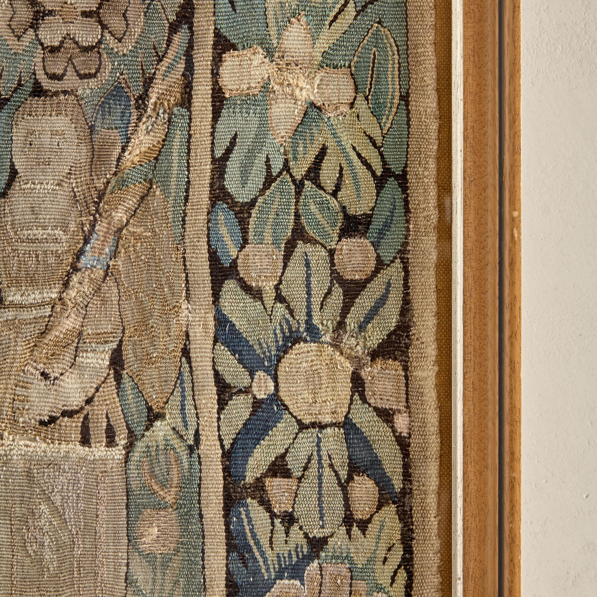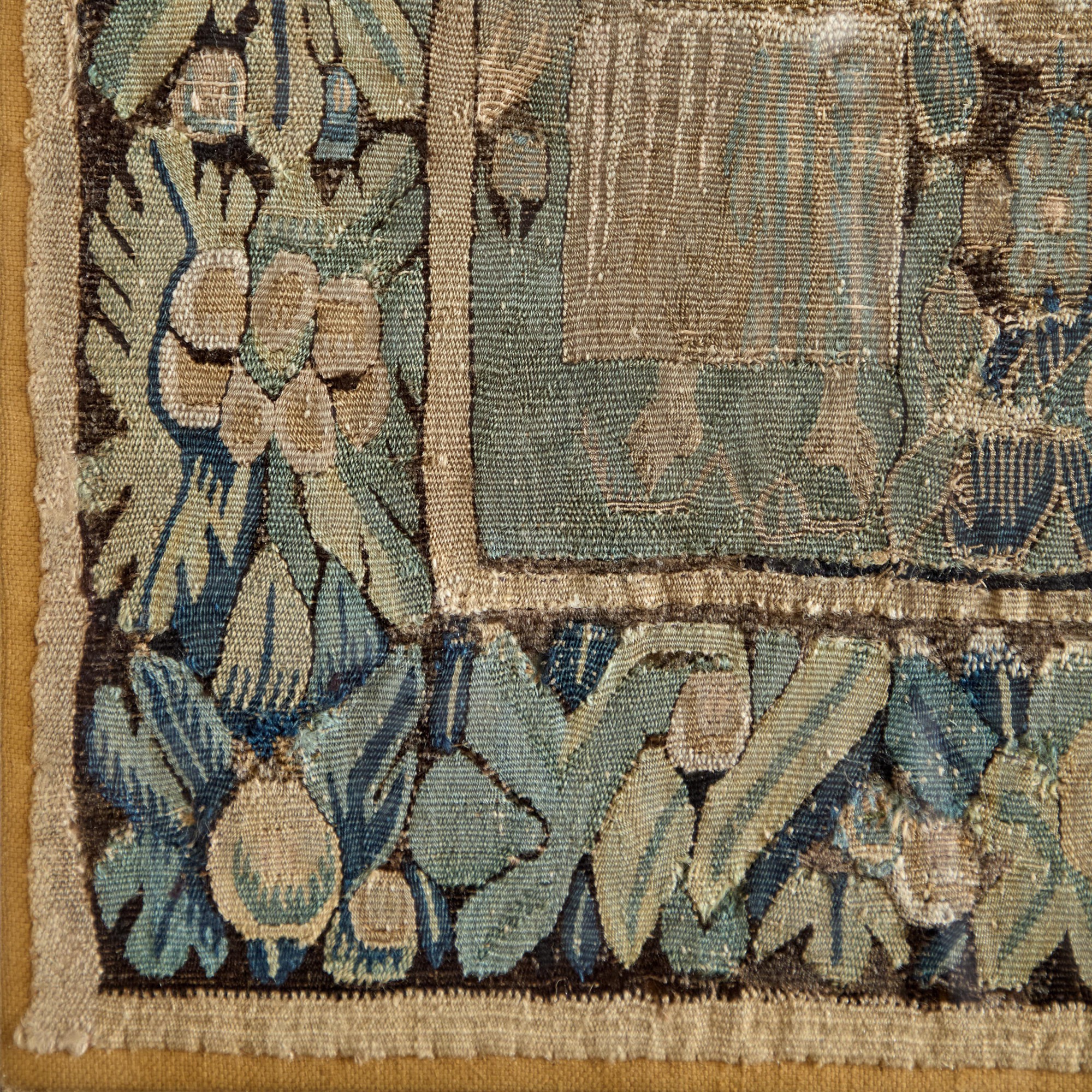 Depicting two angels holding palm leaves among flowerheads and foliage, within a foliate border and cream-coloured outer slip. In a later frame.
