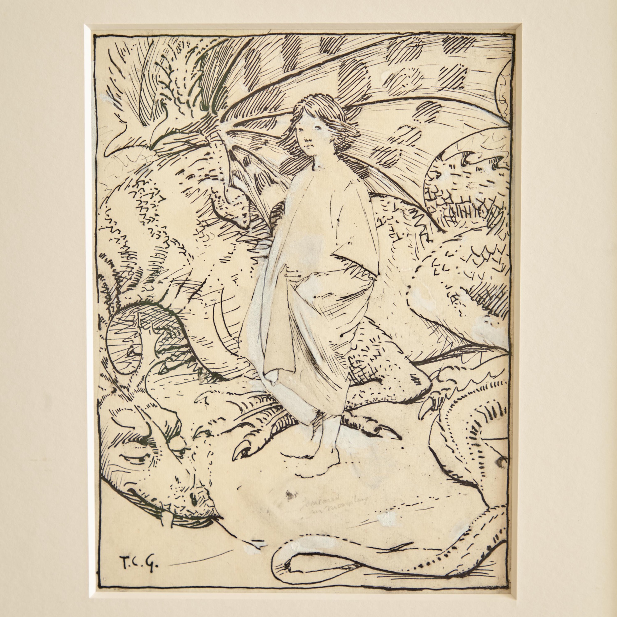 Depicting a child encircled by a dragon. 'Innocence' is a portrait of Gotch's daughter, Phyllis Maureen Gotch (later Marquise de Verdieres), 'standing alone and unafraid in the innermost, horridest home of the Dragon, called the World, who is powerless against her innocence'. She was often the model for his colourful depictions of young girls. Other studies by Gotch of this subject we titled 'The Child in the World'.
