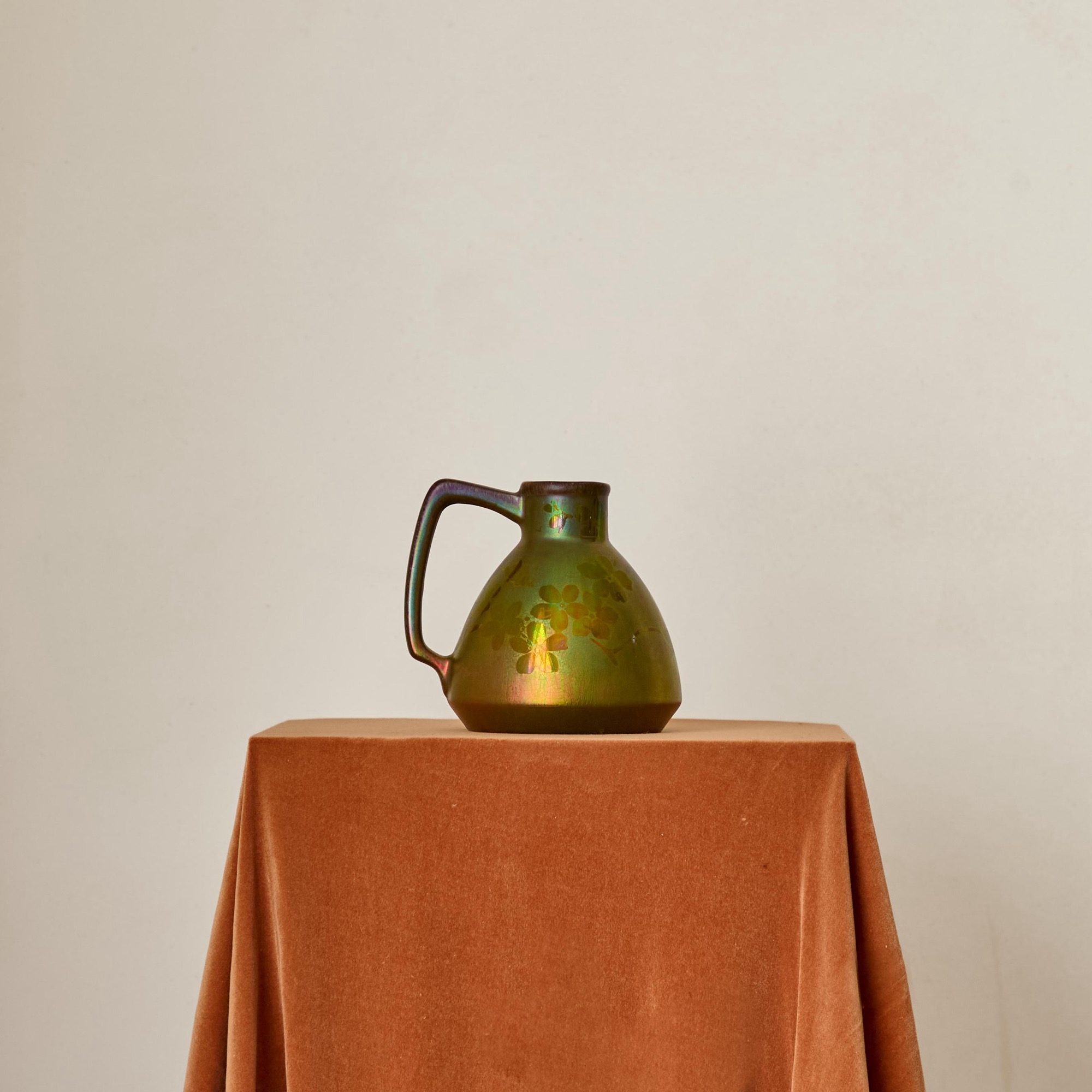 The conical form with a narrow neck and a handle, all with an iridescent glaze decorated with a Clematis motif and signed.
