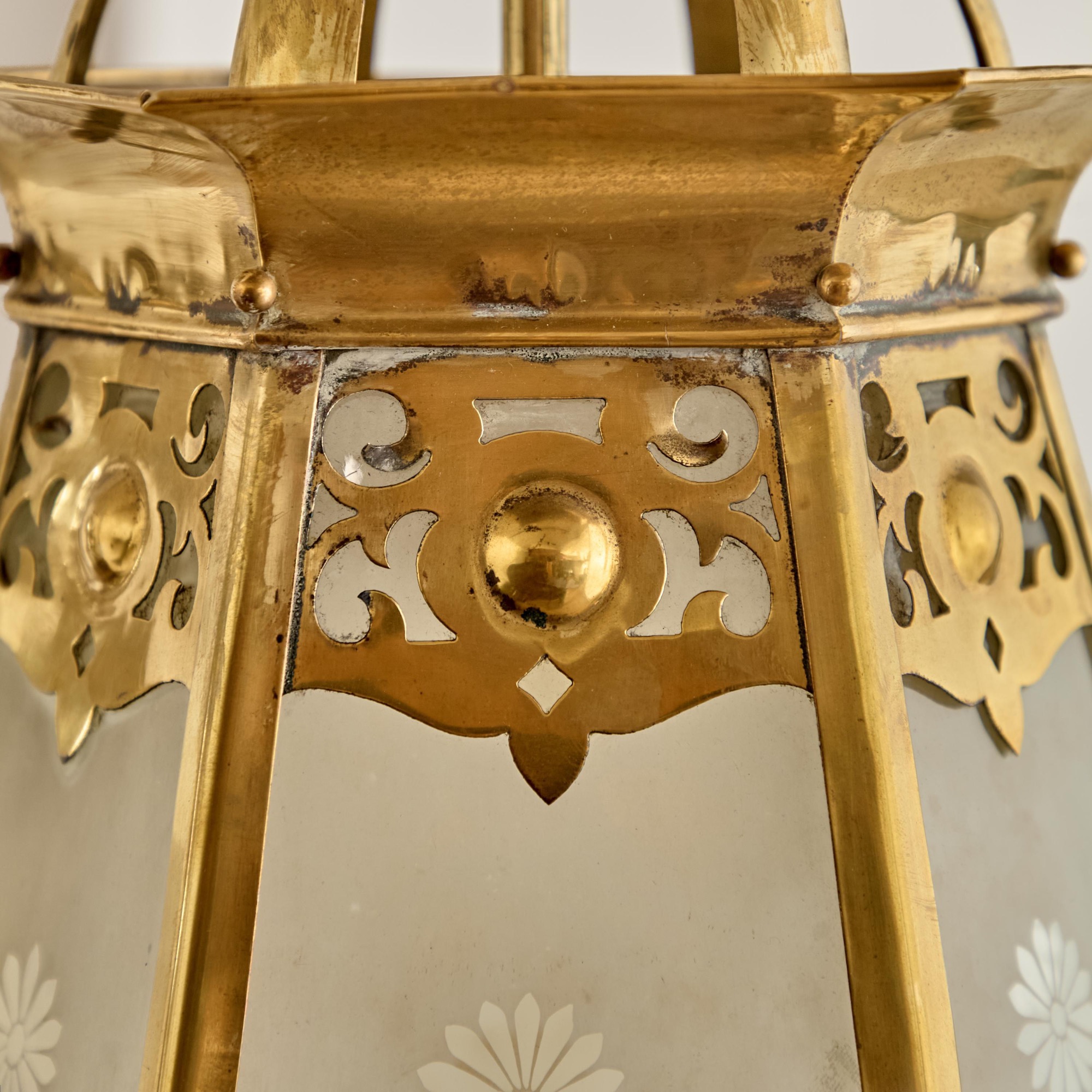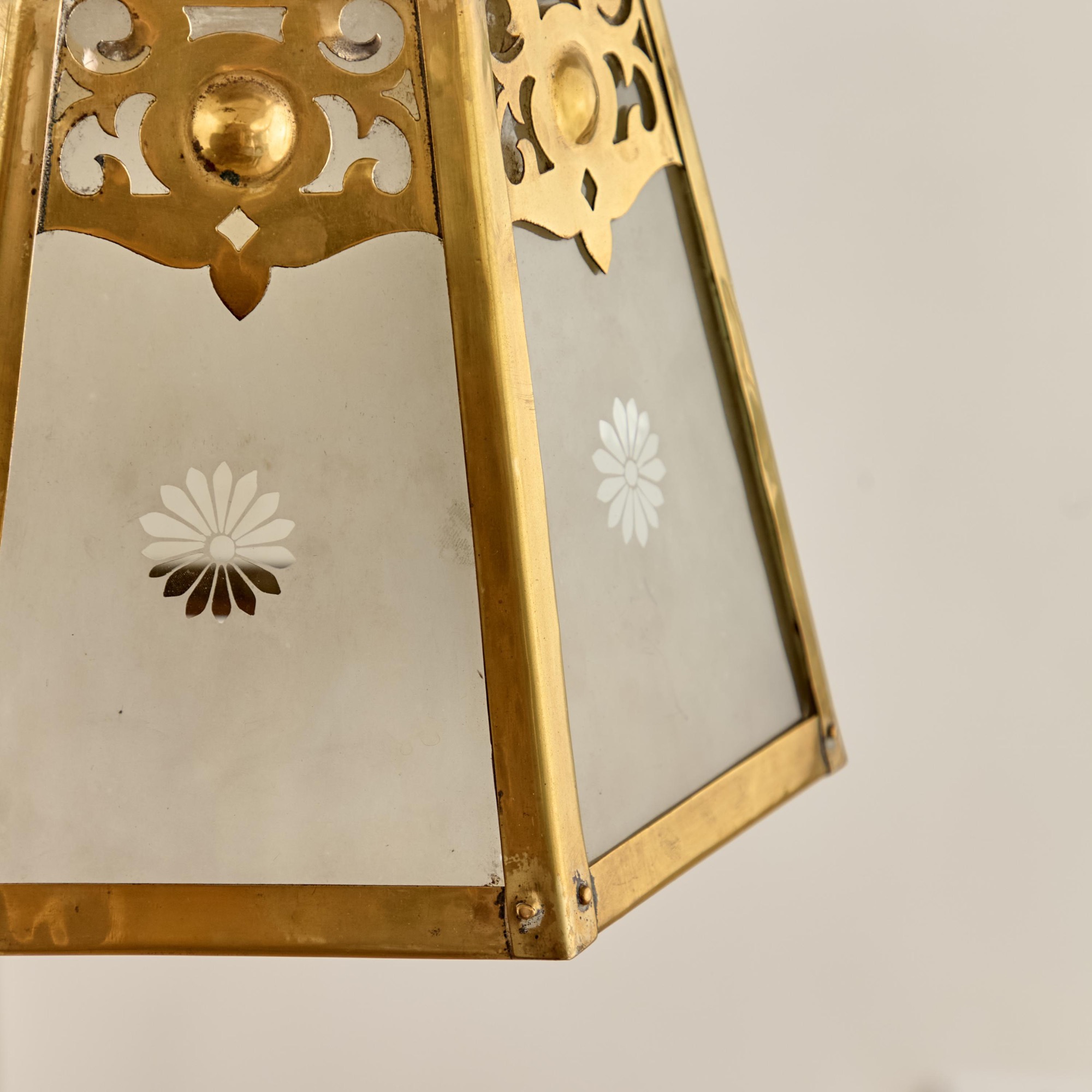 The tapered hexagonal body with frosted glazed panels, each with a clear patera motif below pierced arabesque brasswork, with a flared collar and arched superstructure.