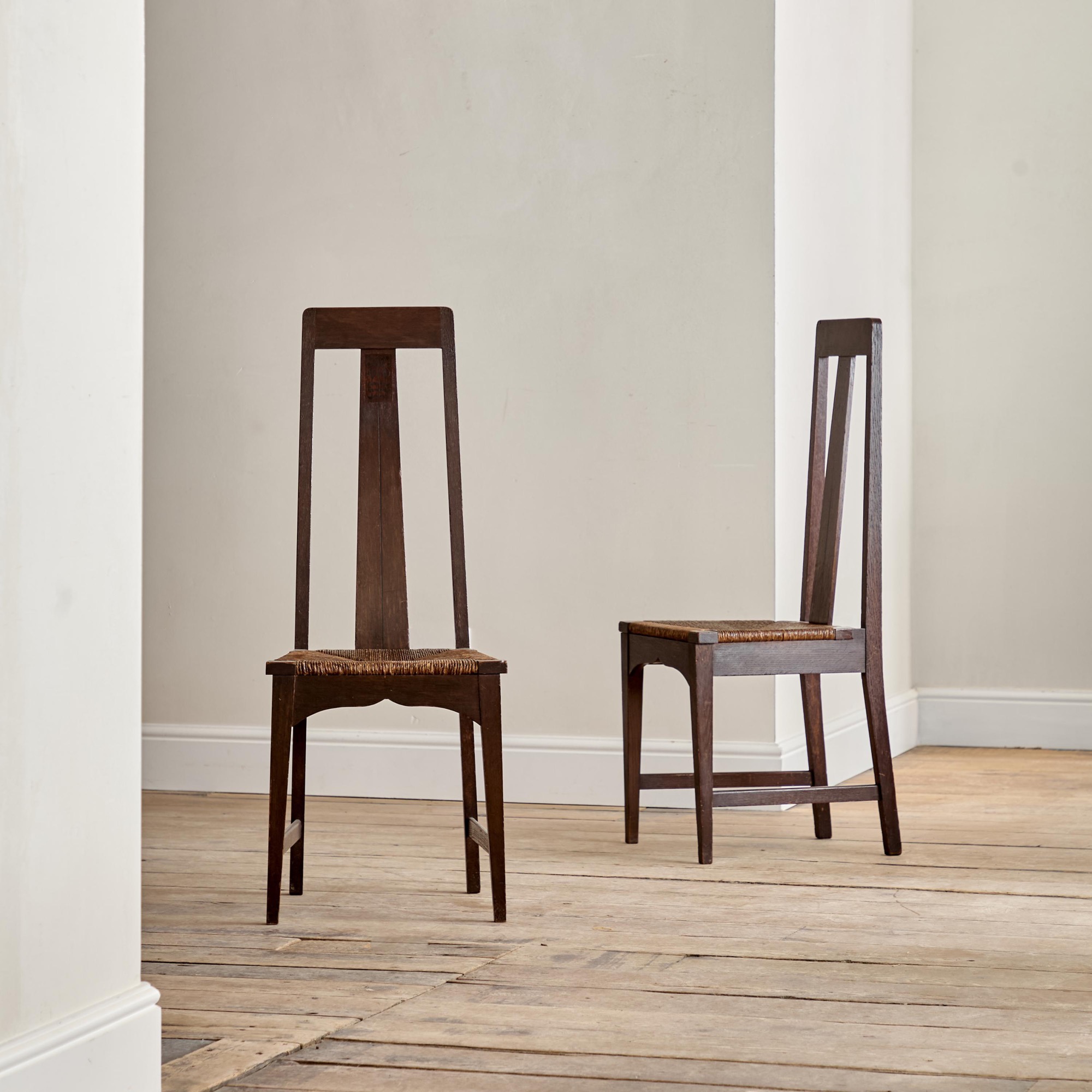 - A pair of Arts and Crafts stained oak high back side chairs