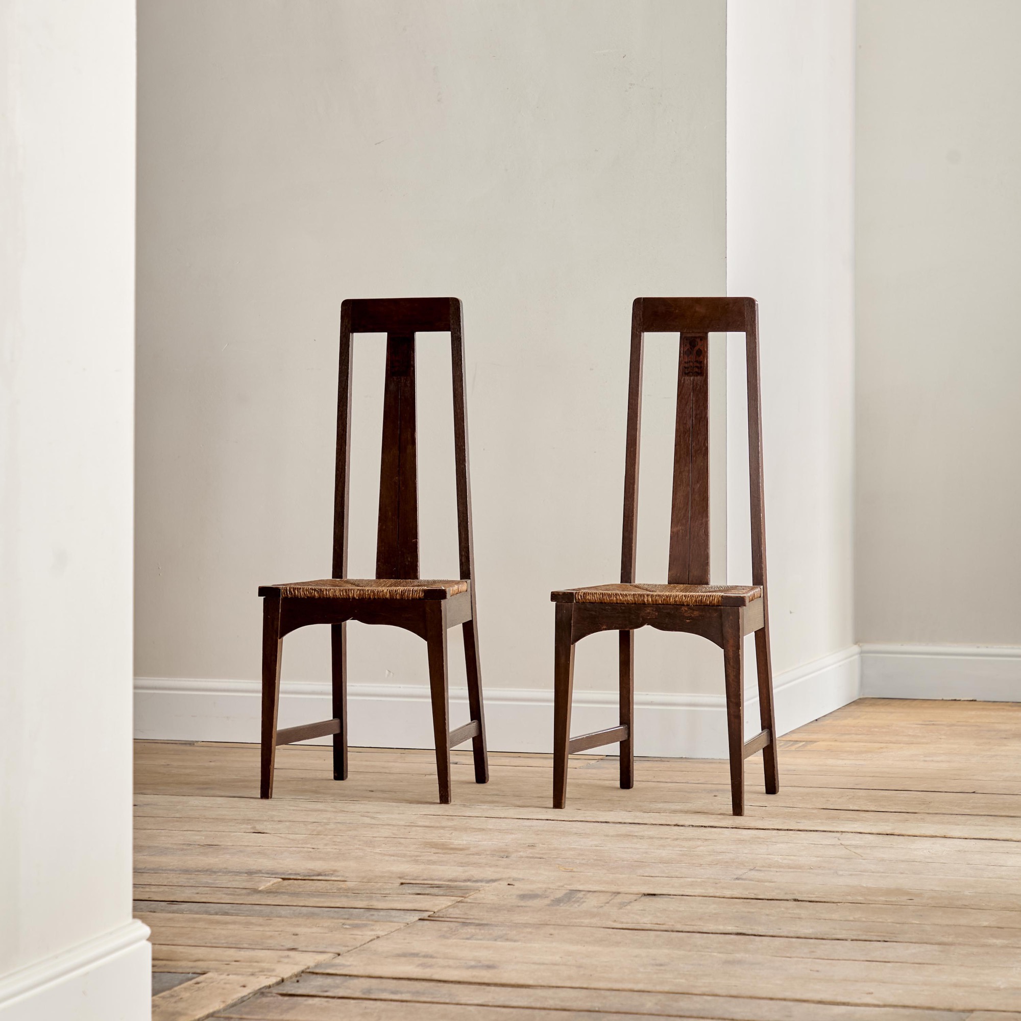 Each with a narrow high back and a raked central splat with ebony inlay, with the original rush seat above an ogee front apron on tapered square section legs.