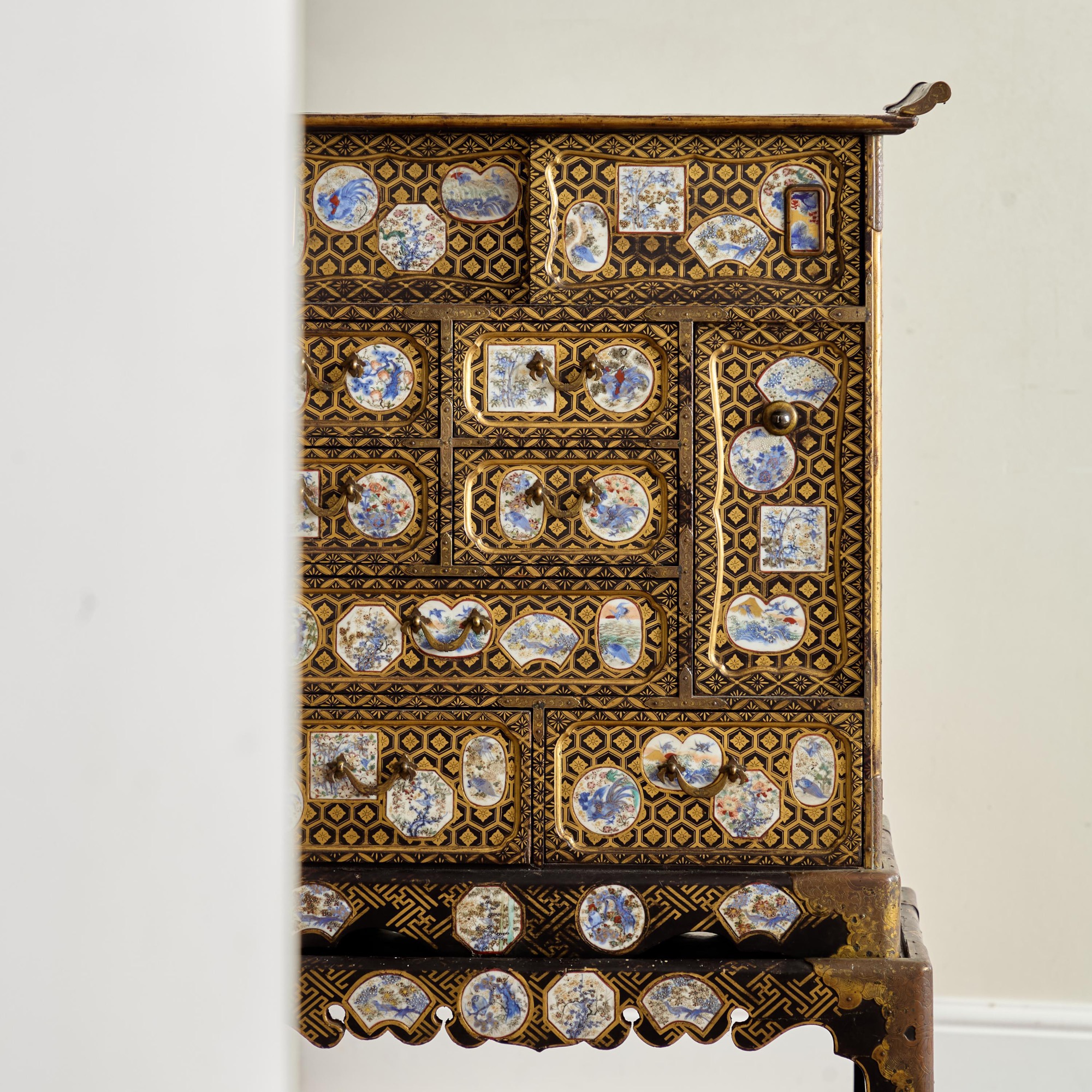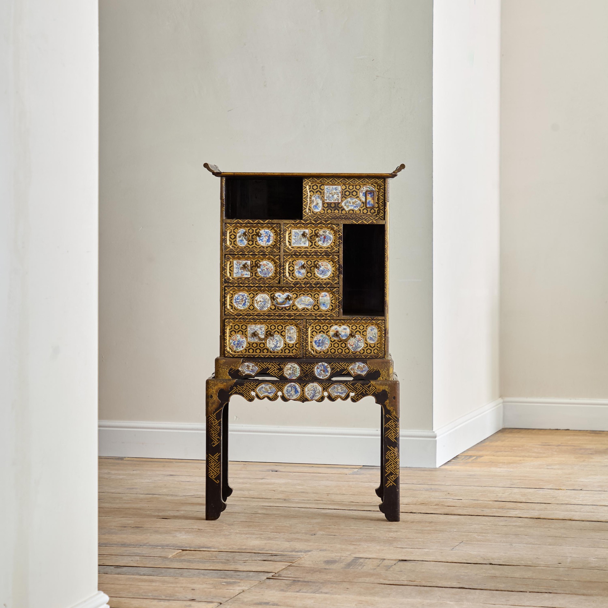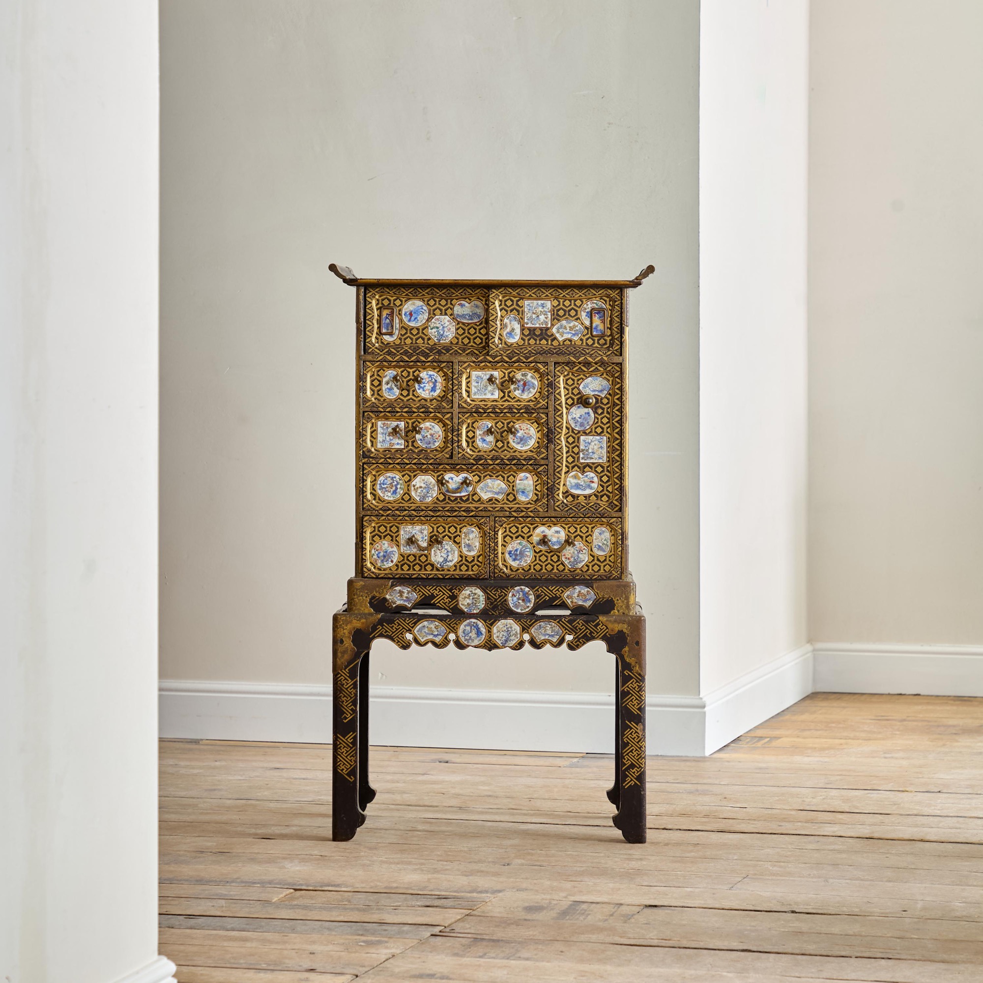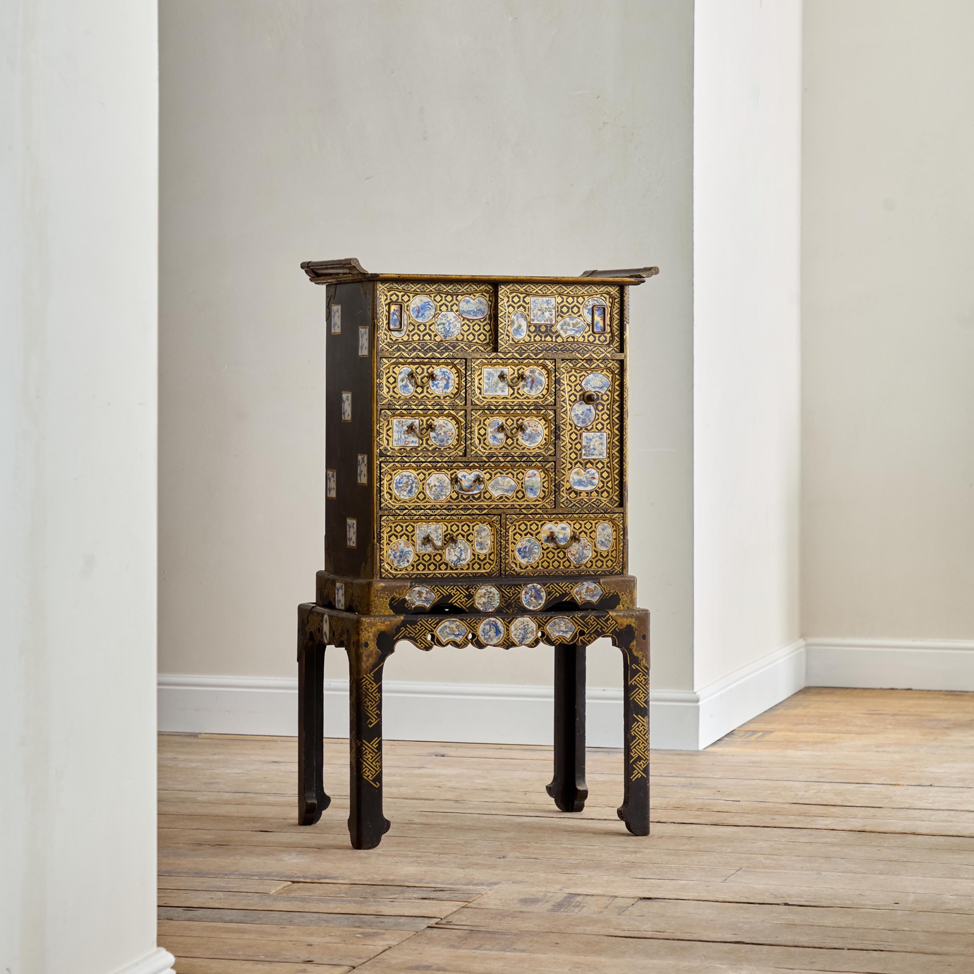 Comprising a cabinet with an assortment of drawers and cupboards decorated with gilt geometric motifs on a black lacquer ground, and inlaid with imari porcelain tiles in various shapes. The back and sides with square blue and white porcelain tiles inlaid into the black lacquer. All on a plinth base with gilt brass incised mounts and supported on the original stand with conforming decoration.