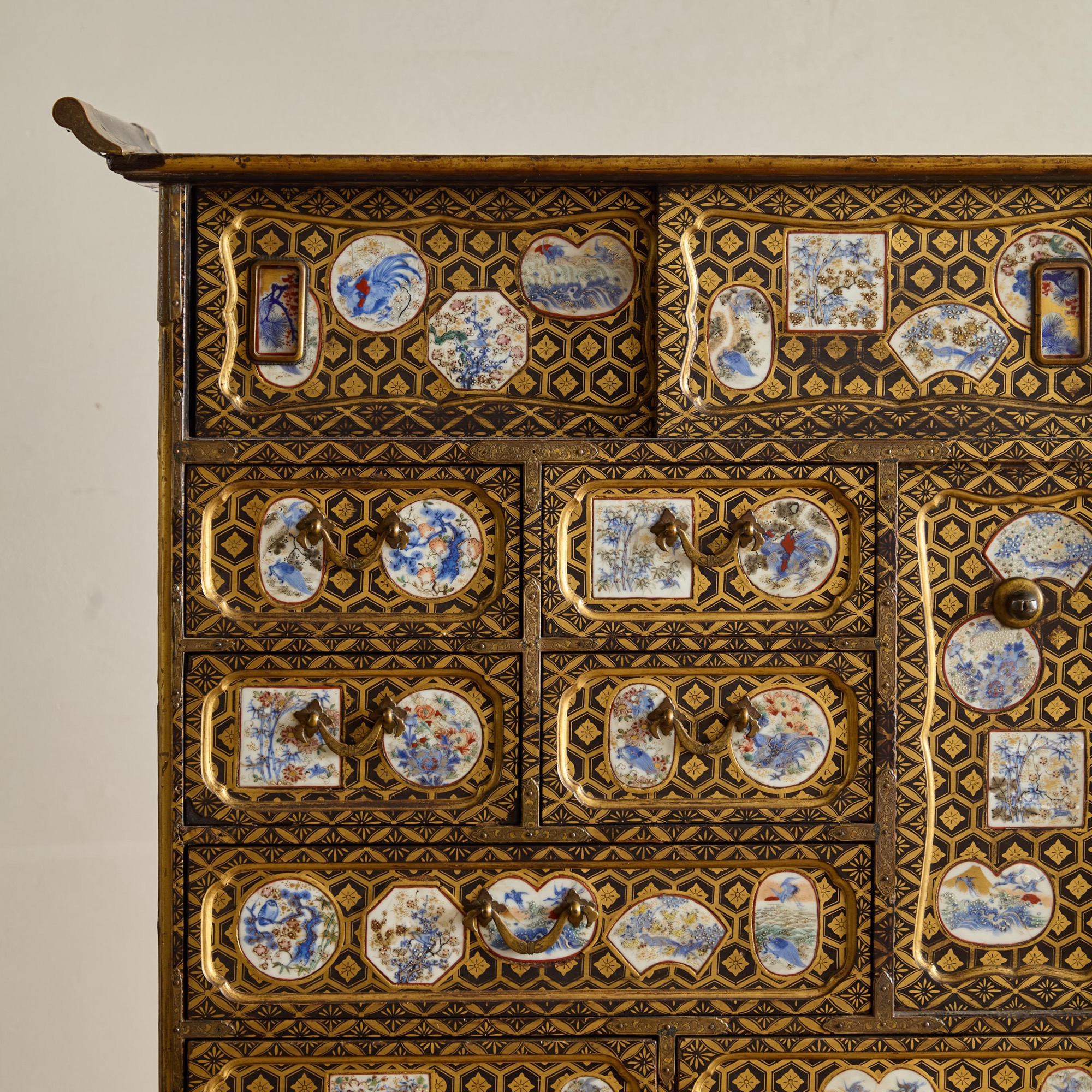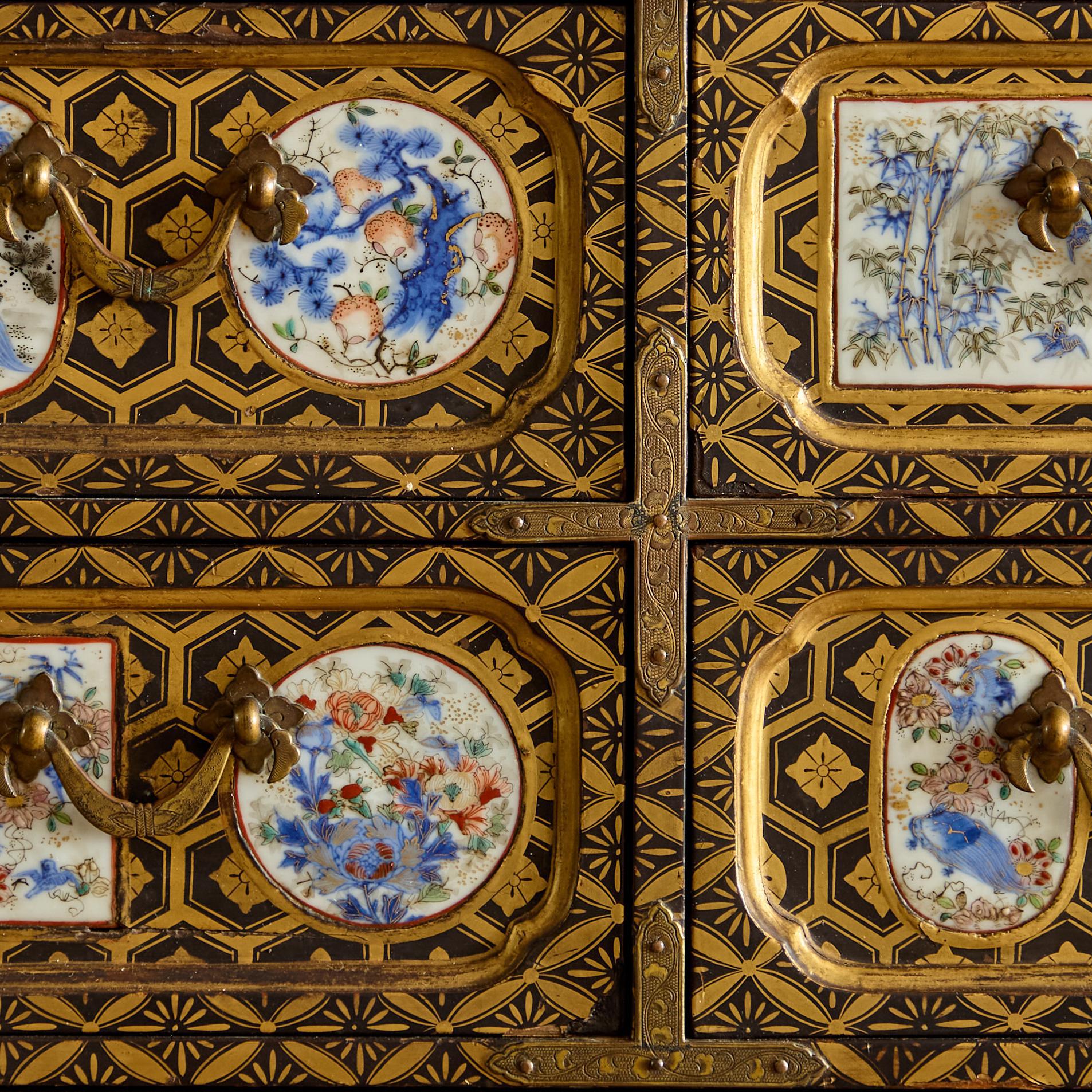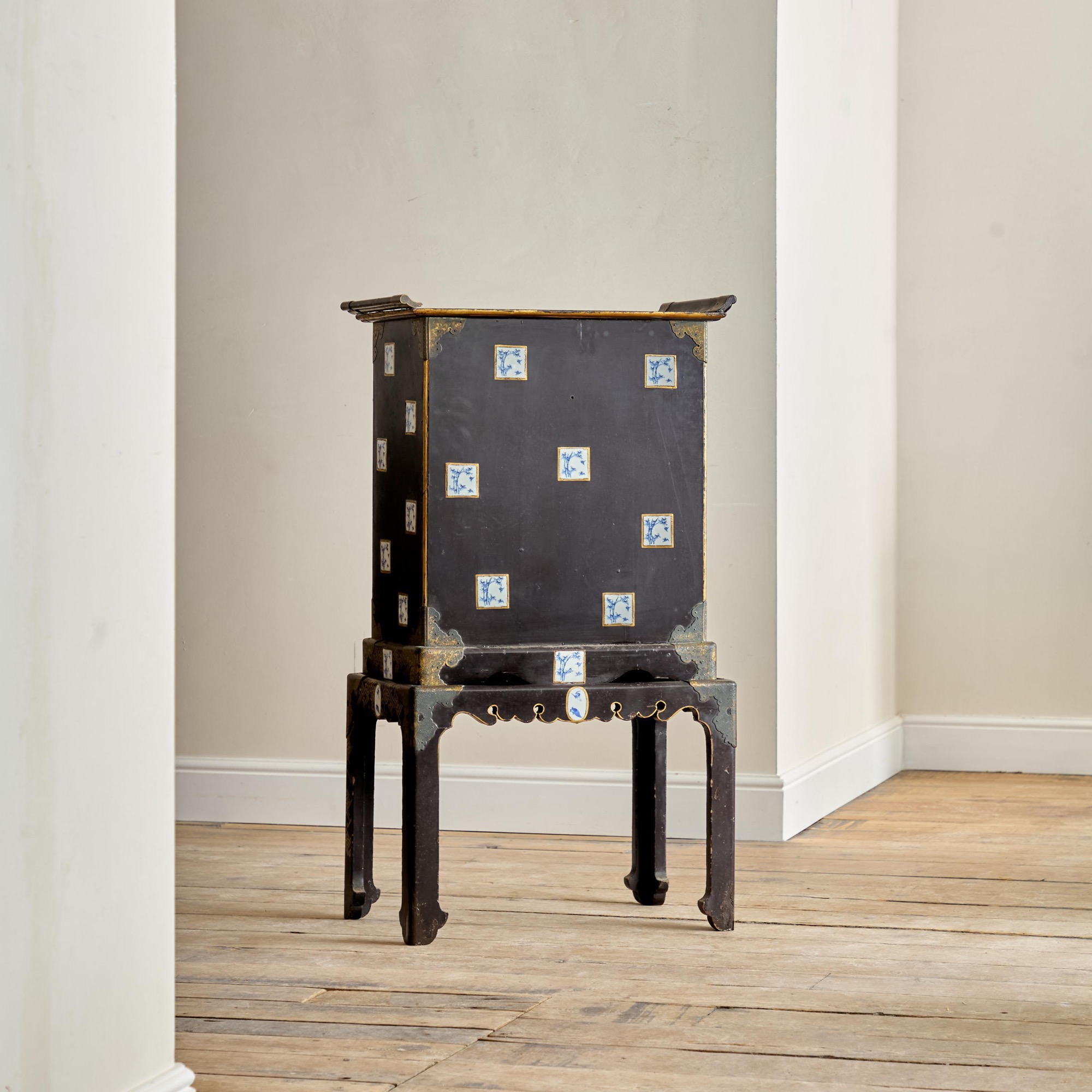 Comprising a cabinet with an assortment of drawers and cupboards decorated with gilt geometric motifs on a black lacquer ground, and inlaid with imari porcelain tiles in various shapes. The back and sides with square blue and white porcelain tiles inlaid into the black lacquer. All on a plinth base with gilt brass incised mounts and supported on the original stand with conforming decoration.