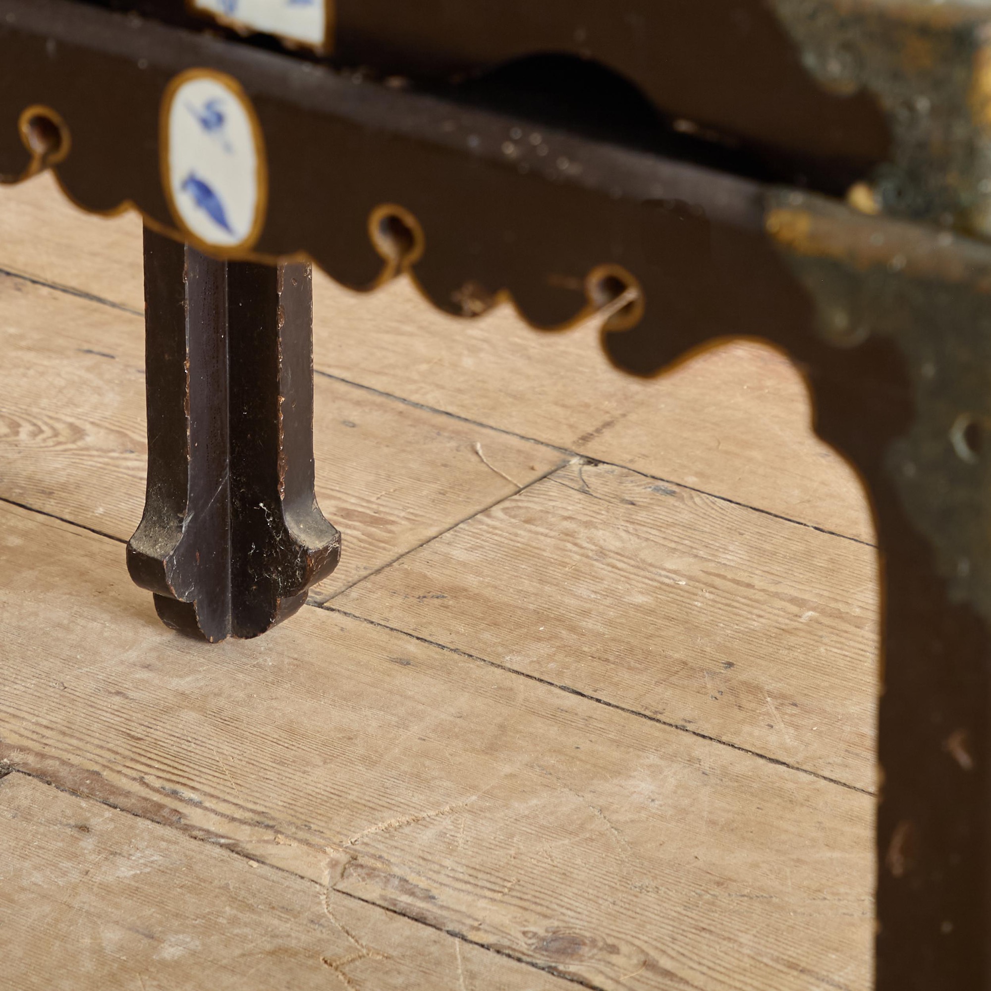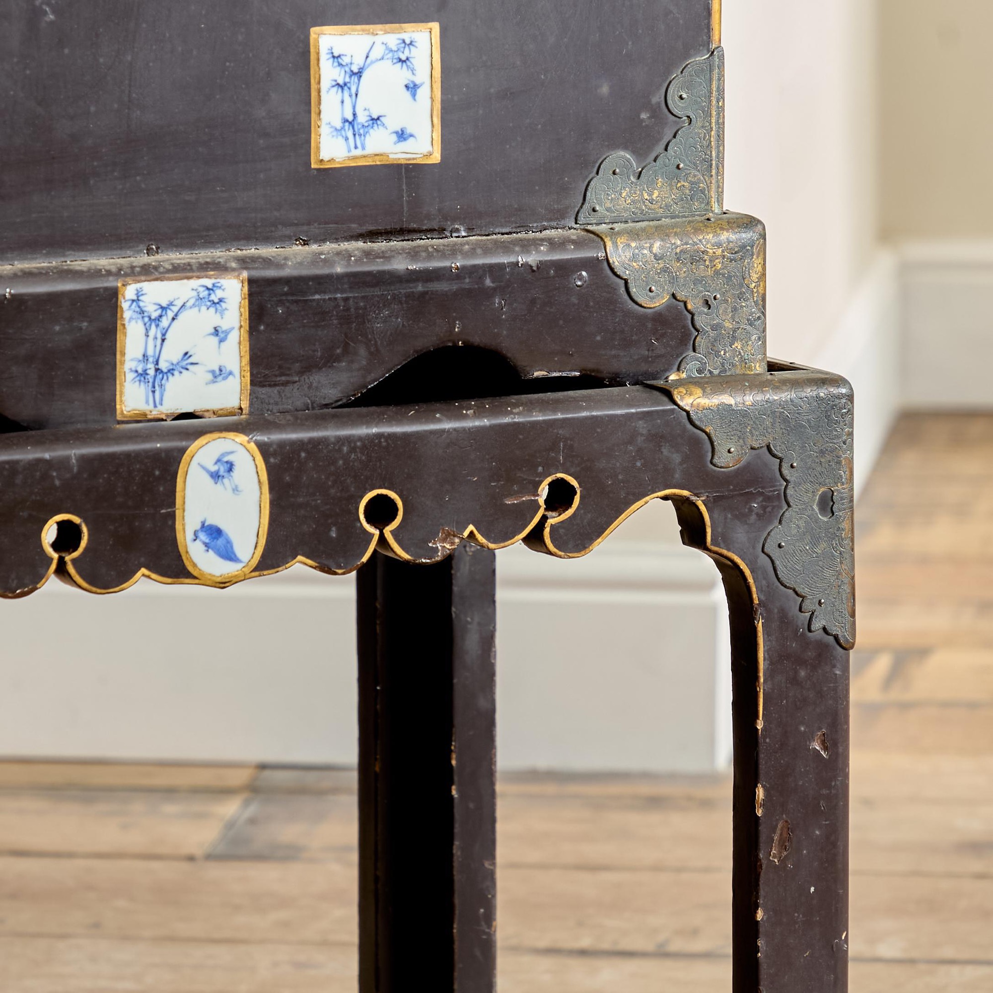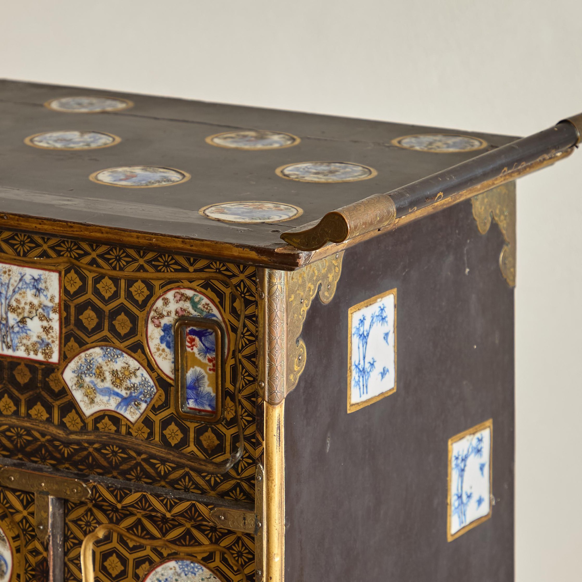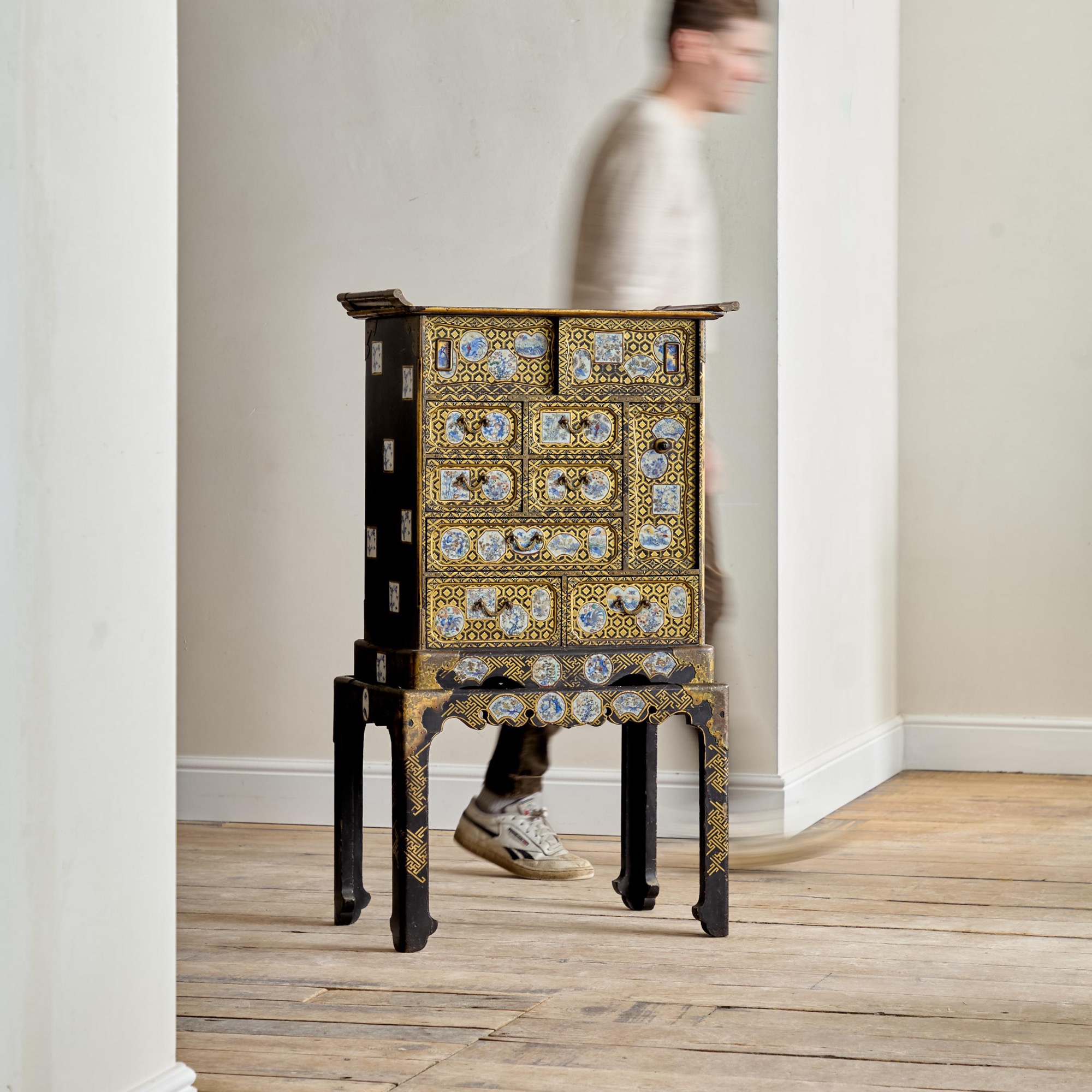 Comprising a cabinet with an assortment of drawers and cupboards decorated with gilt geometric motifs on a black lacquer ground, and inlaid with imari porcelain tiles in various shapes. The back and sides with square blue and white porcelain tiles inlaid into the black lacquer. All on a plinth base with gilt brass incised mounts and supported on the original stand with conforming decoration.