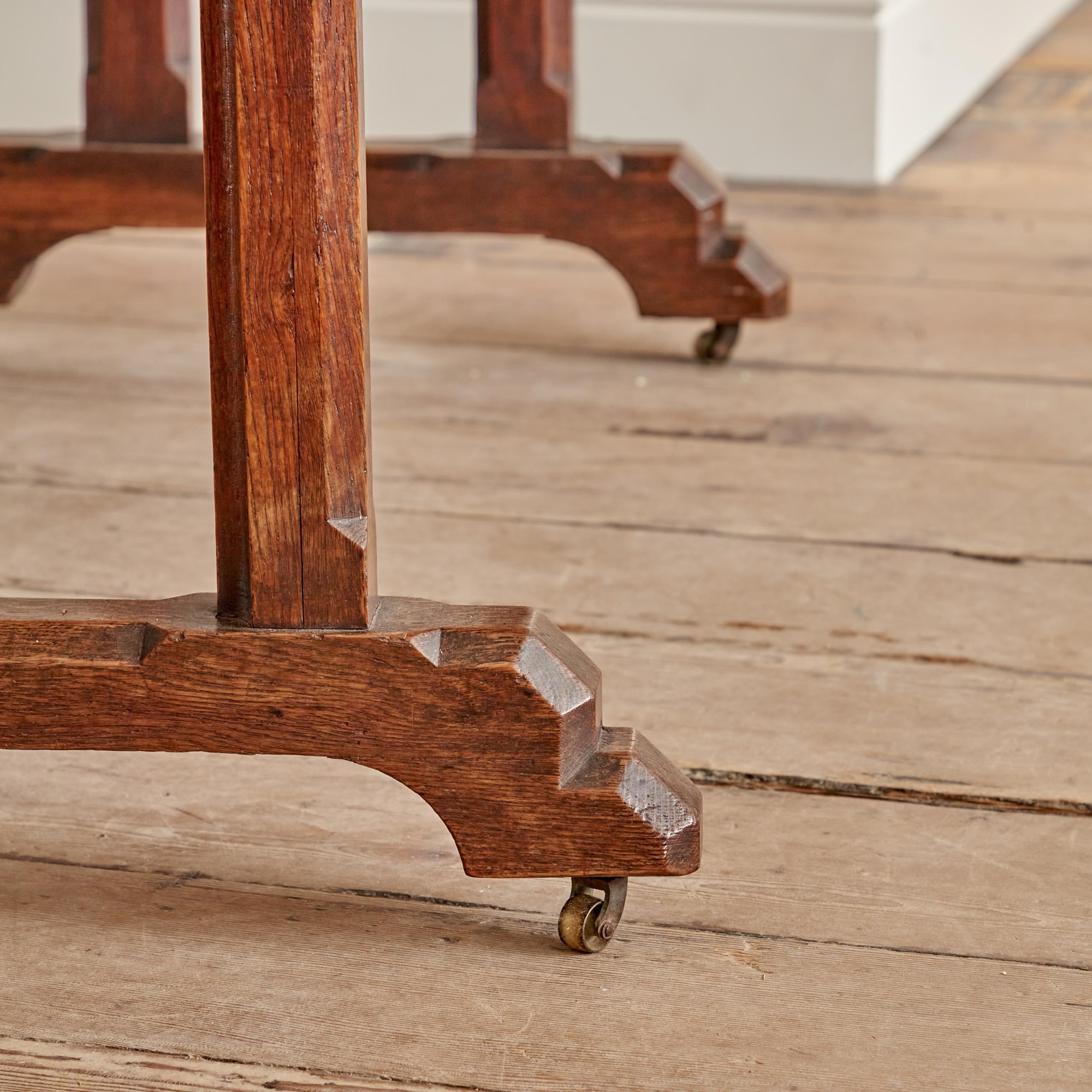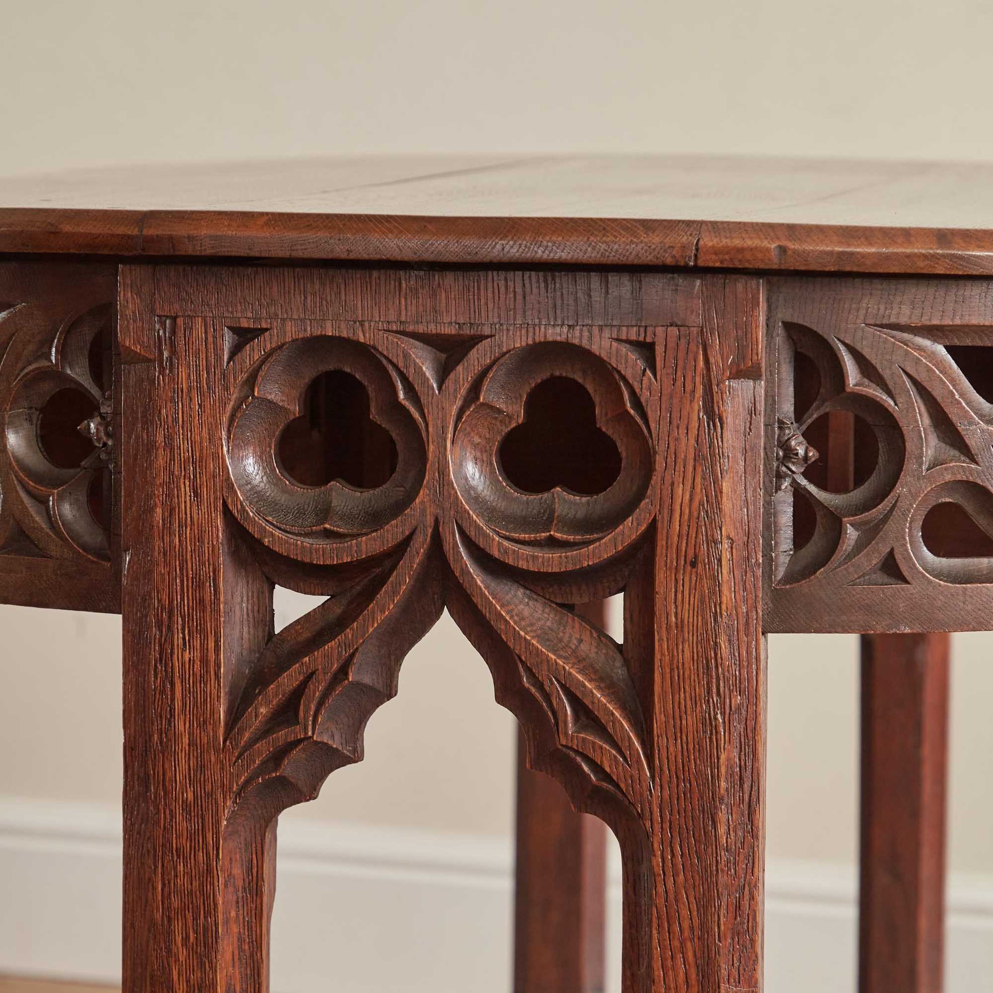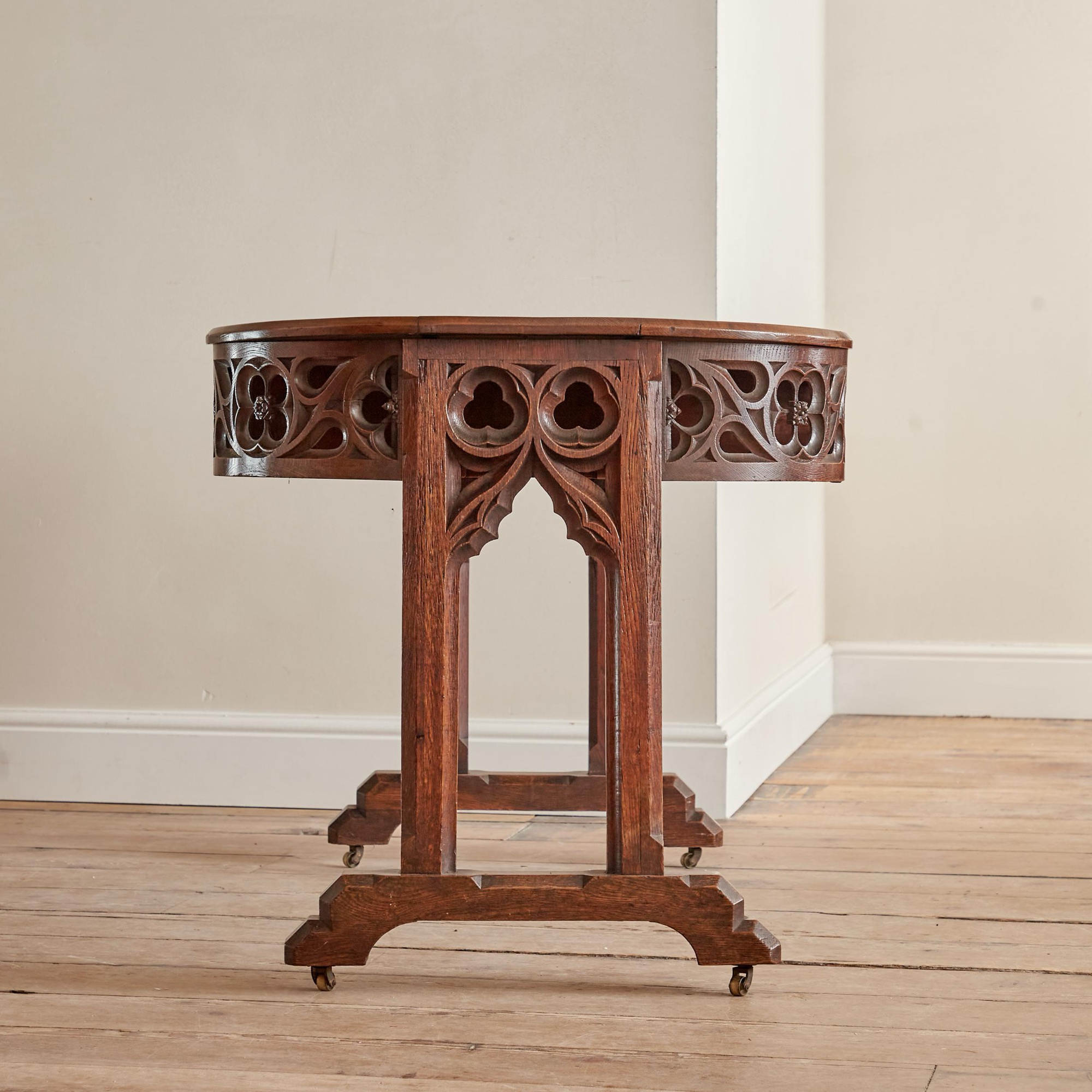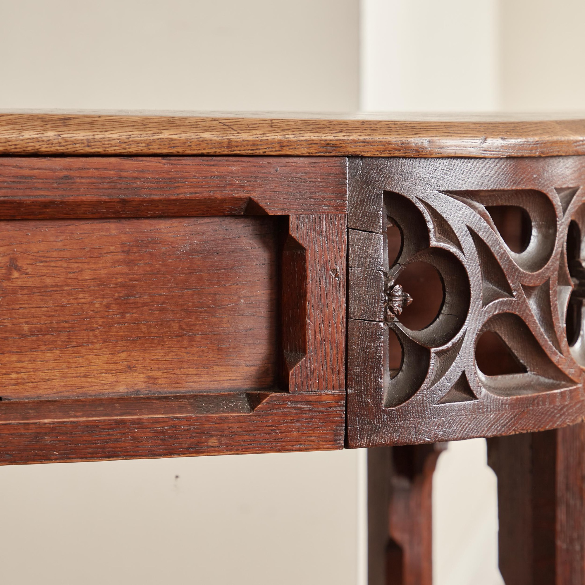 The oblong plank top above a deep frieze with pierced gothic tracery to the ends and corners flanking central recessed panels, one being a frieze drawer. All on champhered trestle ends and arched plinth feet with castors.
