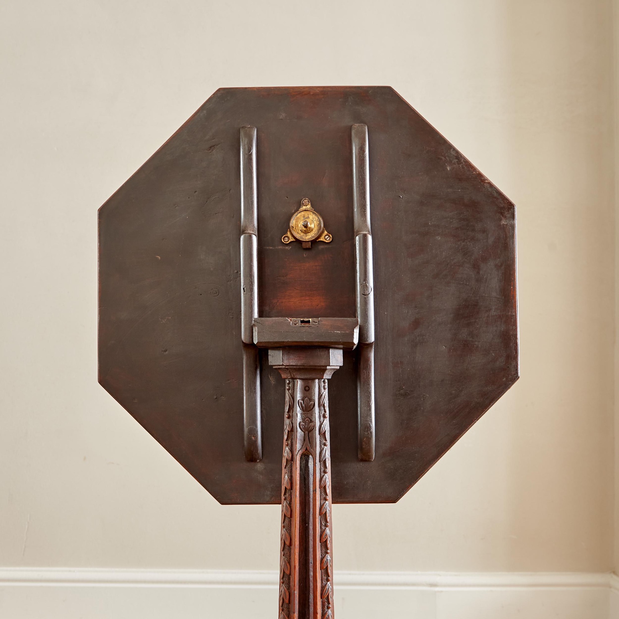The octagonal single piece tilt top with a fine pierced gallery on an unusual pierced column carved with trailing husk decoration supported by an elegant scrolling tripod base, each leg with carved fish scale sides and floral carving to the shoulders leading to scrolling feet. All with the original small brass castors.